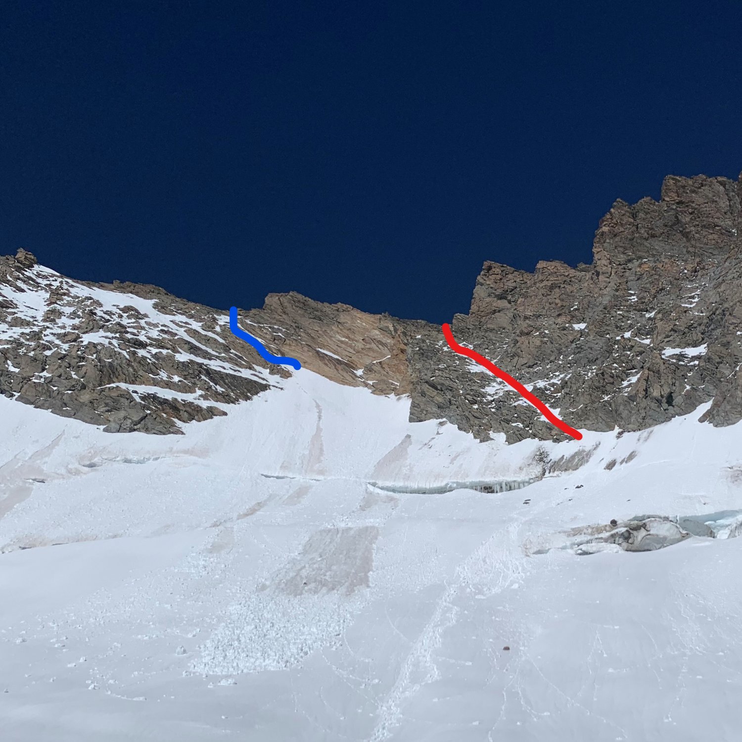 Anscheinend wird das nördliche Couloir im Winter begangen (blau) - möglicherweise auch im Sommer. Hier gibt es oben ebenfalls einen improvisierten Abseilstand. Wenn das zum Sattel hochziehende Firnfeld gangbar ist, scheint dies die sicherere Alternative. Dies kann ich allerdings nur eingeschränkt beurteilen, da wir die andere Variante wählten. Ich vermute zudem, dass das hochziehende Firnfeld ebenfalls sehr bald aper sein wird und dann weder im Aufstieg noch im Abstieg leicht möglich ist.