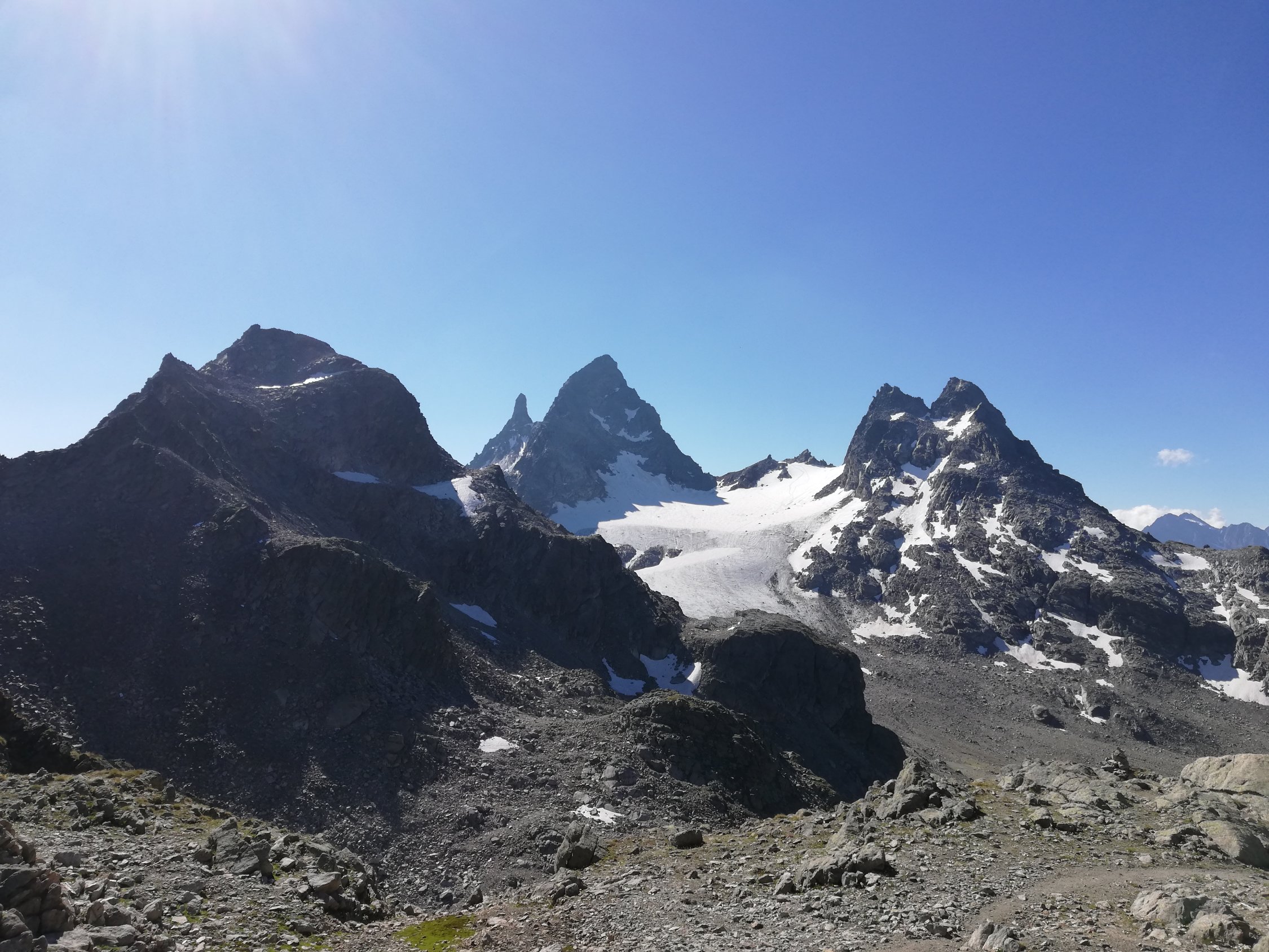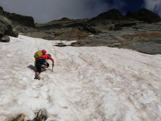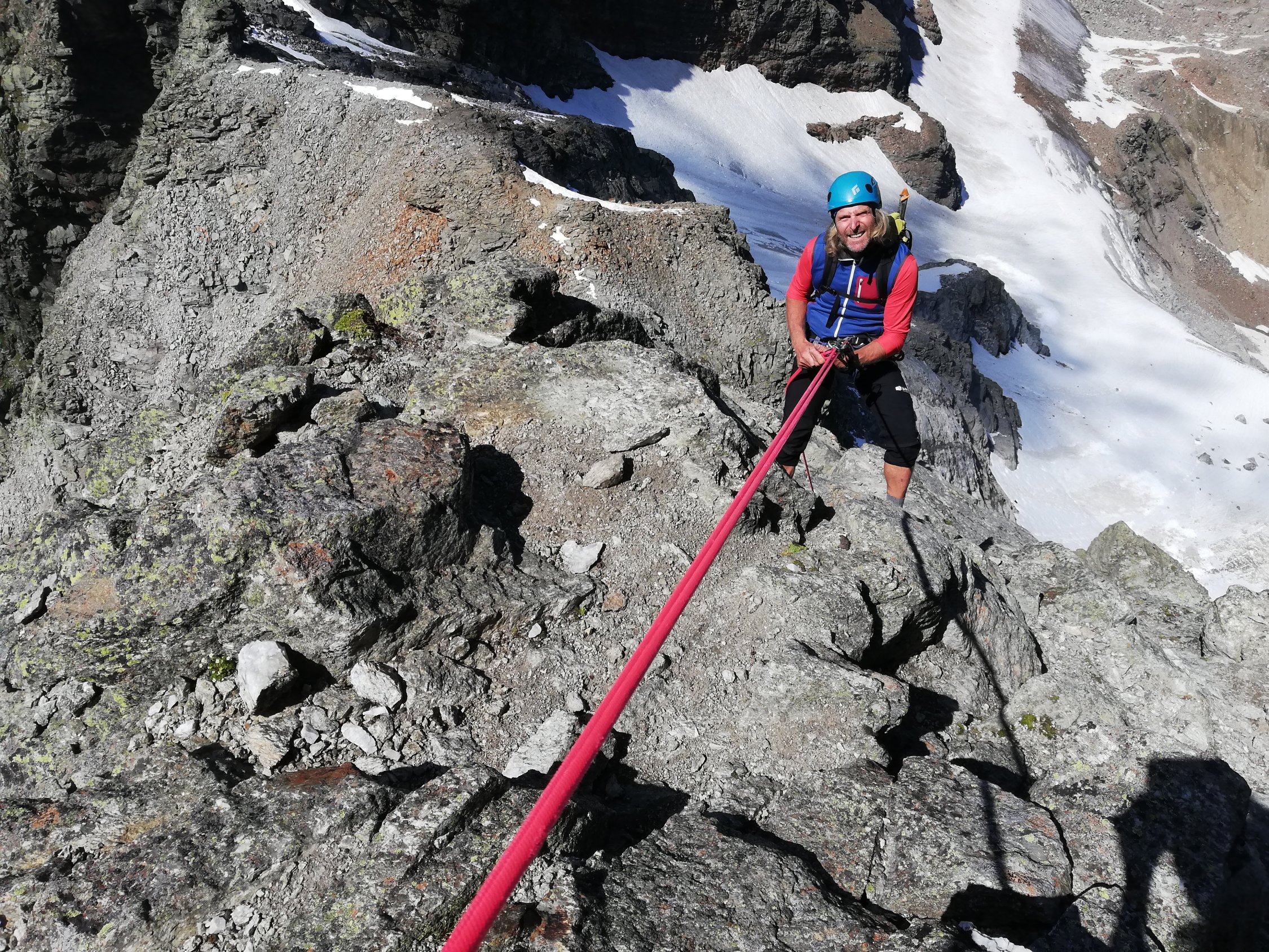 Nach dem Abseilen vom Grossen Seehorn auf Schnee zum Gletscher. Heute brauchten wir keine Steigeisen, der Schnee war weich. Aber das kann bei anderen Temperaturen gleich anders sein. Steigeisen und Pickel gehören auf jeden Fall in den Rucksack.