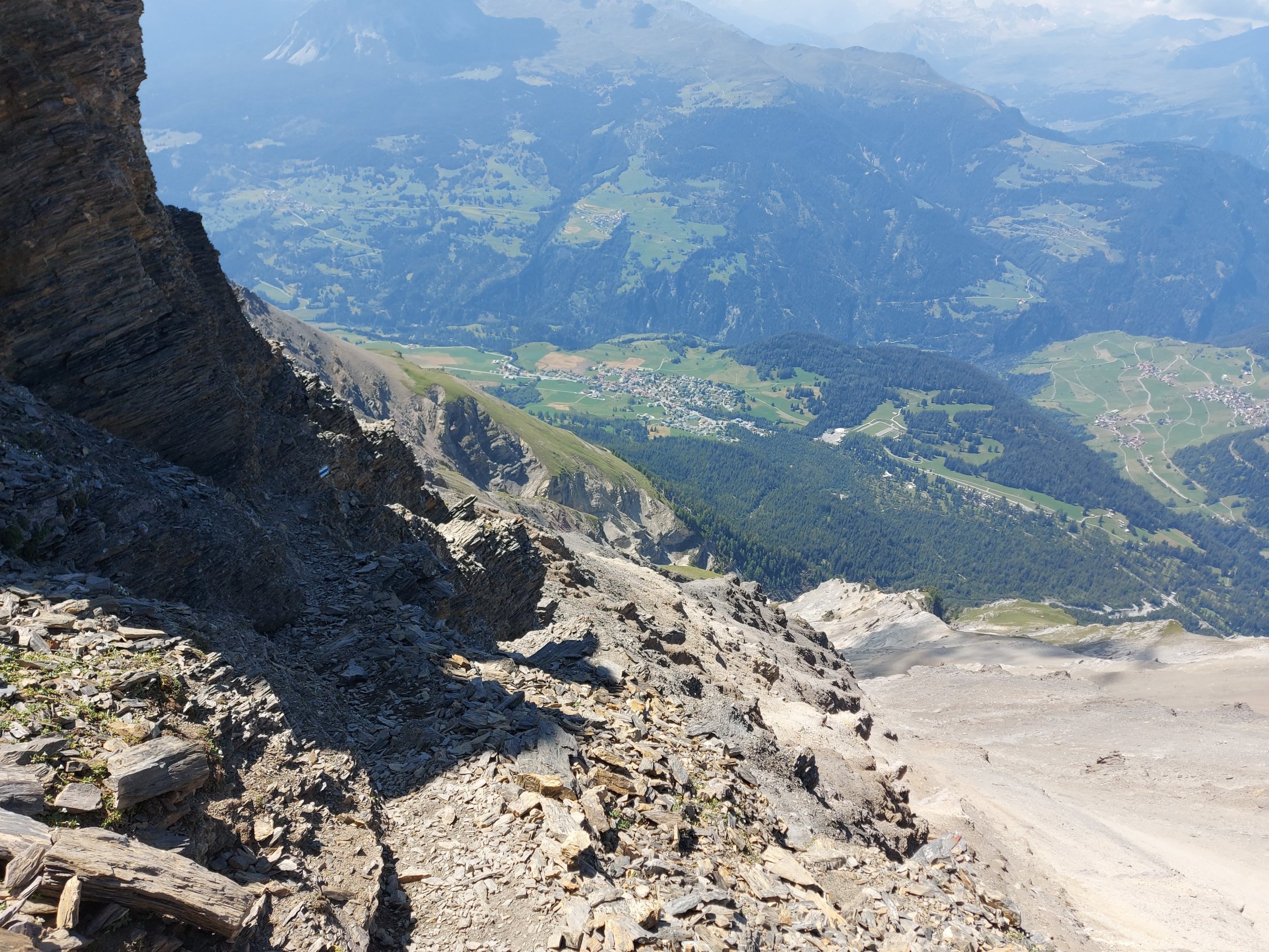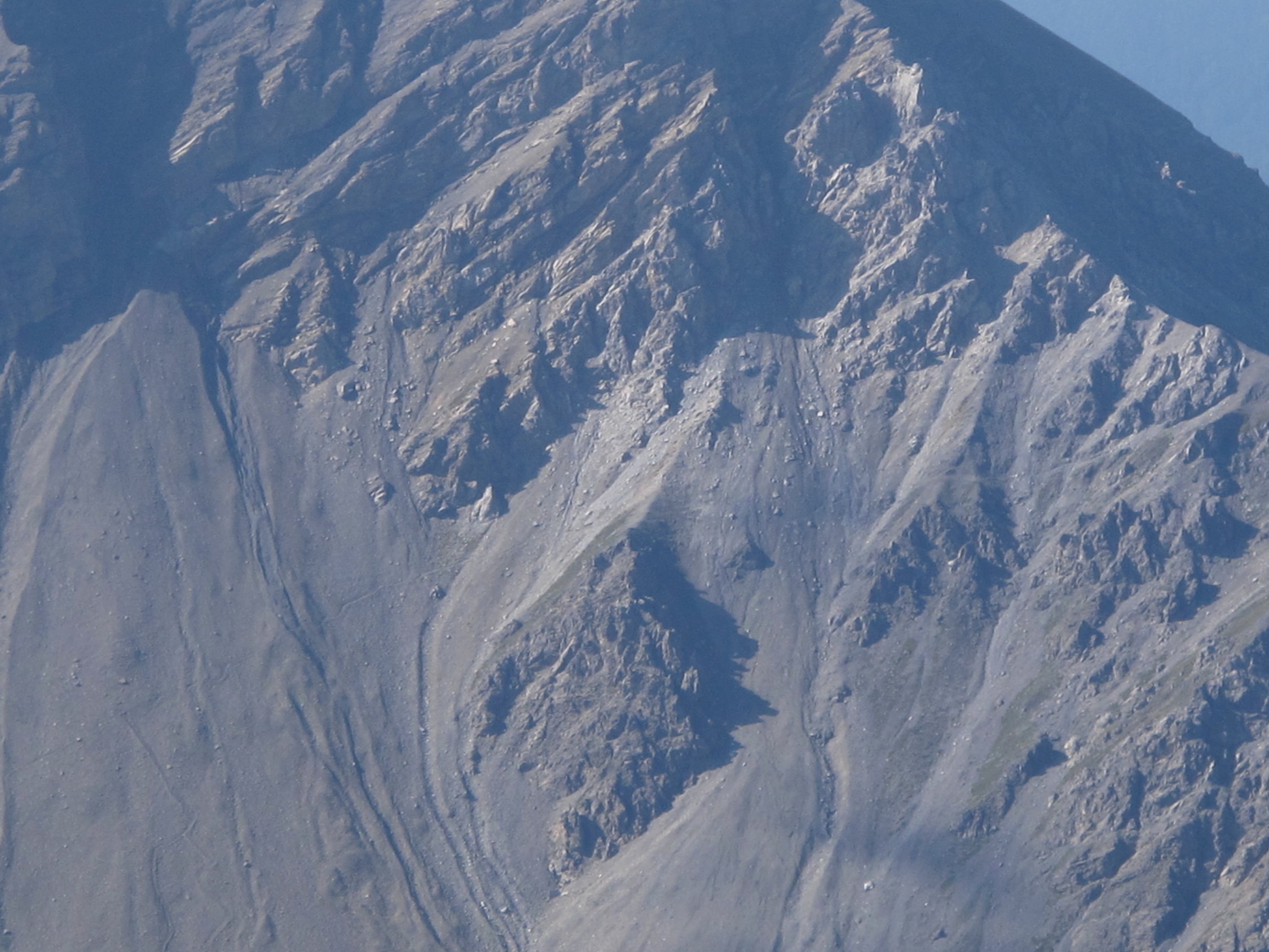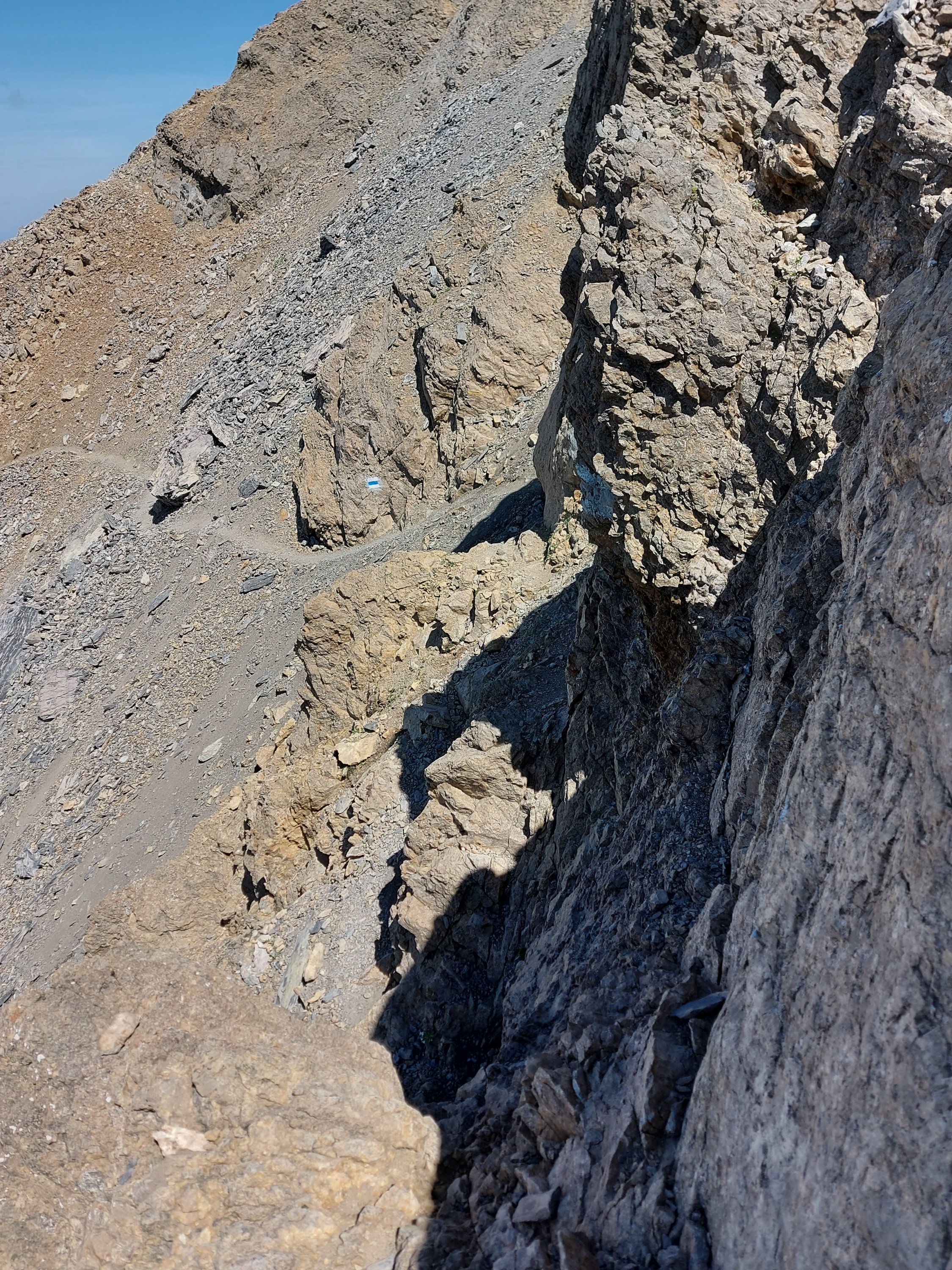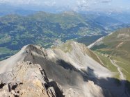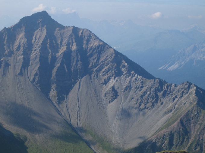 Abstieg: Vom Gipfel auf der üblichen weisssblauweiss markierten Route bis etwa 120m vor P. 2546m. Sehr deutlich erkennbar: Nach E zweigt ein Pfad ab. Diesem Pfad (vgl LK!) folgen bis auf ungefähr 2350m, dann einem auf der LK nicht eingetragenen Geröllpfad hinunter bis zu P. 2243m, hier wieder auf die weissblauweiss markierte Route. Dieser Pfad ist eher leichter und vor allem bequemer als die weissblauweiss markierte Route. Einziger Nachteil ist eine latente Steinschlaggefahr. Heute kein Steinschlag festgestellt.