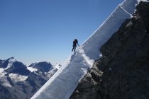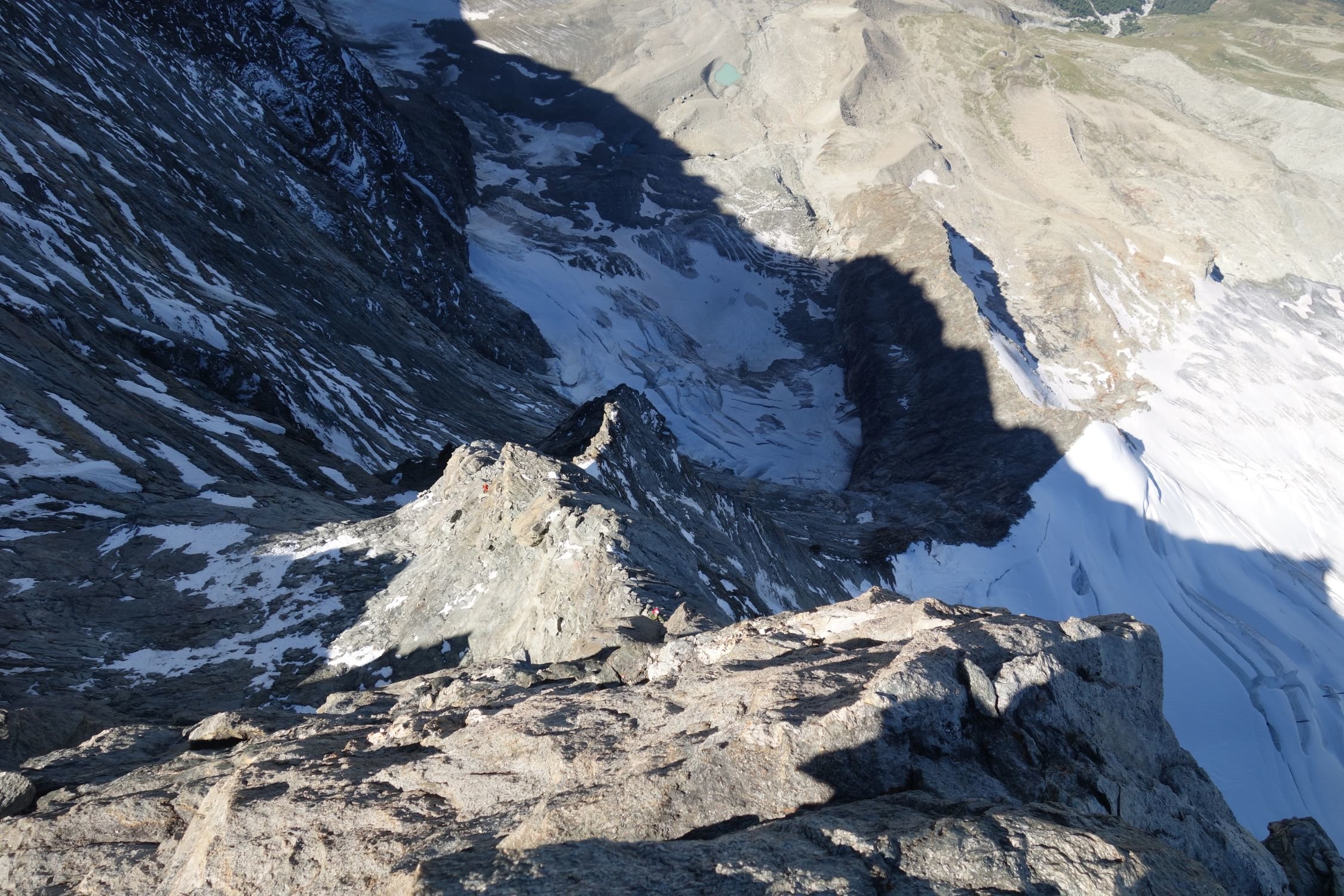 Beste Verhältnisse: Turtmanngletscher (noch) gut eingeschneit, Fels am Grat trocken und schneefrei, Firngrat ein Fuss breit, aber fest und noch nicht von der Sonne unterhöhlt. Firnfelder im Abstieg bestens zum Abfahren mit Bergstiefeln geeignet.