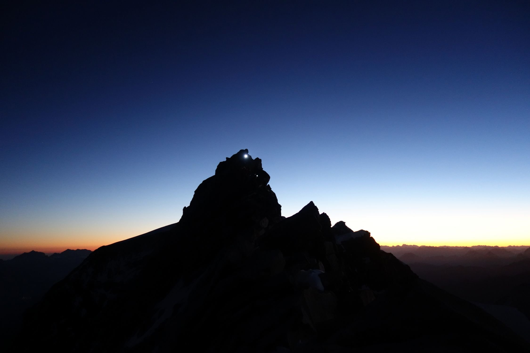 Wir haben bei der Tracuit-Hütte biwakiert und waren daher mit Leichtausrüstung unterwegs. Da heute ja fast jeder - unabhängig vom Gelände - mit Steileis-Leichtausrüstung unterwegs ist, möchte ich anmerken, dass mir mein Petzl Gully selbst am steilen Nordgrat zu kurz war um als Stützpickel verwendet werden zu können. Ein ordentlicher Dorn fehlt ebenfalls, von der T-Norm (nie gehört? -> googlen!) ganz zu schweigen, und wie bei "normalen" Pickeln üblich reicht allein die Schwerkraft nun auch nicht mehr aus um die Haue in den Firn fallen zu lassen. Oh, modernes Zeugs, ab jetzt wieder mit meinen guten alten Führerpickel anno 1900.
