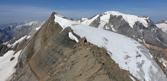 Top Verhältnisse, ab 8.30 Uhr beginnt der Schnee auf dem Gipfelgrat aufzuweichen. Auf dem Gipfelgrat befindet sich in Laufrichtung Hauptgipfel linkerhand eine Spalte.