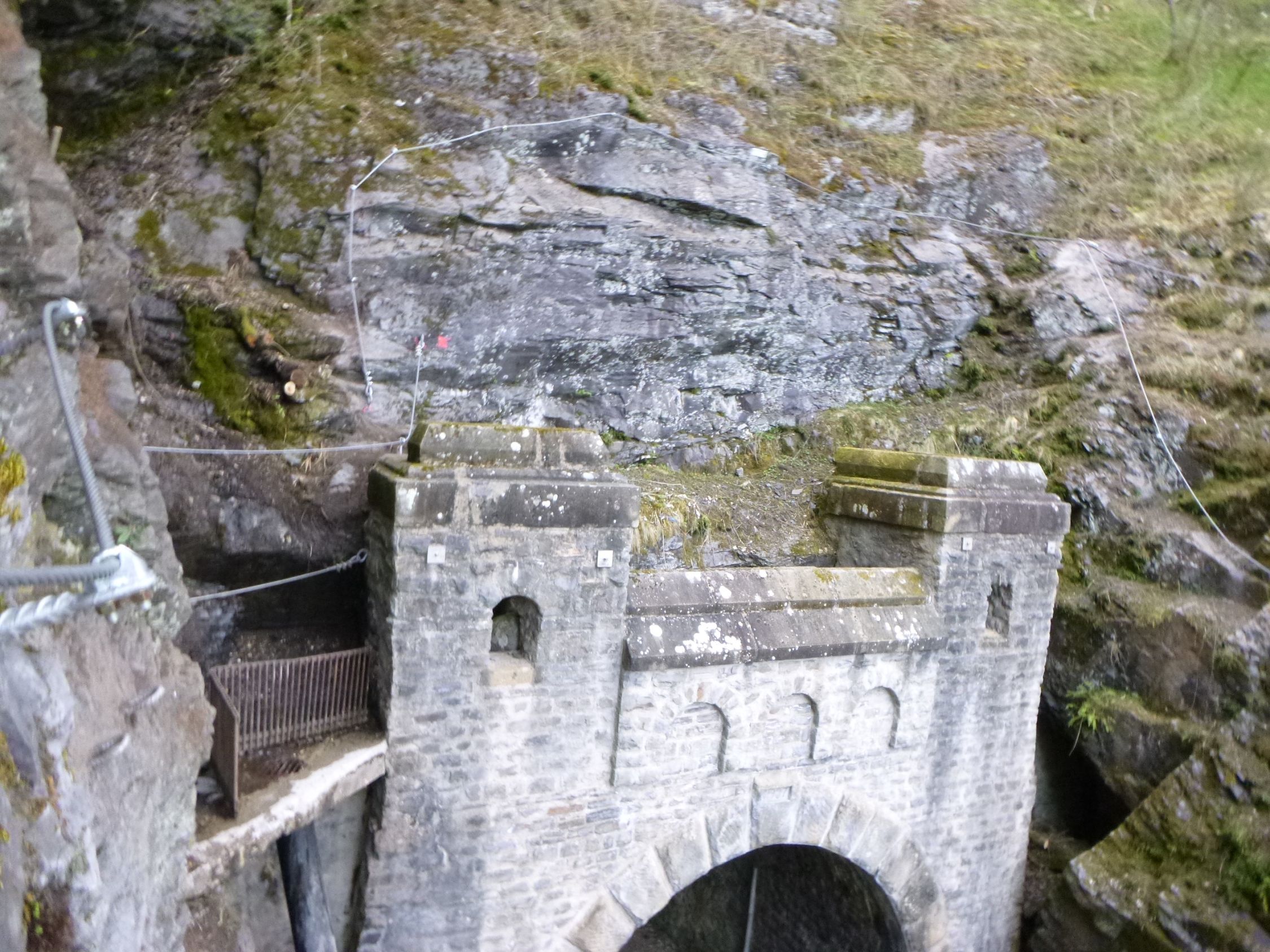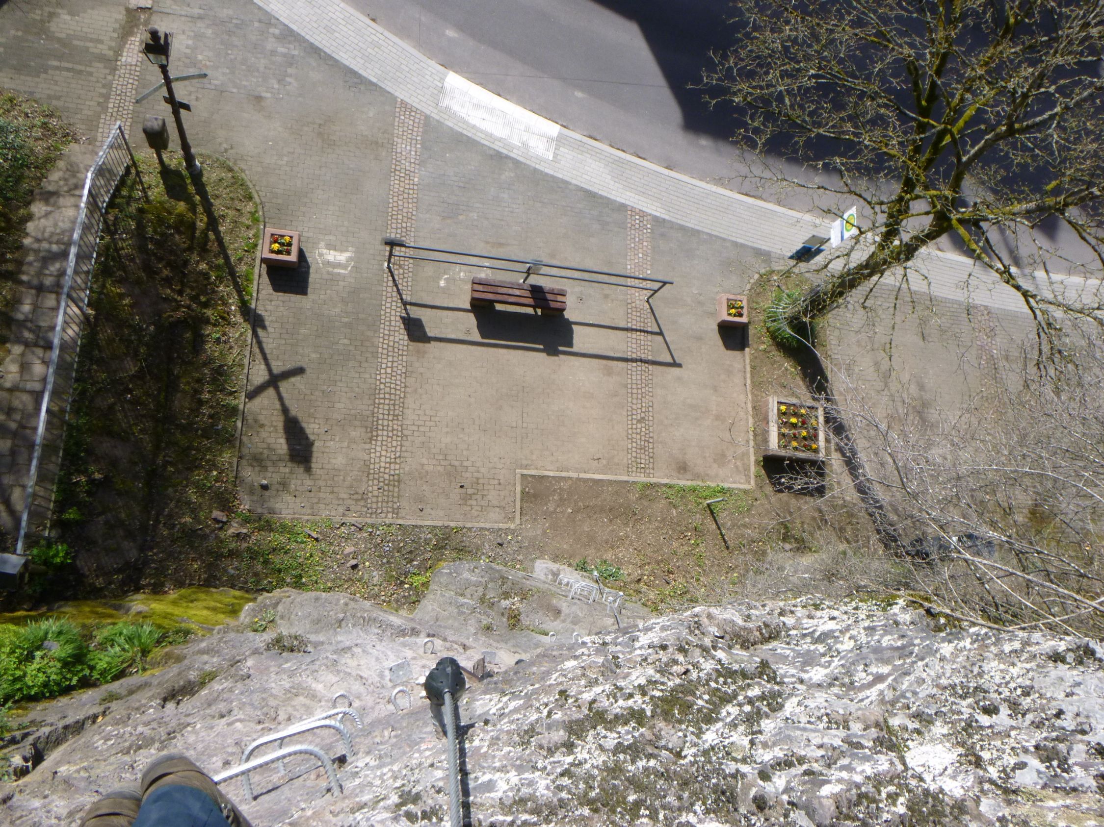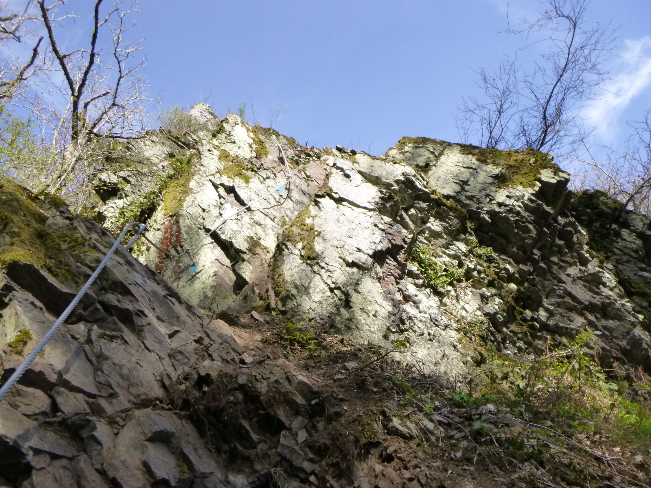 Das Doppeltor am Zustiegsweg zum Einstieg der KS-Passage an der Nordbastion war verschlossen und mit rot-weißem Flatterband versehen. Ich bin darum am Ende der Tour vom oberen Fenster des Geschützturmes, wo sich der Ausstieg befindet, die 20 m hinunter und wieder hinaufgeklettert. Der kurze Steig war in Ordnung.
