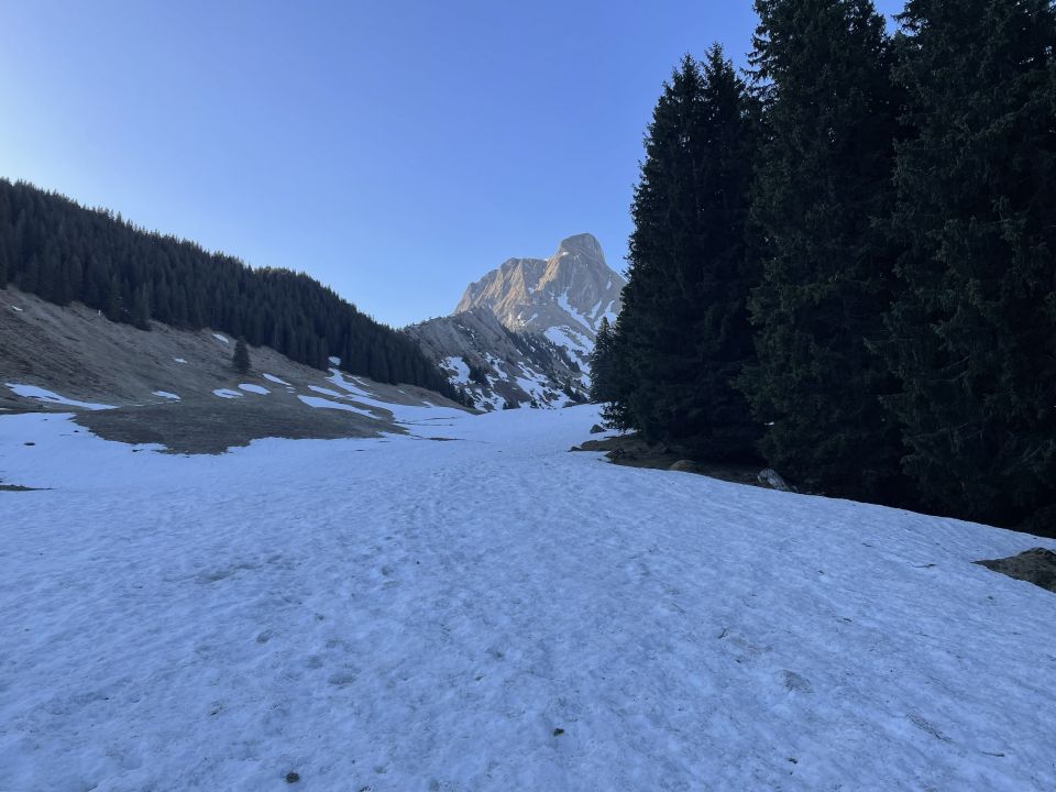 Schnee: Aufstieg; die Ski musste ich zu Beginn nur kurz und dann ein zweites mal, auch nur kurz im Bereich obere Gantrischhütte tragen, ebenso ist die Gipfelflanke ab oberhalb Pt.2055 aper, ansonsten im Aufstieg sehr gute Verhältnisse, im Gantrischchummli liegt noch über einen Meter Schnee(Aufstieg in den Morgetepass machte ich Aufgrund schlechter Spur zu Fuss, ginge jedoch auch per Ski),