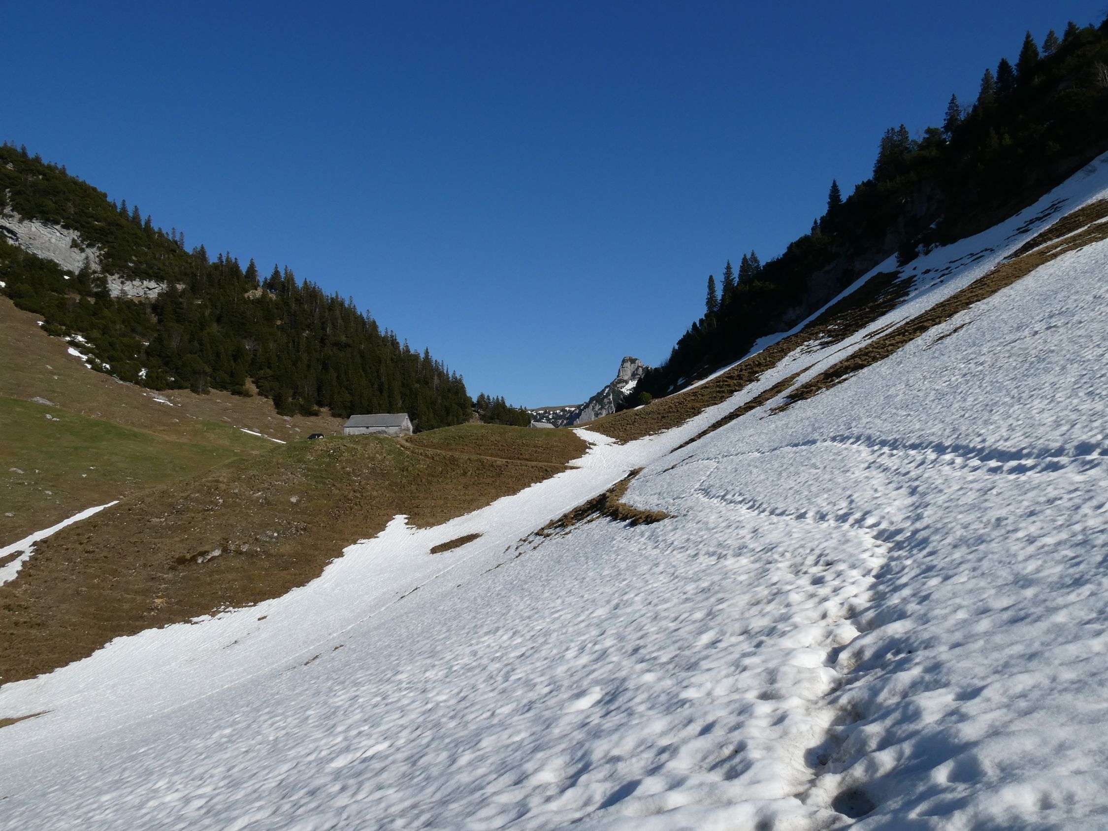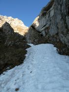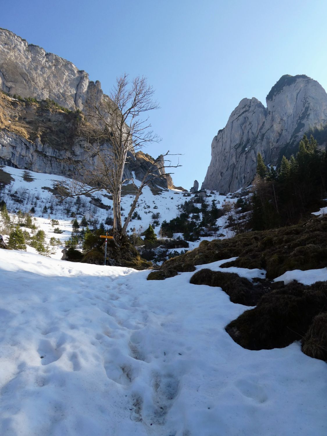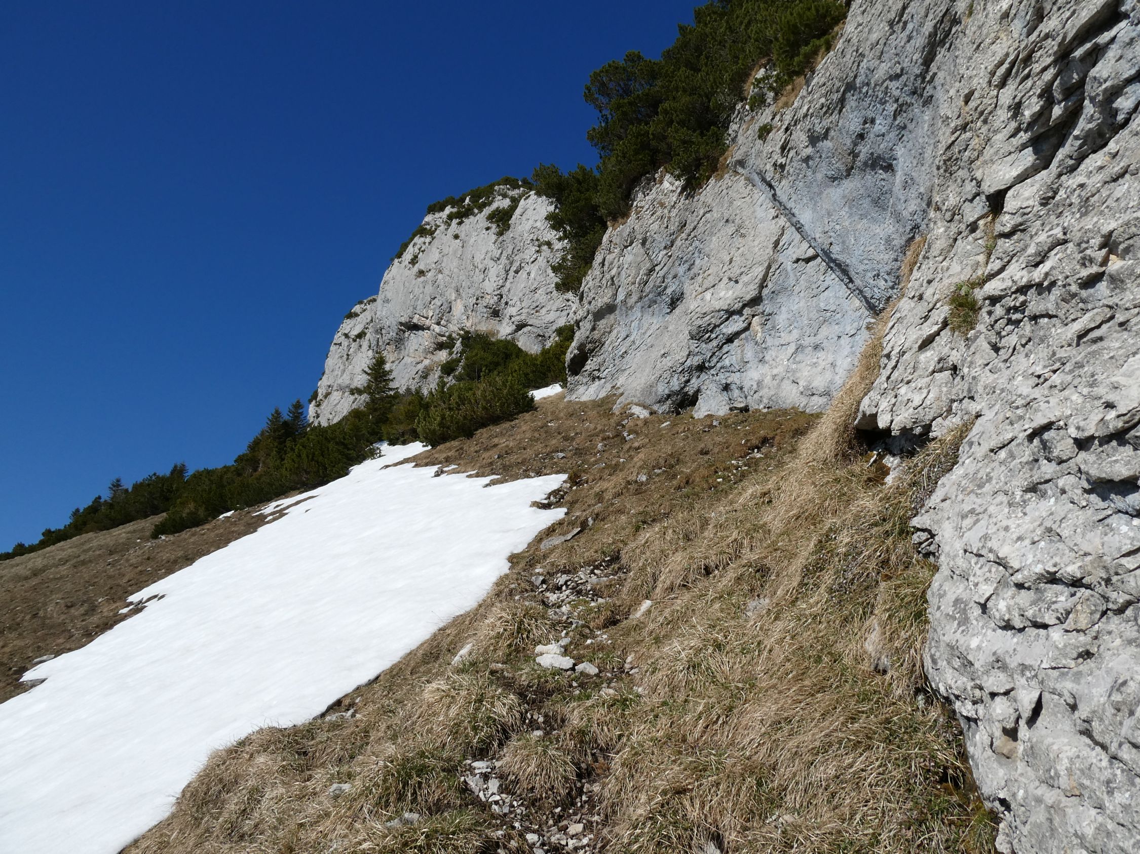 Im unteren Teil der Zahmen Gocht liegt noch ein Schneefeld, welches heute hartgefroren und mit Vorsicht zu begehen war. Die Seile und Ketten in der Zahmen Gocht sind noch nicht eingehängt worden.