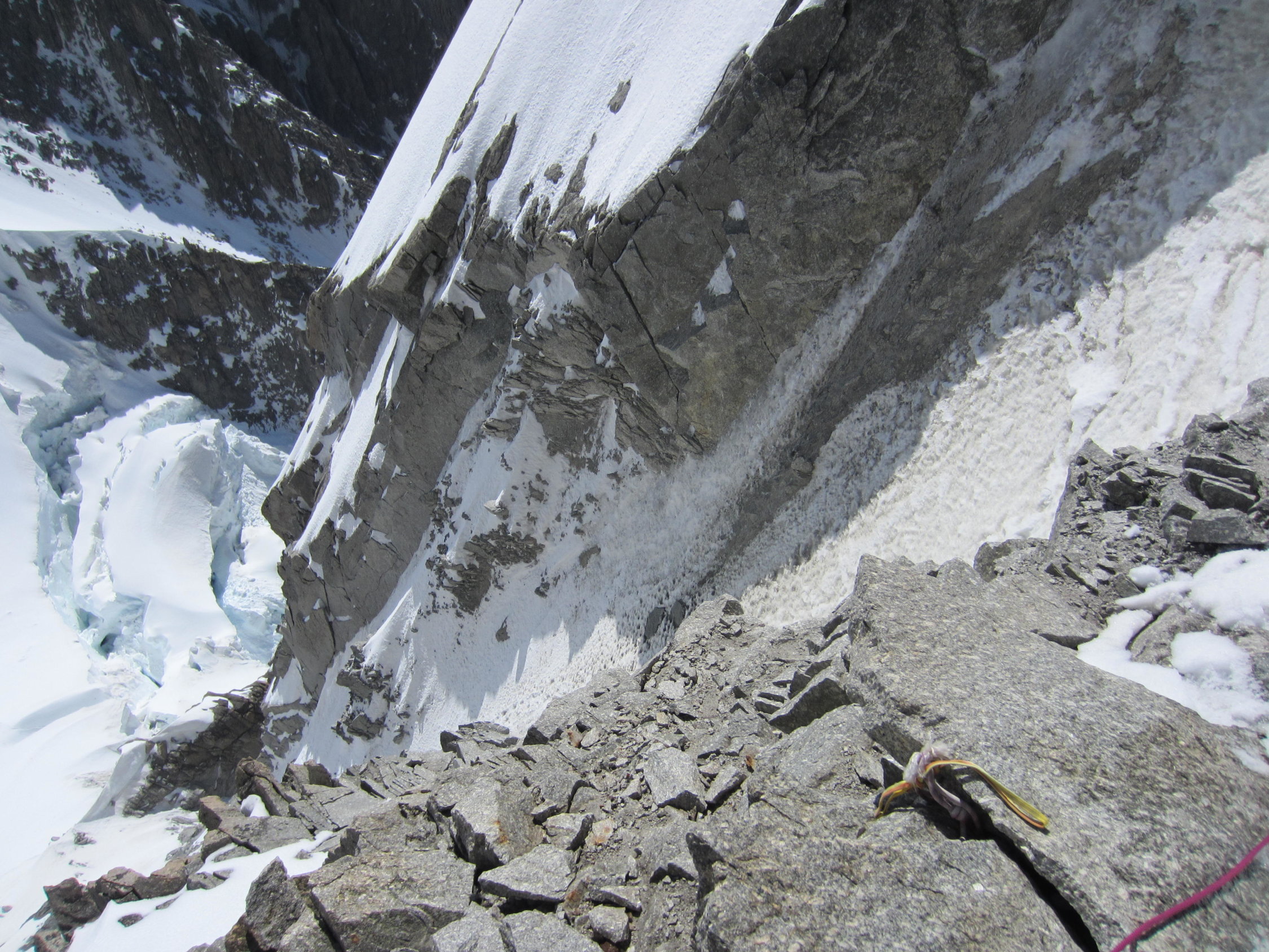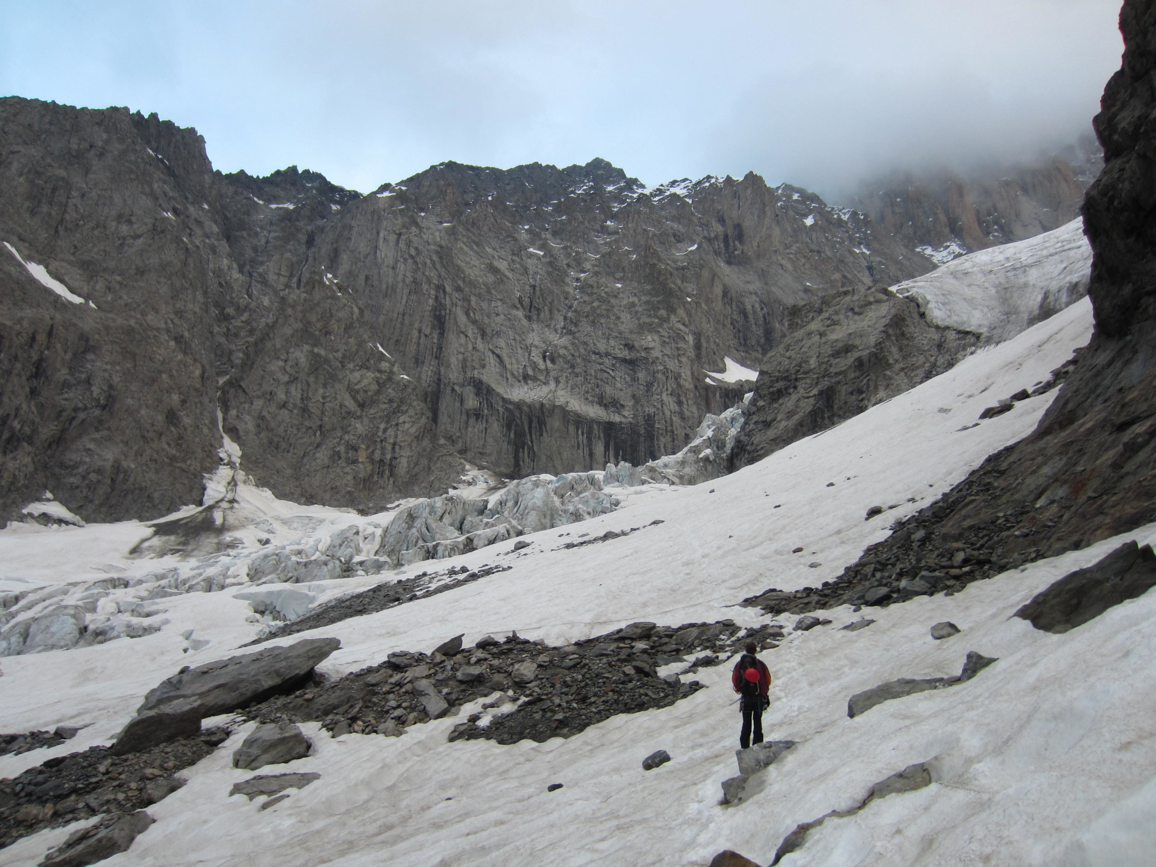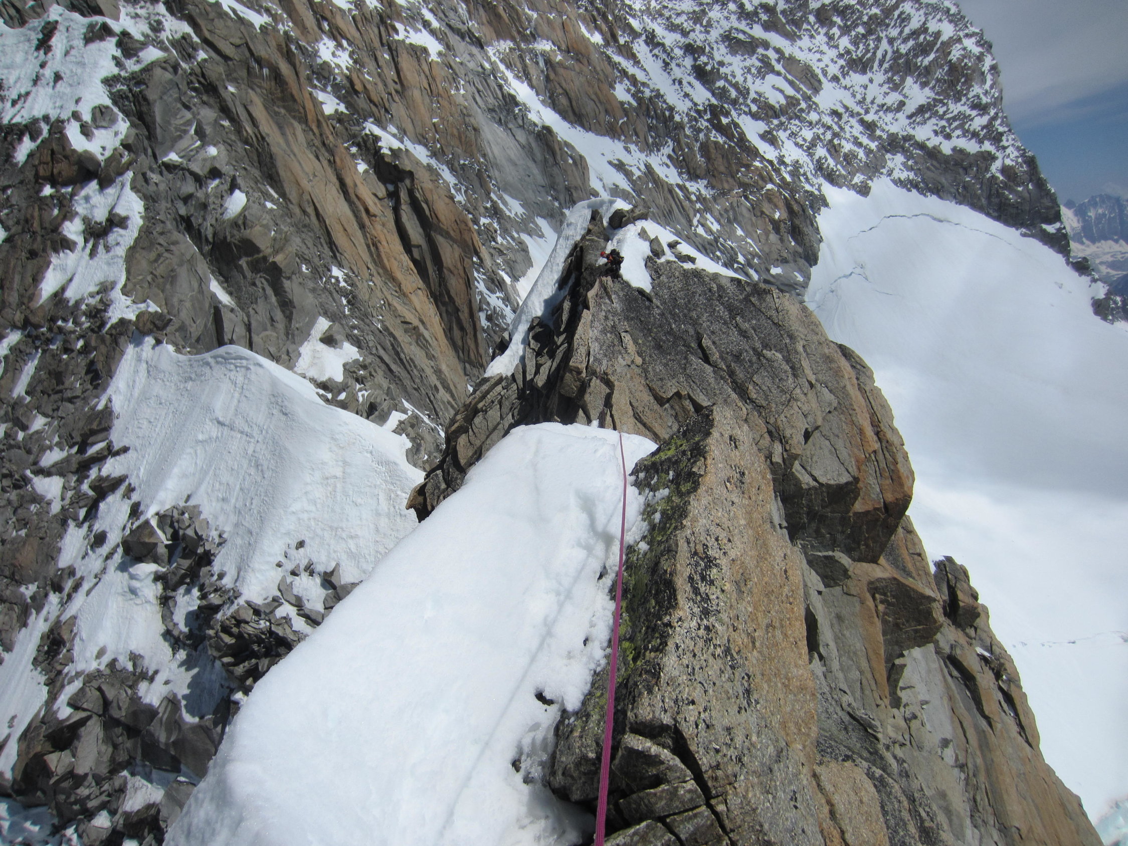 Brouillard Gletscher bis 3400 m aper, Steinschlag aus Pic Eccles Flanke bereits um 9 Uhr durch höher befindliche Bergsteiger im Zustieg zum Eccles Biwak. Der Stein flog zwischen Pickel und Hosenbein meines Partners hindurch, der Pickel verabschiedete sich in hohen Bogen, Hosenbein war aufgerissen, Knie blieb unversehrt!