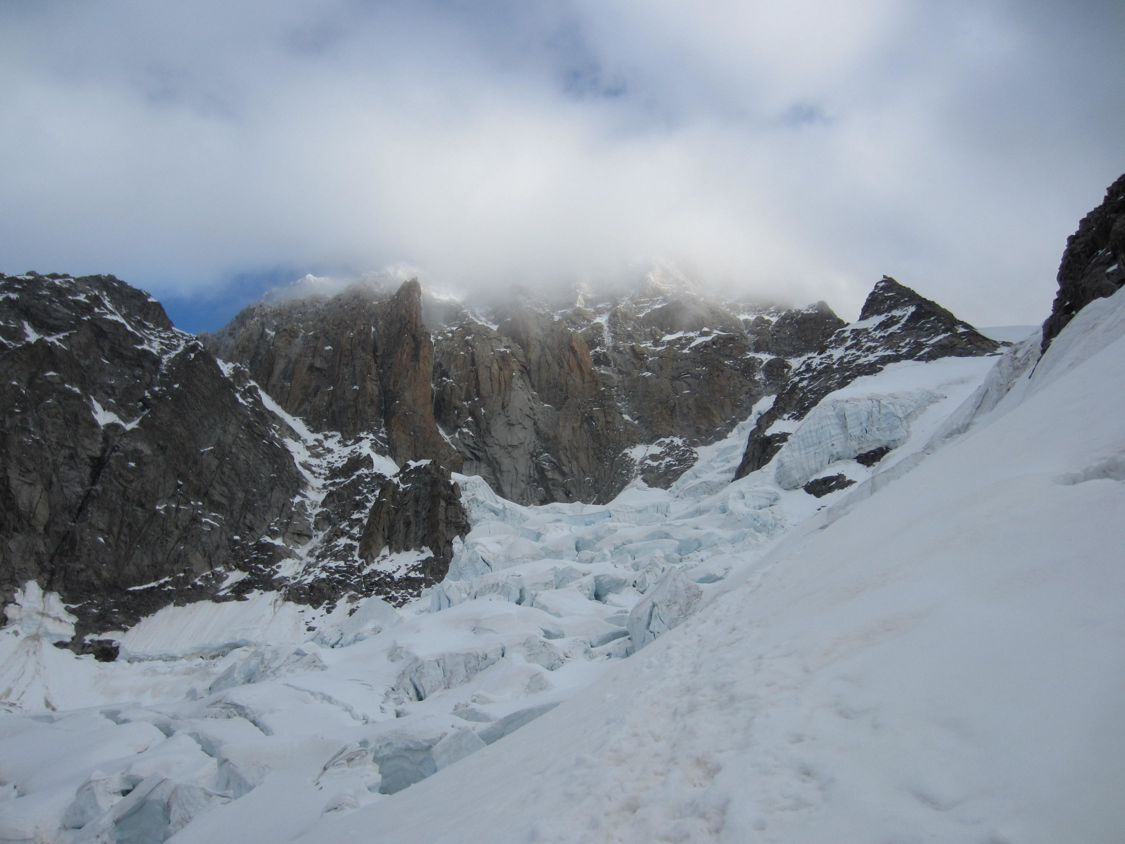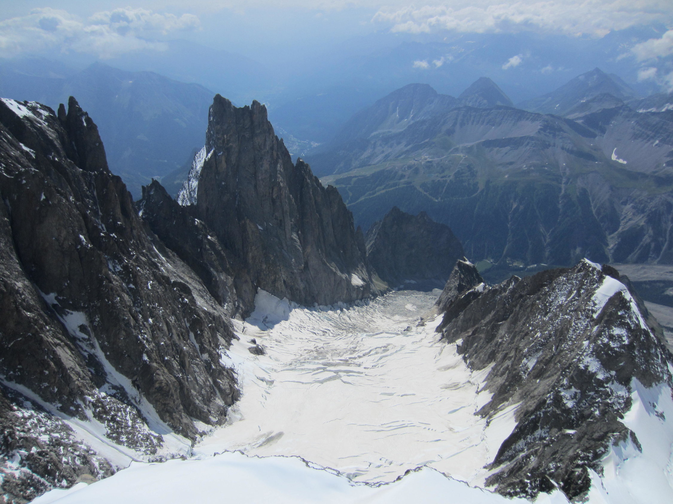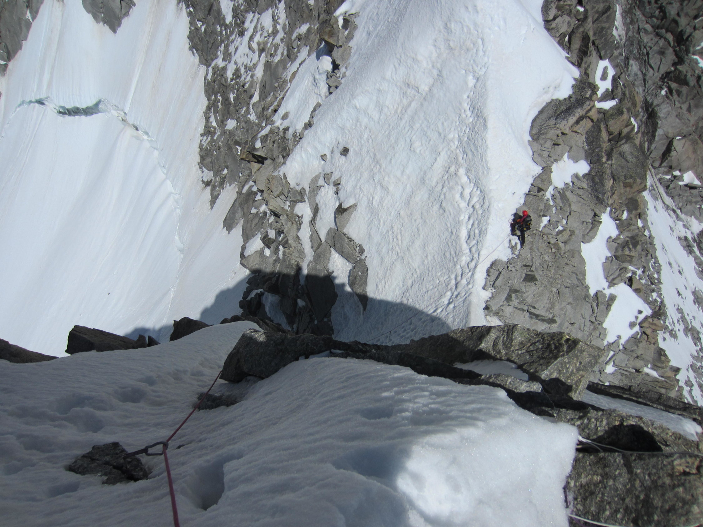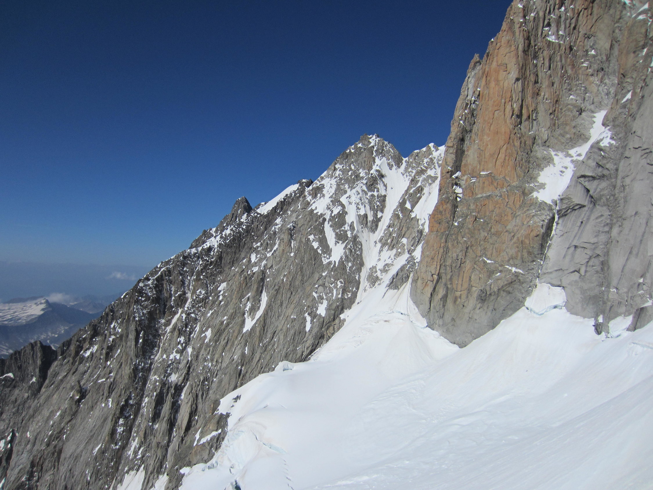 Brouillard Gletscher bis 3400 m aper, Steinschlag aus Pic Eccles Flanke bereits um 9 Uhr durch höher befindliche Bergsteiger im Zustieg zum Eccles Biwak. Der Stein flog zwischen Pickel und Hosenbein meines Partners hindurch, der Pickel verabschiedete sich in hohen Bogen, Hosenbein war aufgerissen, Knie blieb unversehrt!