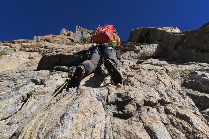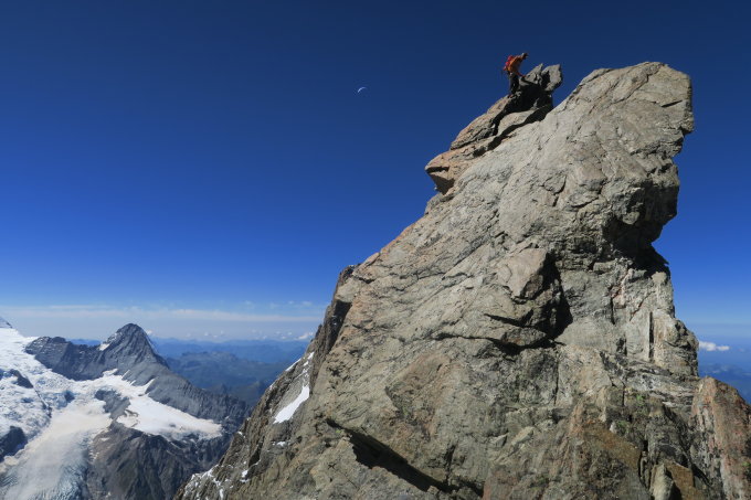 Schreckhornfirn gut eingeschneit, Spalten kaum störend, keine Randkluft/Bergschrund sichtbar. Ab Beginn der Felsen ohne Steigeisen. Hoch zur Rampe und an deren Anfang rechts zu den leichten Platten des S-Pfeilers. Beliebig und seilfrei immer etwas rechts haltend hinauf zum Fuß des abschließenden Pfeileraufschwungs. Wohl etwas zu weit rechts über eine Verschneidung eingestiegen (ca. 6), nach 40m kamen dann in deutlich leichterem Gelände die beschriebenen paar Schlaghaken daher. Mit 5- recht human bewertet, zumindest bei Sonne und trockenem Fels. Am Ende nicht über den mit Eiszapfen verstopften Kamin sondern über die linke Variante raus. Bei umsichtigem Kletterstil erschien uns diese nicht gefährlich. Man darf halt nicht blind jede Schuppe anspringen. 6 SL gesichert, teils am laufenden Seil. Klemmzeug recht hilfreich. Vom Gipfel weiter zum Lauteraarhorn und zurück über den problemlosen Schraubengang. Da wir Sonne im Pfeiler haben wollten, traumhaftes Sommerbiwak mit Schlafsack und Kocher unter dem Schneegrat am Beginn der 5 Sicherungsstangen (ca. 3760m) über der Steilstufe. Die näher am Abbruch (= südlich) befindliche, 2. Stange irritierte uns etwas; Fortsetzung dann schließlich in der entgegengesetzten Richtung (also Richtung Schreckhorn) gefunden. Weitgehend schneefrei zum Strahleggpass und retour nach Grindelwald.