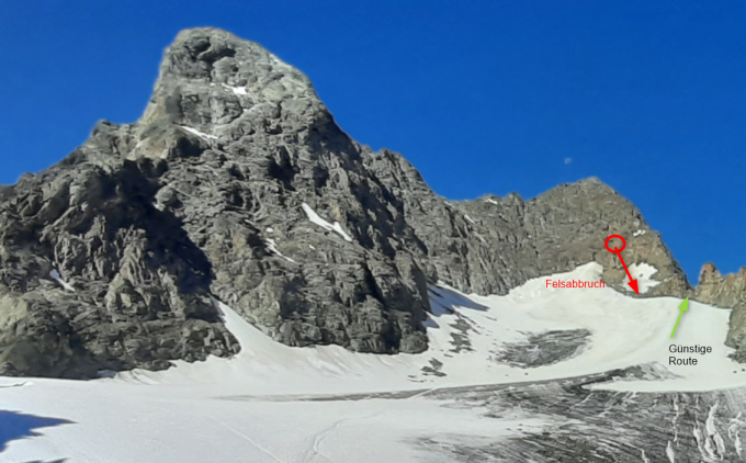 Top Verhältnisse, Gletscher noch gut eingeschneit an Porta d'Es-cha. Als wir die Steigeisen montierten gabs einen doch beachtlichen Felsabbruch in der Ostwand. Die nördliche Aufstiegsroute in der Ostwand ist jedoch nicht direkt betroffen. Allerdings ist es sinnvoll, auf dem Gletscher möglichst früh (auf 3200m) auf den Grat nördlich zu queren. Eine Zweierseilschaft stand nur 50m von der Stelle entfernt, wo der Steinschlag auf den Gletscher traf.