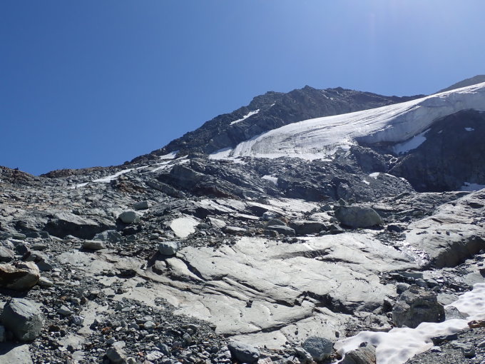 Gute Abstrahlung in der Nacht. Von daher waren die Steine im Aufstieg zum Pass wegen des Niederschlags vom Vortag teilweise etwas mir Reif überzogen. Auf dem Grat war dieser dann aber dank der Sonneneinstrahlung vollständig geschmolzen. Wie im Routenbeschrieb erwähnt, empfiehlt es sich, möglichst der Gratkante zu folgen und nicht zu stark in die Flanken auszuweichen. Dann bietet die Route leichte, aber überraschend schöne Blockkletterei. Der Abstieg über die SW-Flanke weist ebenfalls gute Verhältnisse auf. Im Gipfelhang gibt es ein Schneefeld, das am frühen morgen noch gefroren sein kann. Dann können Steigeisen nützlich sein. Der Gletscher weist einige blanke Stellen auf und der Firn war noch recht hart. Steigeisen sind hier zwingend notwendig.