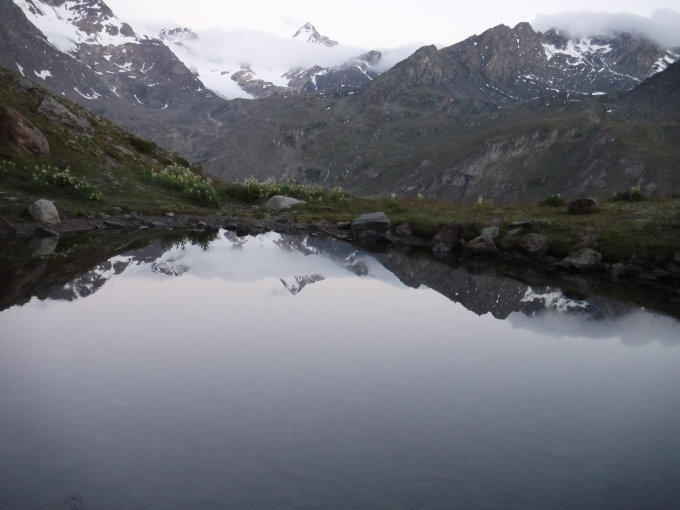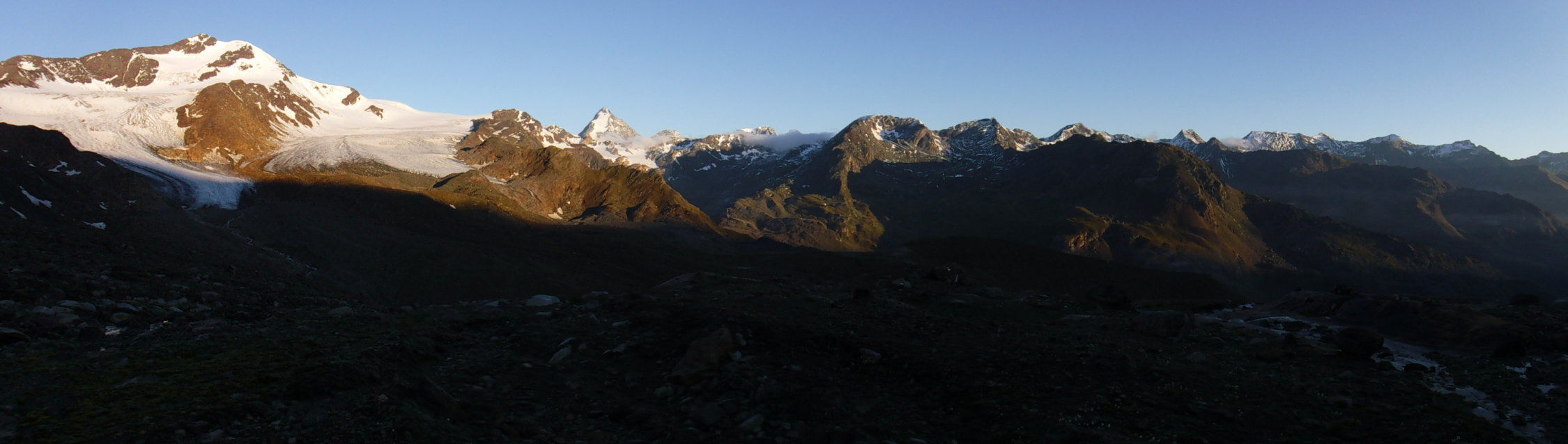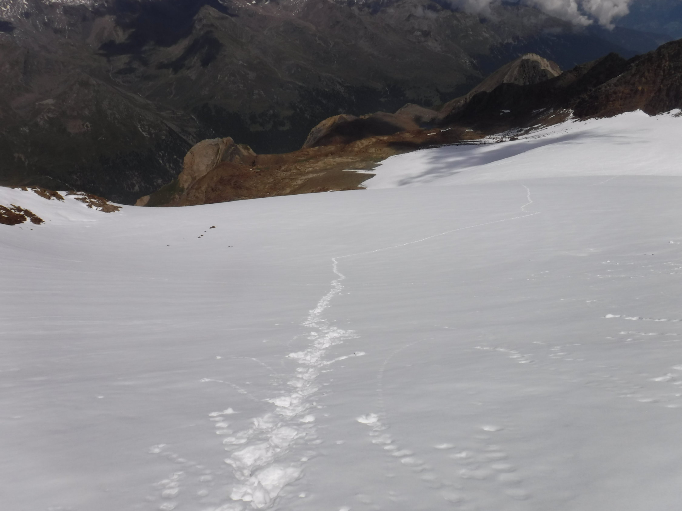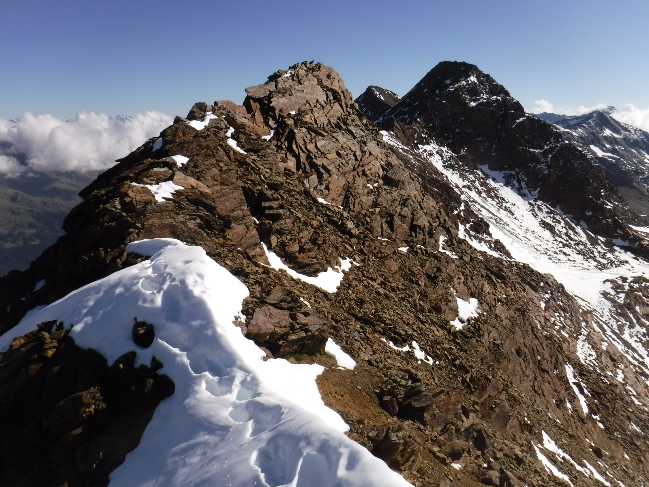 Tourenbeginn um 04:05 Uhr bei 9°C unter klarem Himmel. Den Felsturm P 3326 umging ich rechts problemlos. Durch den 10 cm hohen Neuschnee über den Hohenferner gab es eine Auf- und Abstiegs-Fußspur von mindestens 4 Leuten. Über den Grat sah ich eine Fußspur. Im Abstieg über den Schranferner folgte ich der Spur von 2 Leuten vom Vortag. An der Schlüsselstelle (K2) im SW-Grat der Veneziaspitze hängt eine Tritt-Schlinge, welche an oberer Felskante schon etwas durchgescheuert ist. Darum besser, eigenes Material mitnehmen.
