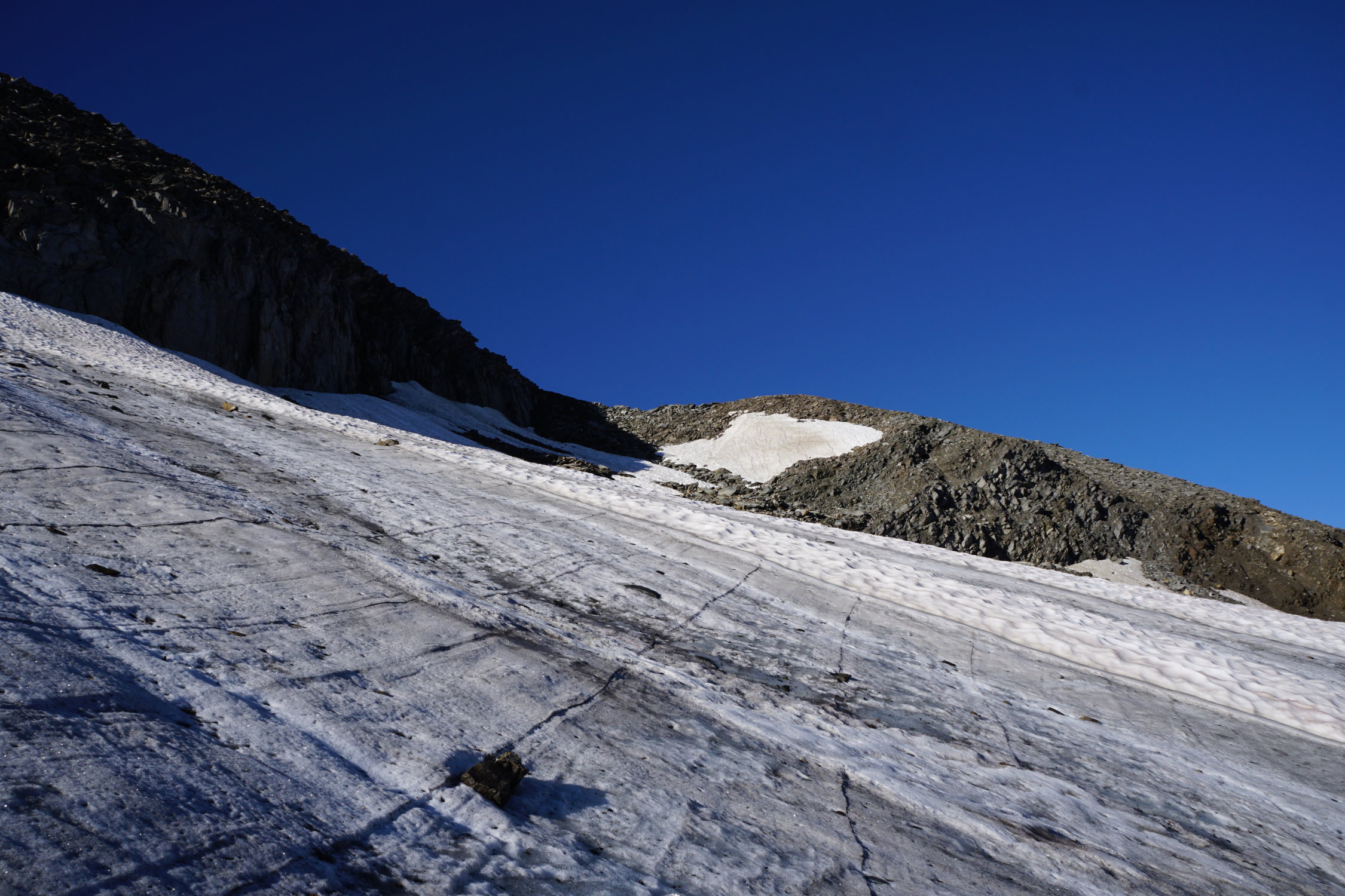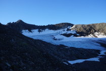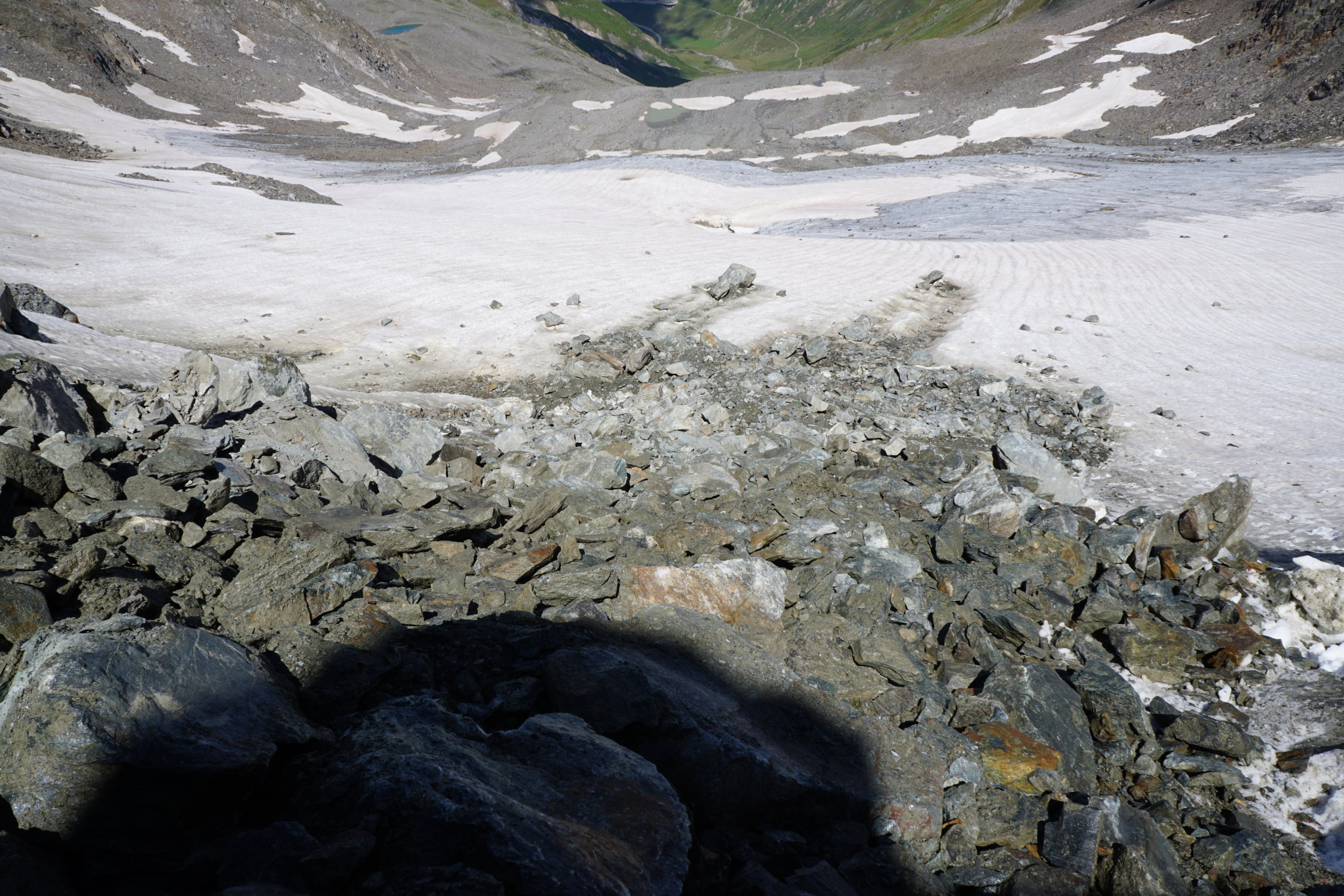 Abstieg zuerst Richtung Aufstieg zurück. Dann kurzfristig entschieden das Nordwändli runter zu kralxeln im Shut und Gerümpel um direkt auf den Gletscher zu kommen. Dann alles gerade runter bis zum Gletscher-Ende. Dann zurück zum Auto.