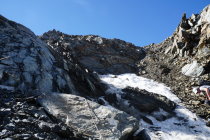 ACHTUNG: Im Nordcouloir hat hat es ein Fixsteil drin, das bis fast auf den Gletscher reicht. Jedoch wurde dieses durch den massiven Felsabbruch stark beschädigt. An zwei Stellen ist der Seilmantel komplett weg. Wir haben das Seil nur als leichte Haltehilfe genutzt. Nicht mit vollem Gewicht rein gehen.