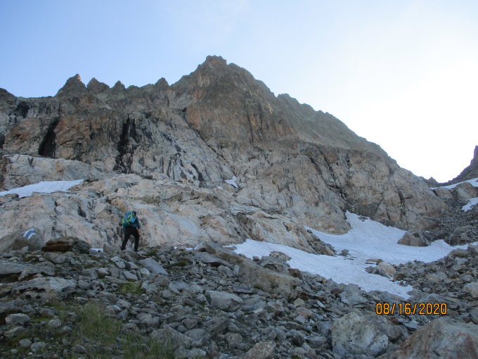 Das Schneefeld im Zustieg zur Lücke zwischen Trotzig- und Murmelsplanggstock (Einstieg) war morgens gegen 8 gut angefroren - kurz vor Steigeisen, die wir nicht dabei hatten.