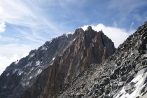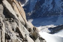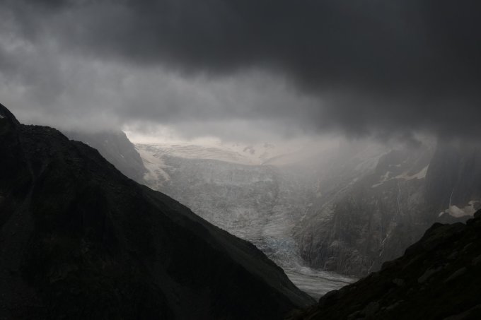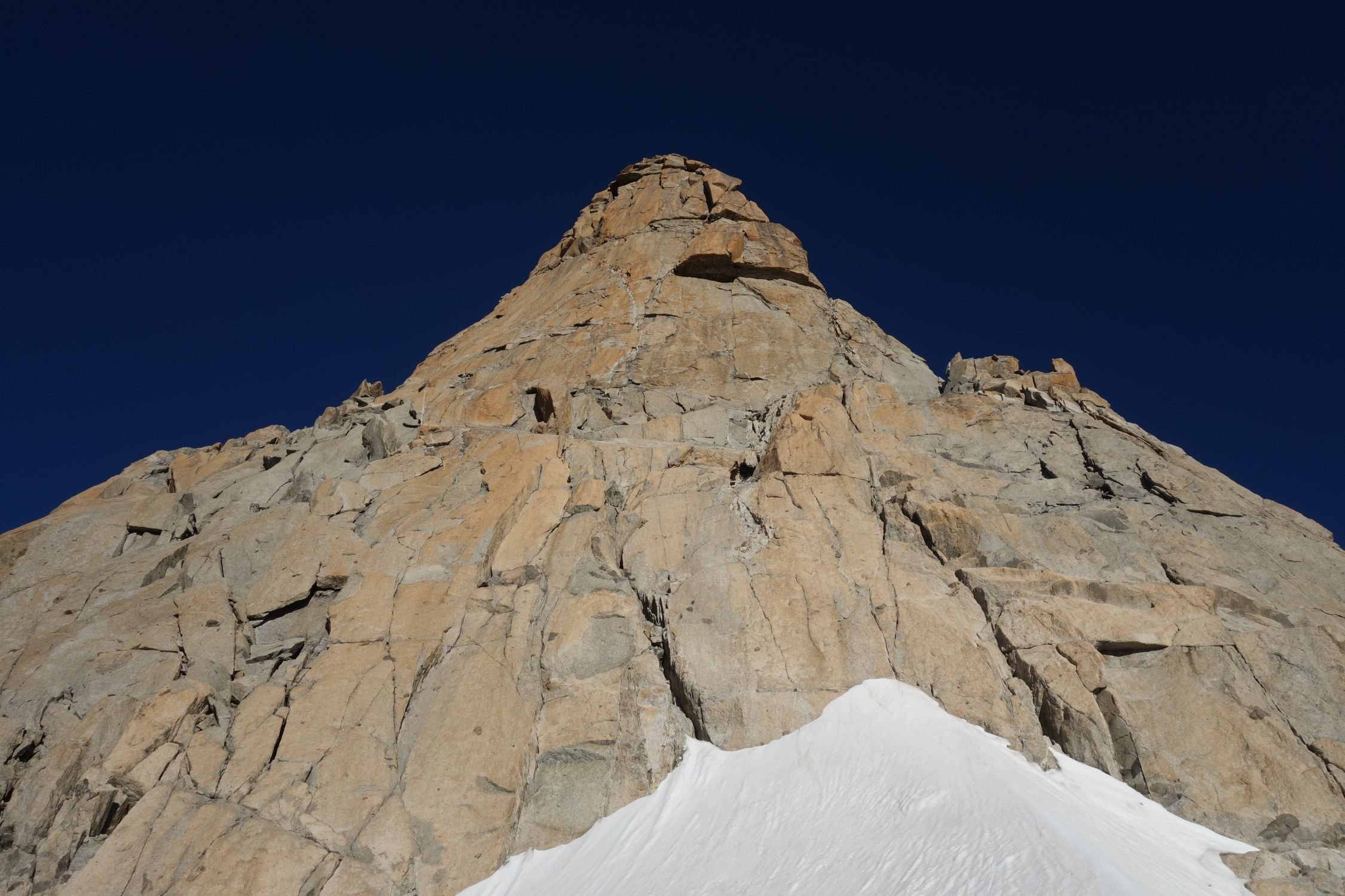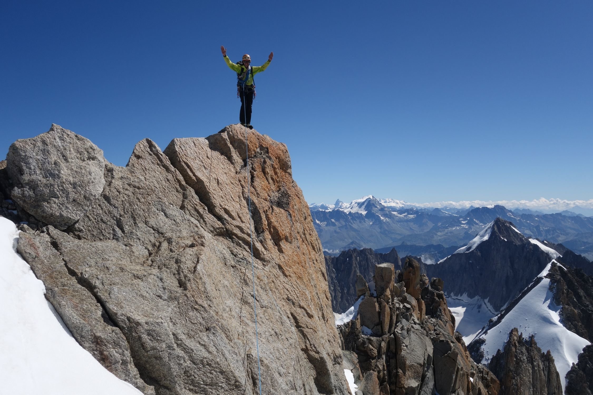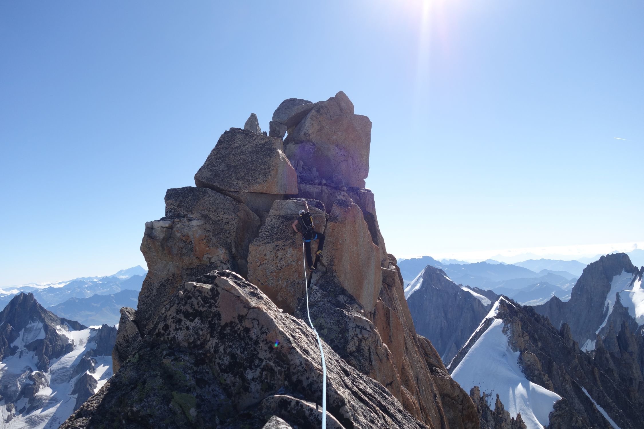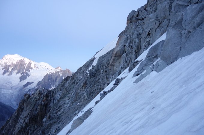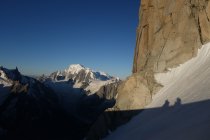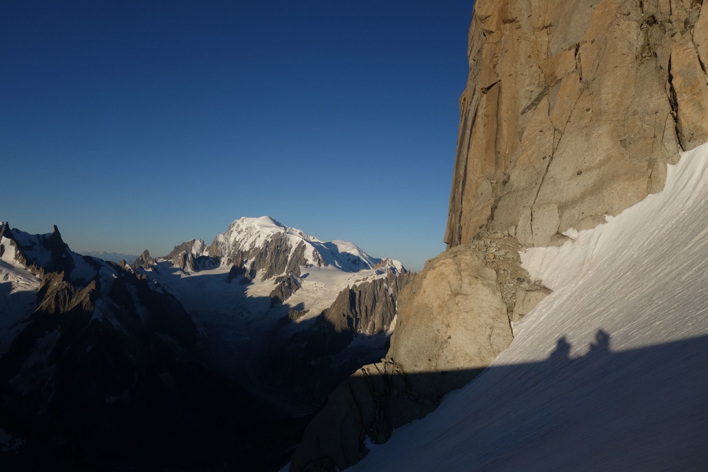 Zustieg zum Col durchgehende recht harter Firn, bestens zu gehen. Grat trotz Niederschlag ab Abend zuvor trocken und wo notwendig schneefrei. Bei ein paar Schritten über steiles Eis, mit 5cm Pulverschnee bedeckt, freuen sich die Eisgerät(e) auf ihren Einsatz. 5 Meter später zurück am Grat: Plaisier-T-shirt Wetter. Ab Westgipfel Gelände für hartgesottene Schotterspezialisten. Abstieg zum Gl. de Talèfre: Schotter, dann Schneecouloir, dann der übliche riessige Bergschrund, 5-6m hoch. Per Schneebirne abgeseilt, da ab Abseilstelle 2x50m notwendig gewesen wären.