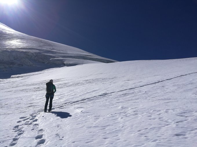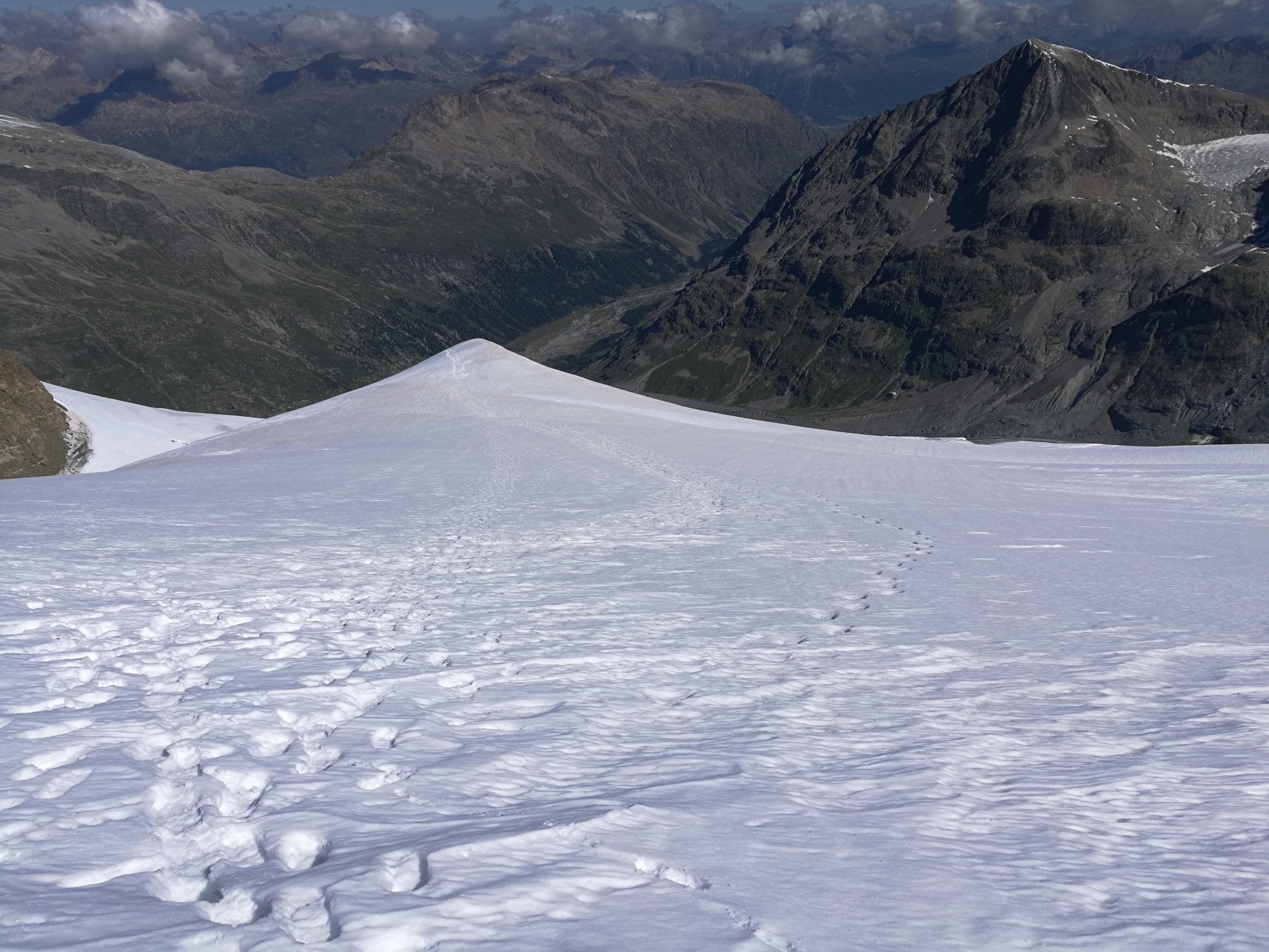 Es liegt noch reichlich Schnee auf dem Tschierva Gletscher und die Spalten können gut umgangen werden. Trotzdem sollten man in großem Bogen ausholen und nicht zu früh queren. Der Einstieg zum Grat ist gut zu erreichen und der Grat selbst war schneefrei und ohne Eis. Der Ansteigt zur Schneekuppe war mit teils festem Schnee, jedoch gut zu gehen. Für den Übergang von der Schneekuppe zum Hauptgipfel waren wir leider zu spät, aber eine Seilschaft vor und hatte den Gipfel bestiegen.