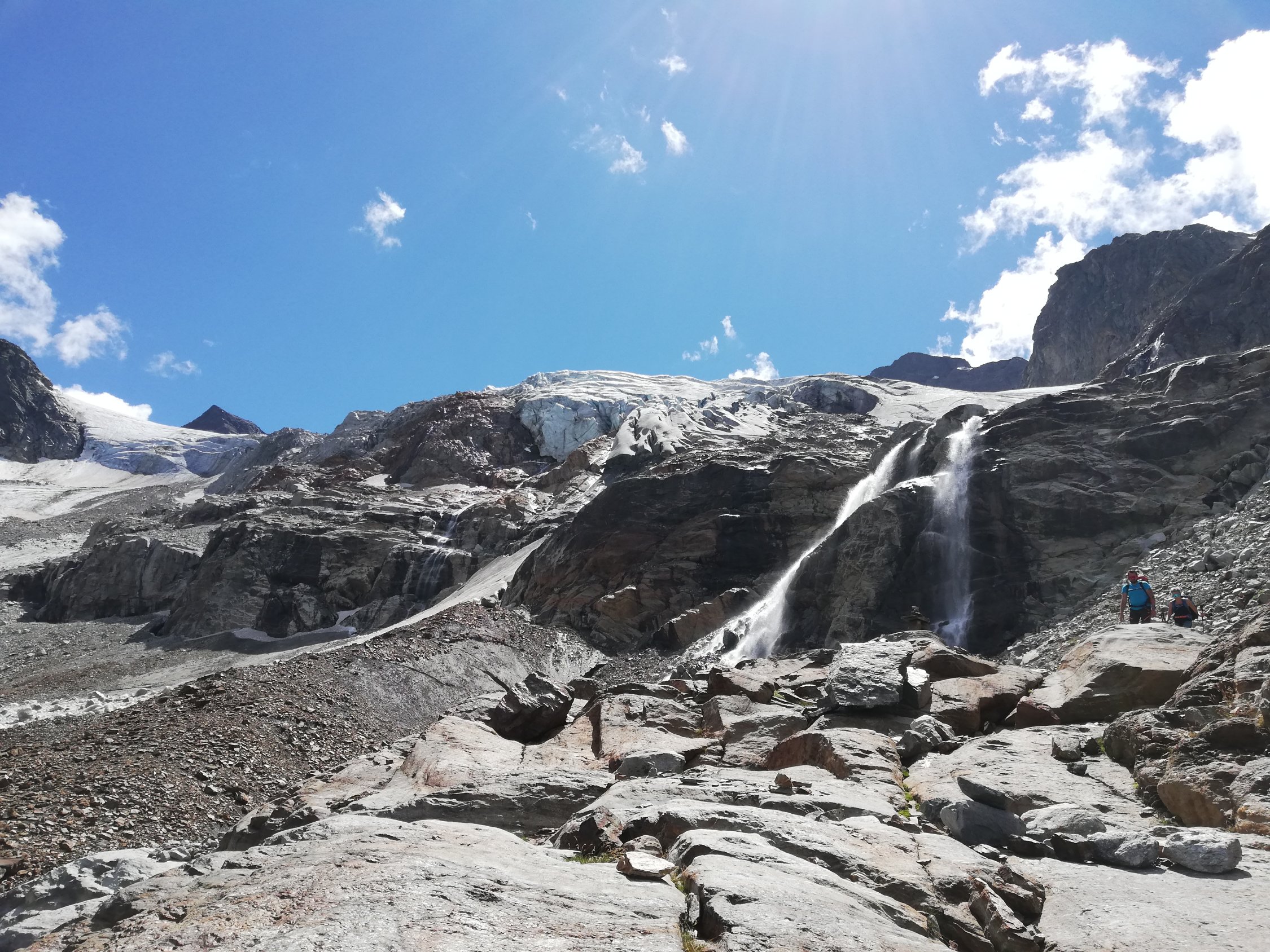 Auch der Gletscherbruch bricht ab. Beim ersten grossen Wasserfall schräg links drüber drohen Eislawinen.