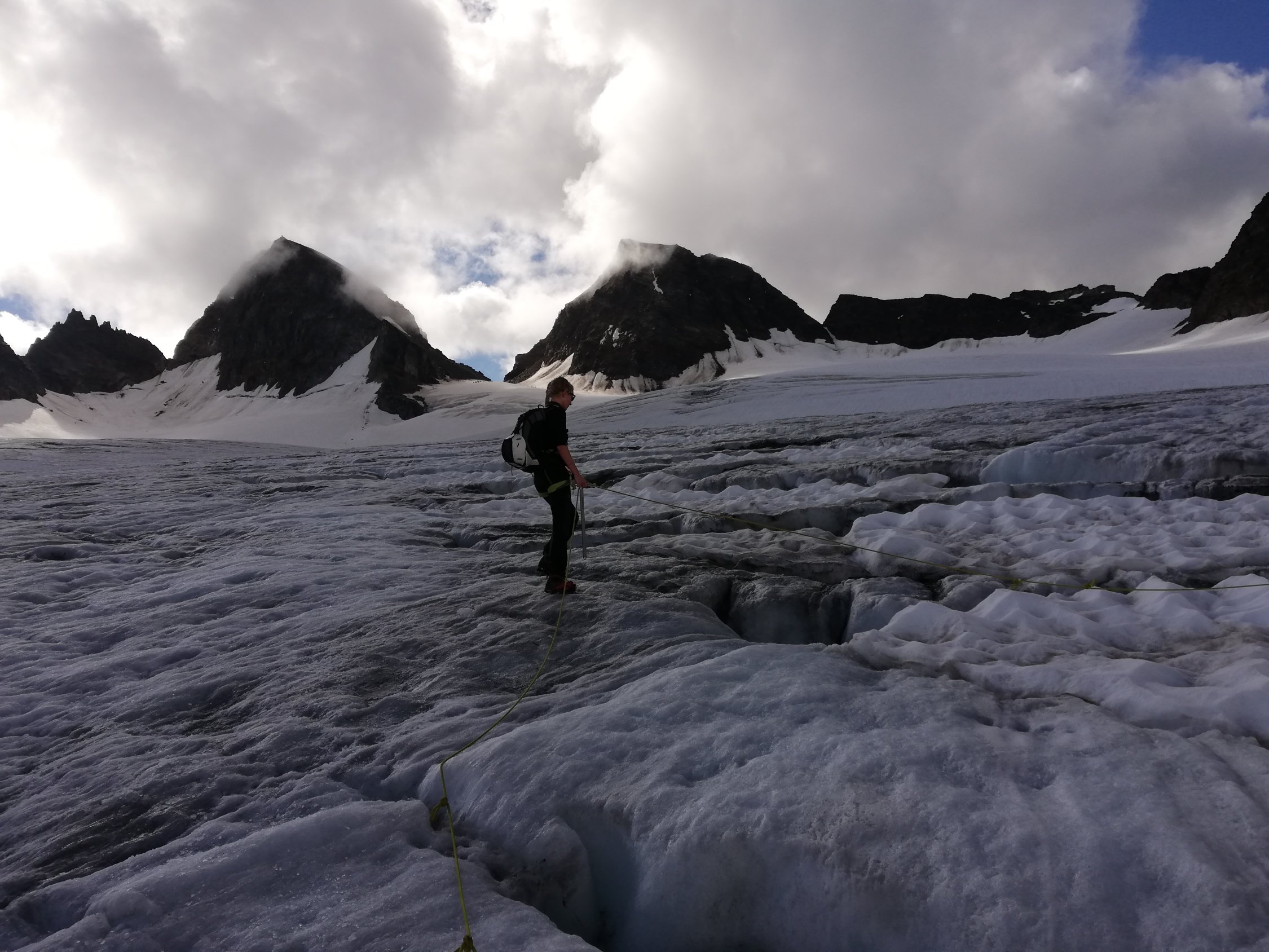 Der Gletscher apert rasch aus, unbedingt Eisschrauben mit nehmen für unsichere Bergler.