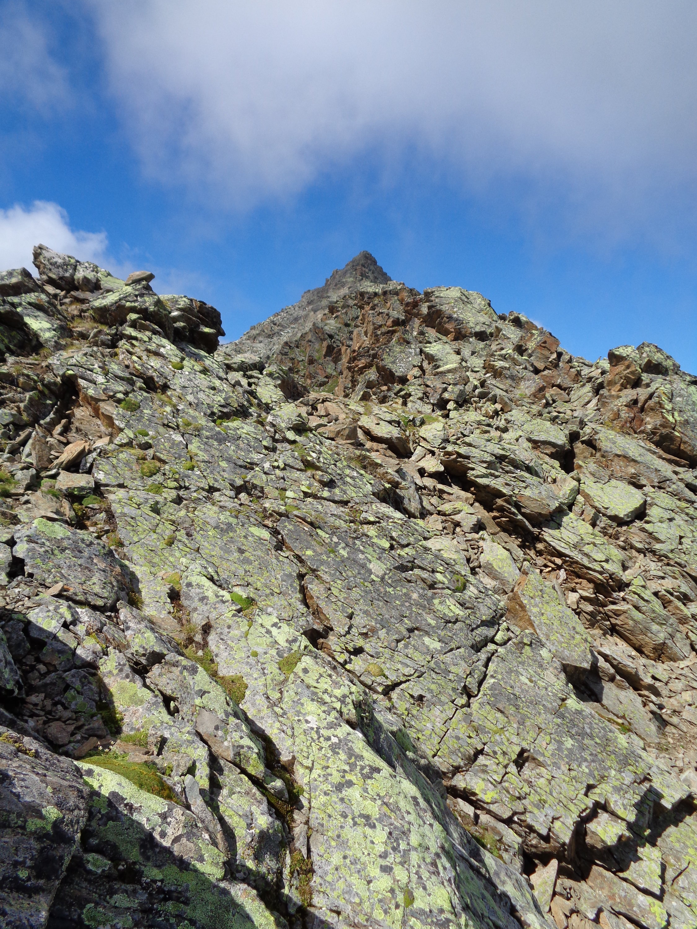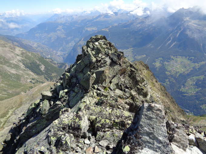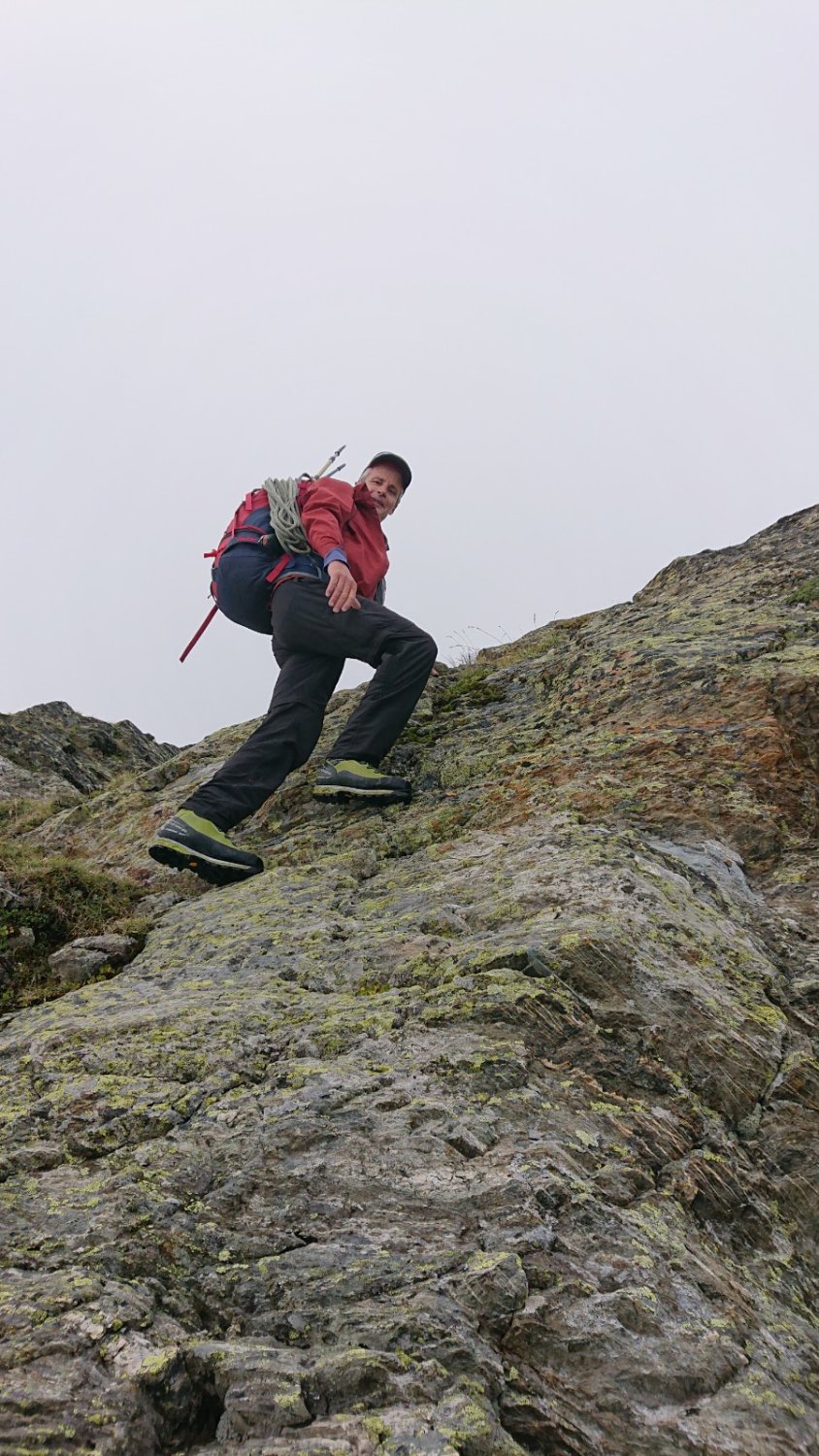 Es ist empfehlenswert, das man immer auf dem Grat bleibt. Hier sind die Felsen fest, und bieten eine schöne Blockkletterei I. Der Grat vom Vorgipfel auf den Hauptgipfel ist interessant, vorausgesetzt, man folgt der Kante und umgeht die schönen Klettermöglichkeiten nicht.
