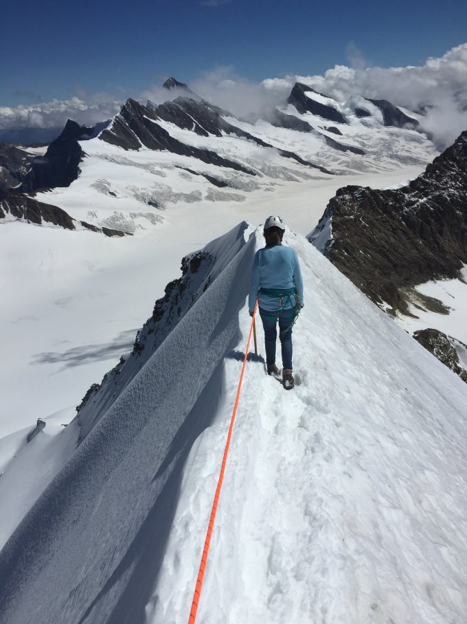 Top Verhältnisse. Unten ist der Fels trocken und gut zum klettern. Das steile Stück zum Grat mit den Sicherungsstangen hat trittsicheren Firn. Über den Grat hat hat es eine gute Spur, welche einfach zu gehen ist. Wunderschöne Fernsicht mit stahlblauem Himmel. Einfach genial.