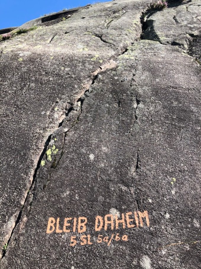 Wir haben beschlossen wieder einmal am Oelberg (Handegg) etwas zu klettern. Am Engeliweg haben wir uns Aufgewärmt 5b um dann die neue Route rechts davon 'Bleib daheim' (wahrscheinlich in Anlehnung an die Corona Zeit) welche am Einstieg mit 5a/6a angeschrieben ist zu probieren. Beide Routen sind top abgesichert im besten Fels. - Eine Frage - Weiss jemand ob die Boulder Highway welche über die Benzinplatte führt auch neu ausgerüstet wurde? Nochmals vielen Dank an die Erstbegeher der Route Bleib Daheim.
