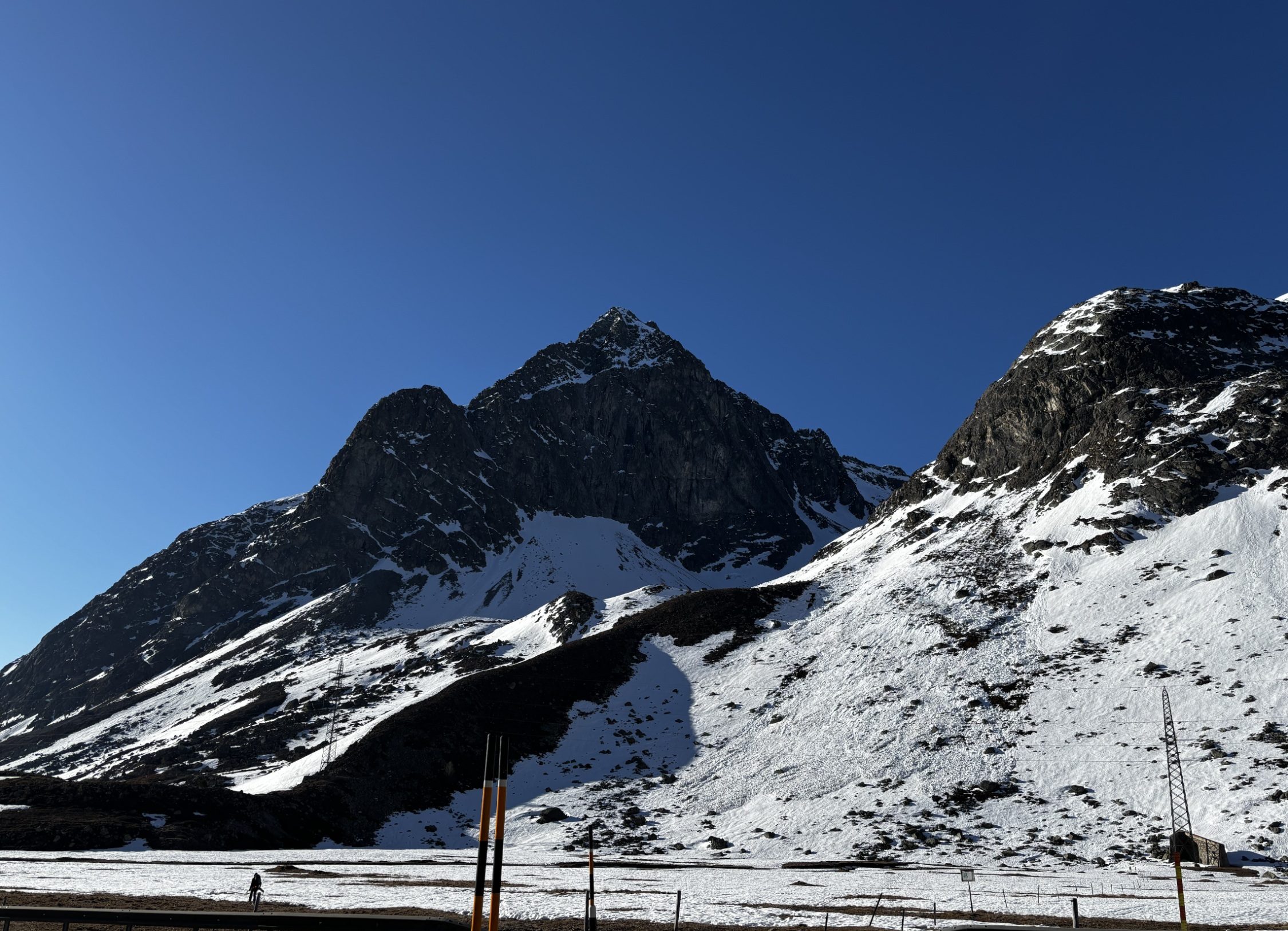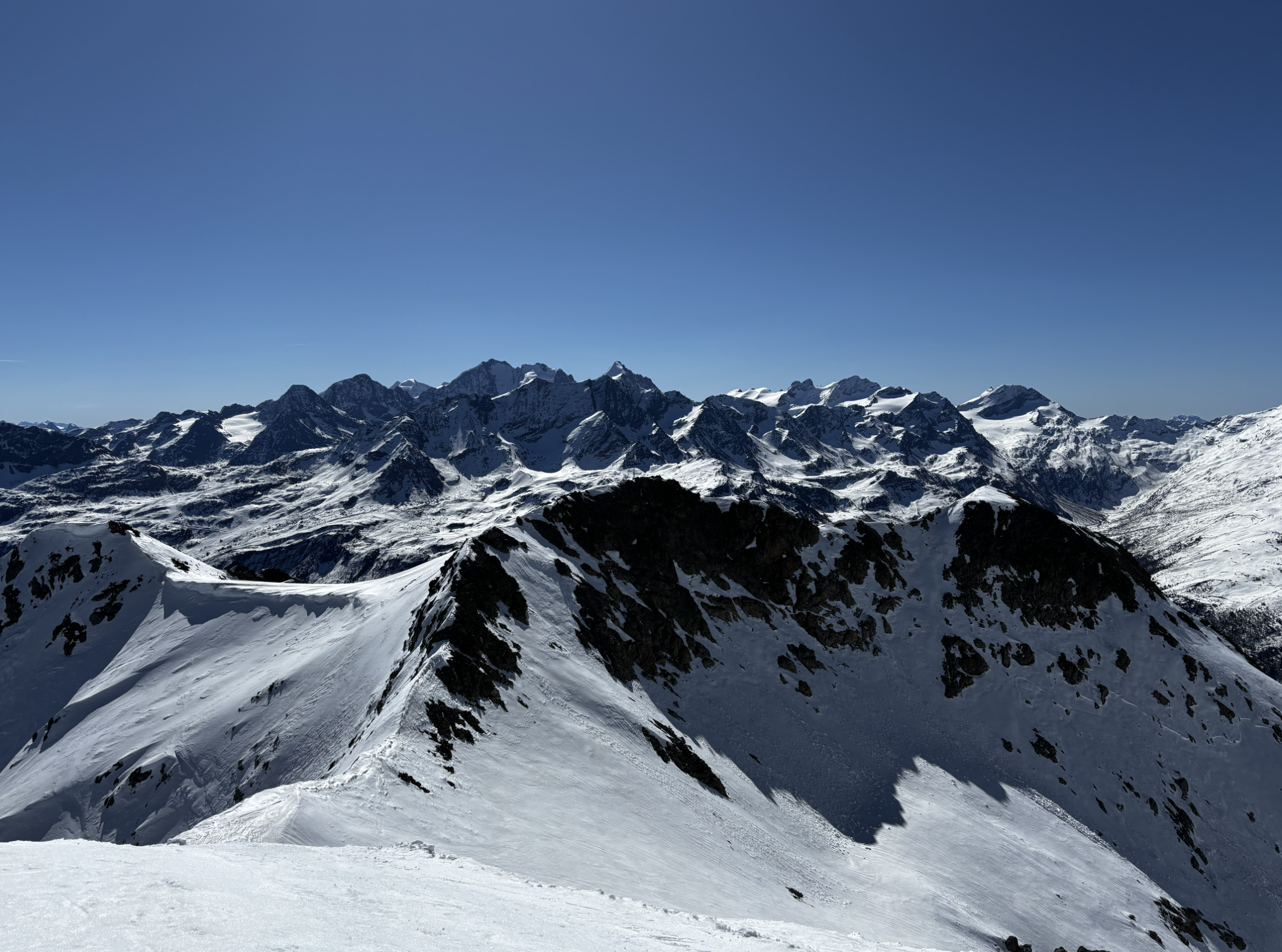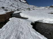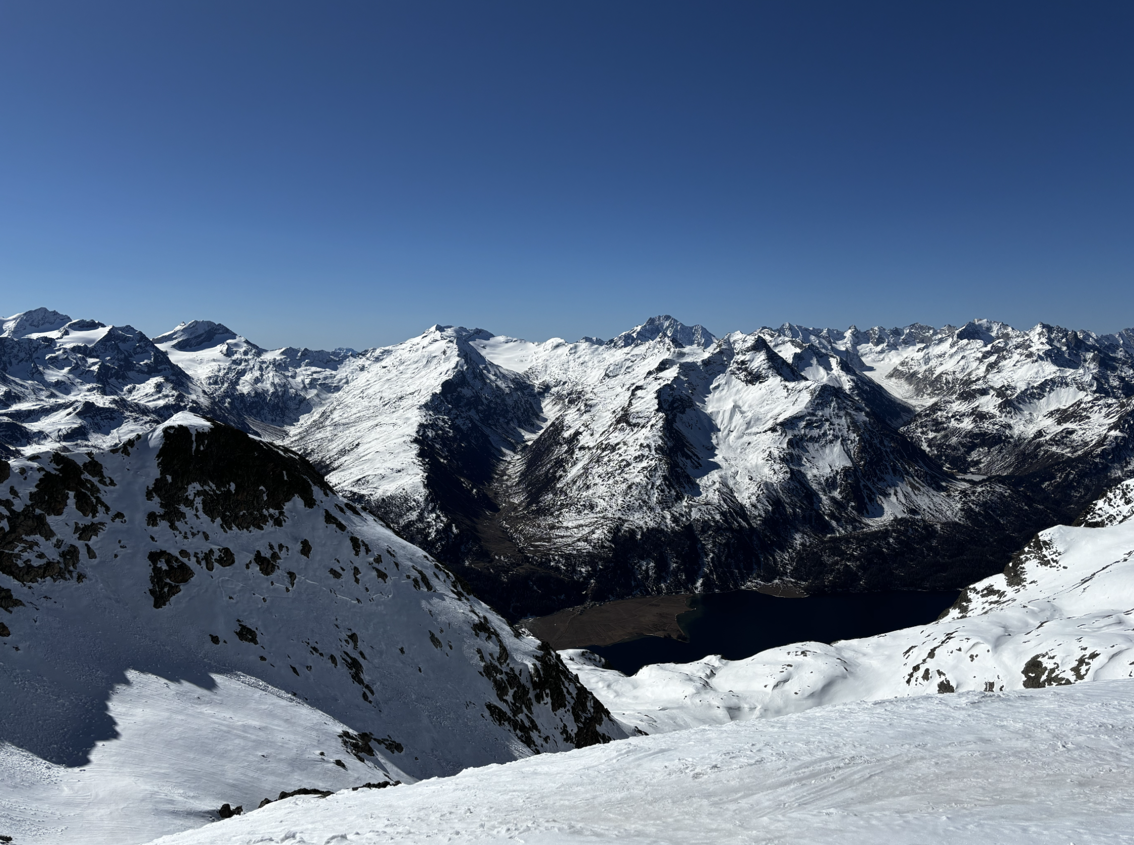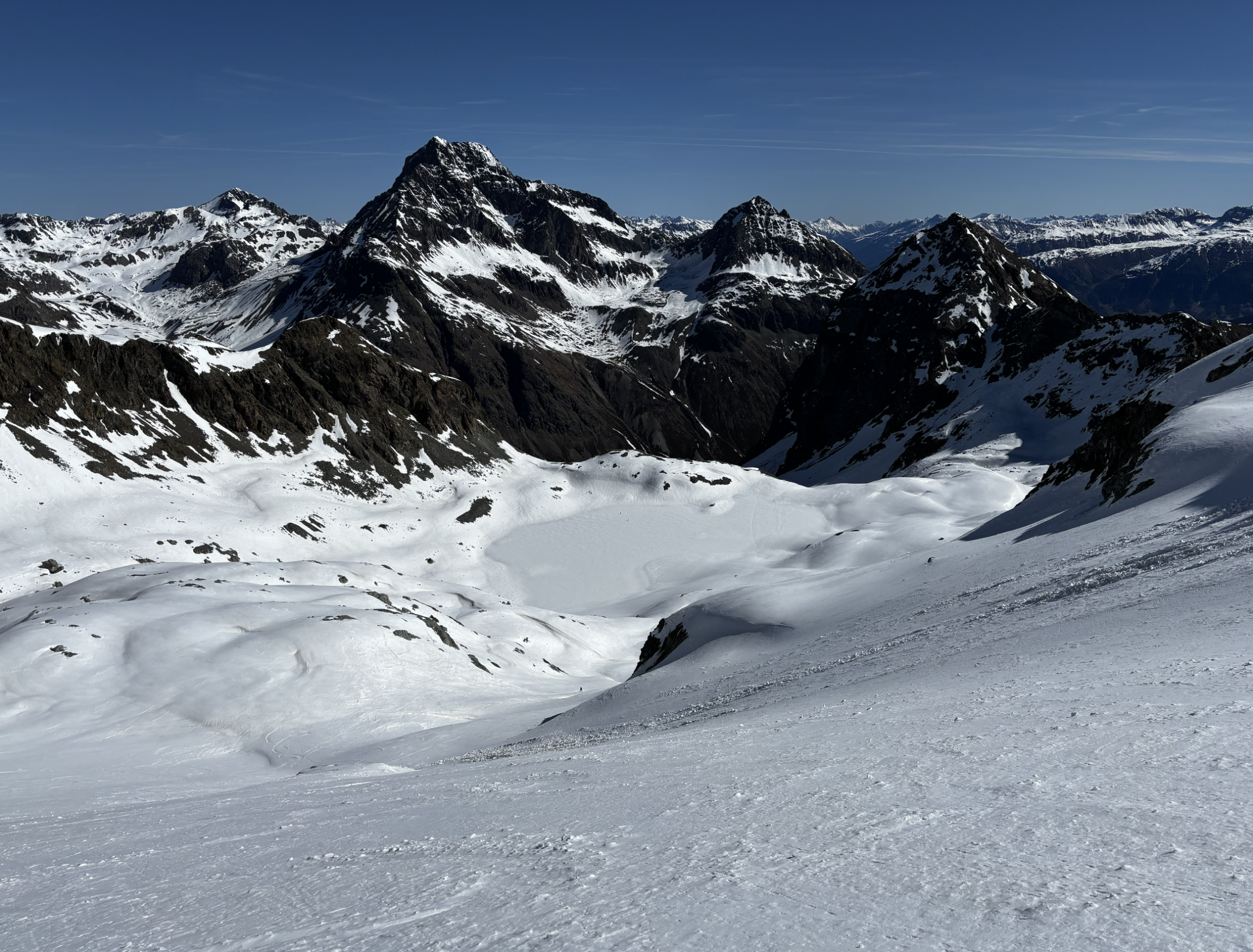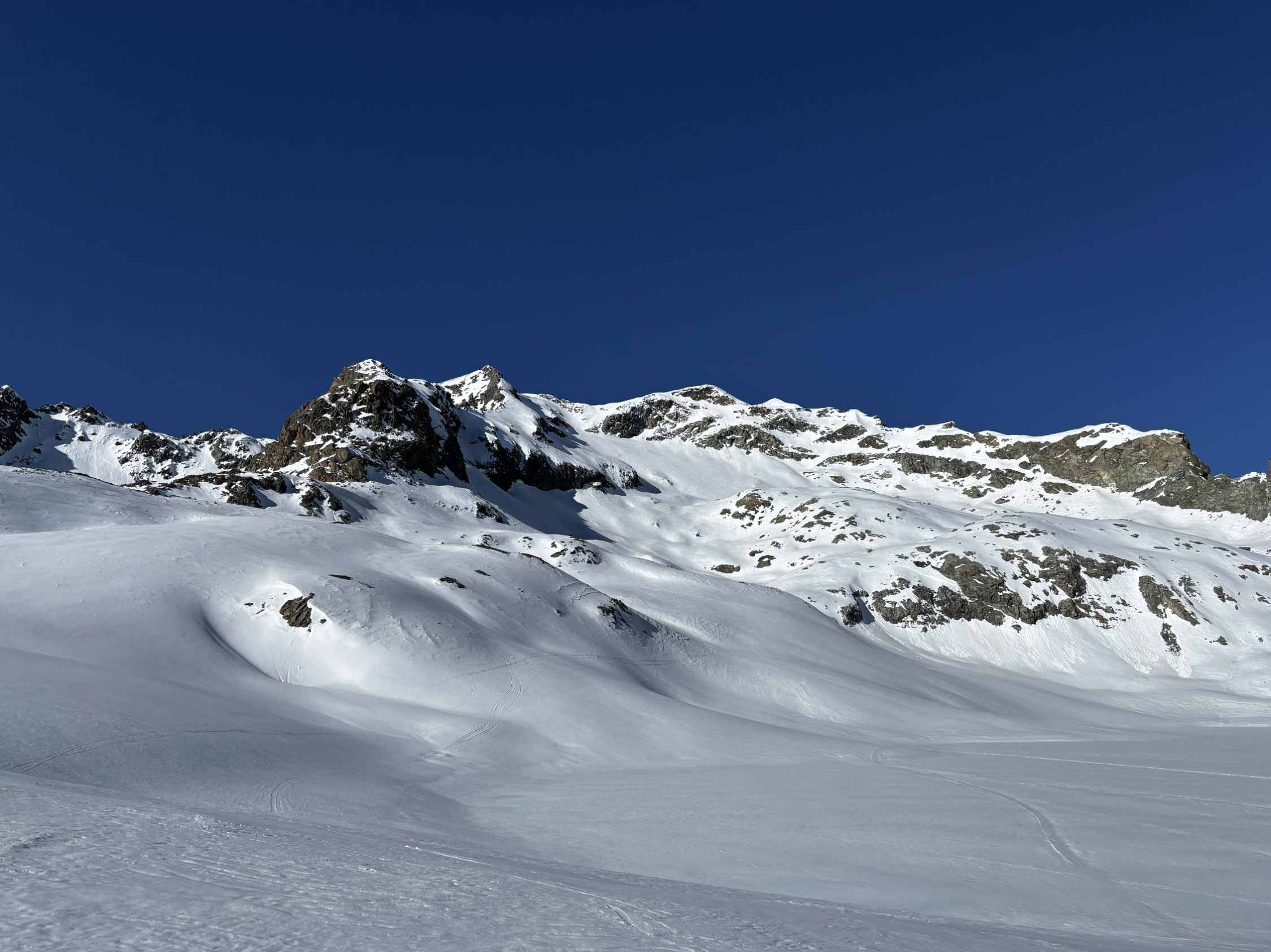 Da es heute Nacht wirklich abgekühlt hat (beim Start um 7:30 Uhr -2 Grad am Parkplatz Julierpass) war der gesamte Aufstieg hart gefroren. Harscheisen in der Steilstufe und vor dem Ausstieg auf den Gipfelgrat von Vorteil. Die Hänge mit Südlage haben am Julierpass weit hinauf keine ausreichende, durchgehende Schneedecke mehr. Auf den Piz Surgonda muss man zunächst 15/20 min Ski tragen, danach (so sah es vom Gipfel aus) sollte eine ausreichende Schneedecken zum passenden Zeitpunkt von dort eine schöne Firnabfahrt ermöglichen. Heute zum Zeitpunkt der Abfahrt um 9:30 Uhr war die Sonne noch nicht ausreichend am Werk. Im oberen Bereich hat es neben harten Passagen auch noch einige Schwünge auf dünner Pulverschneeauflage gegeben. In der Steilstufe nach dem Lej Lagrev hatte ich mich an die Osthänge unter den Felsen geklemmt und guten Sulz erwischt. Die Steilstufe lag immer noch im Schatten und war aber gut zu fahren. Entlang der Moräne zur Passstraße wieder sulziger Schnee. Derzeit noch direkt vom Parkplatz aus durchgende Schneedecke (1x ca 1m Wiese) und die Schneebrücke über den Bach hat ein kurzes Ablaufdatum. Wer ein Stück die Ski trägt, könnte auch noch auf den Piz Turba ausreichend gute Schneeverhältnisse vorfinden. Westlich des Passes ist auf den nordseitig ausgerichteten Hänge wesentlich bessere Schneelage.