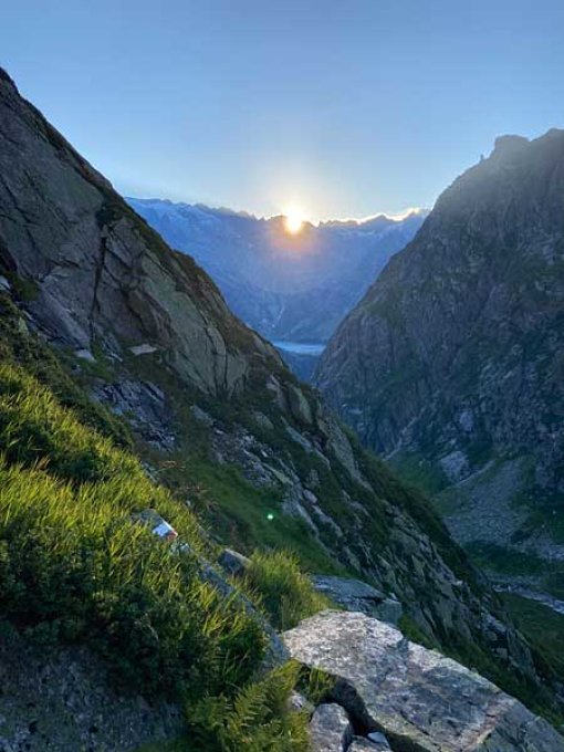 abstieg: alles über den südgrat abklettern, wobei die letzten beiden türme vor der scharte rechts auf wegspuren umgangen werden. da im couli kein schnee mehr liegt: zunächst 15m und dann 2 mal 25m abseilen (die stände befinden sich immer an der rechten begrenzungswand). nun zunächst über geröll, dann über firn auf den gletscher, der erstaunlich grosse spalten aufweist. über diesen zurück auf das flache felsplateau, das zurück zur hütte führt oder gleich über den gletscher hinunter zum gruebensee.