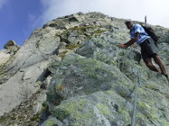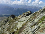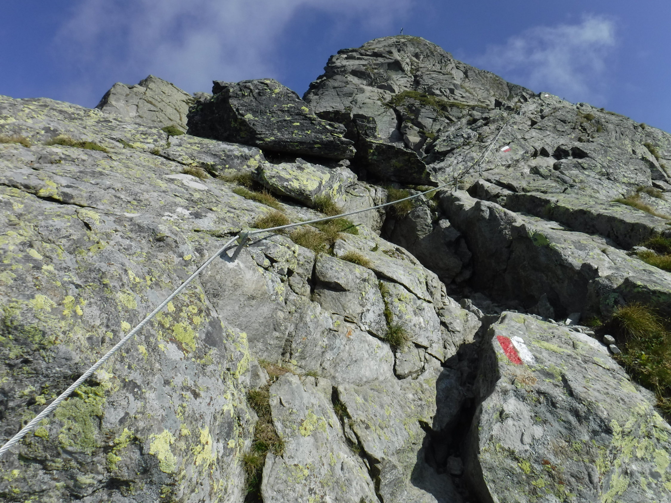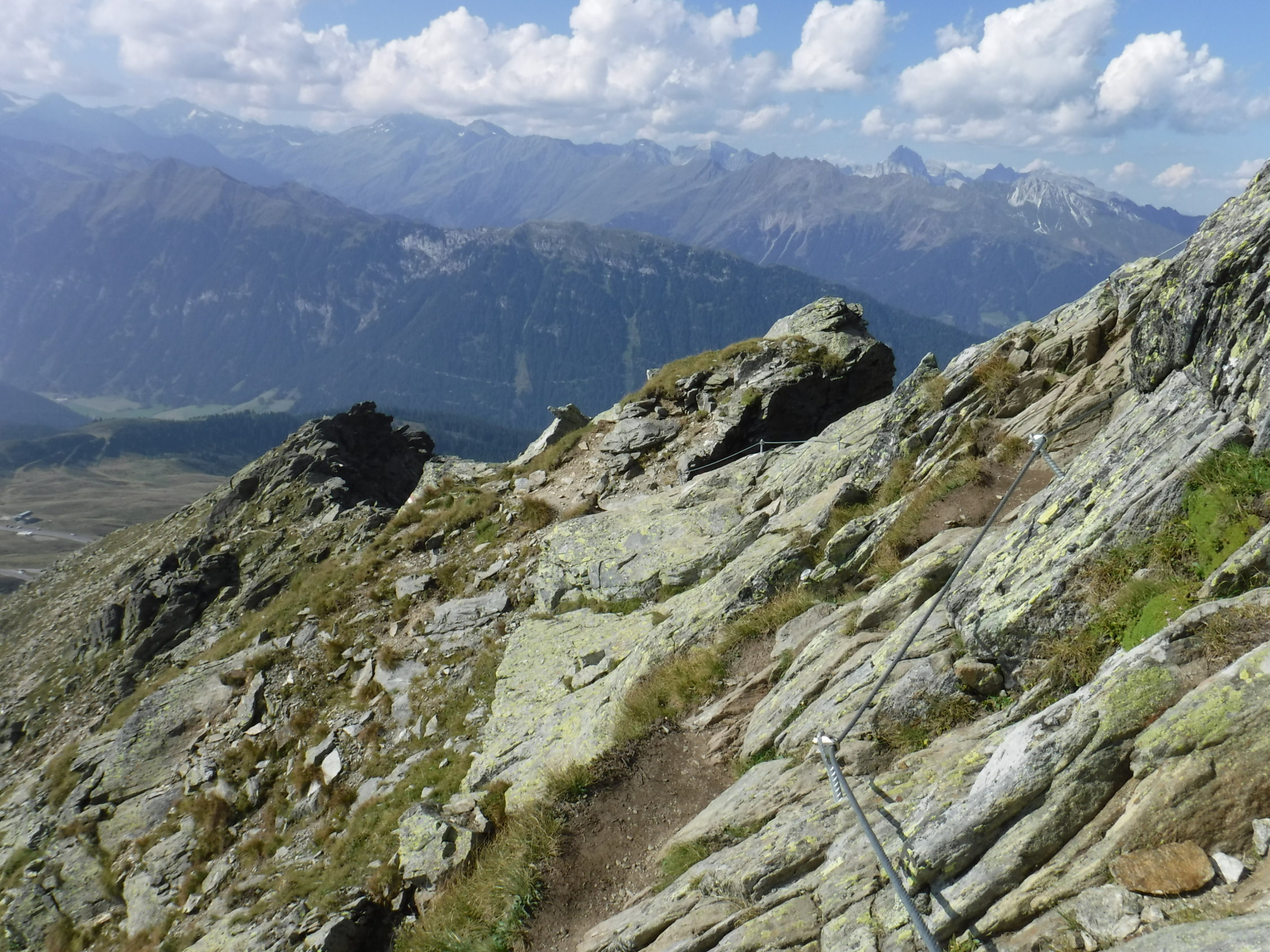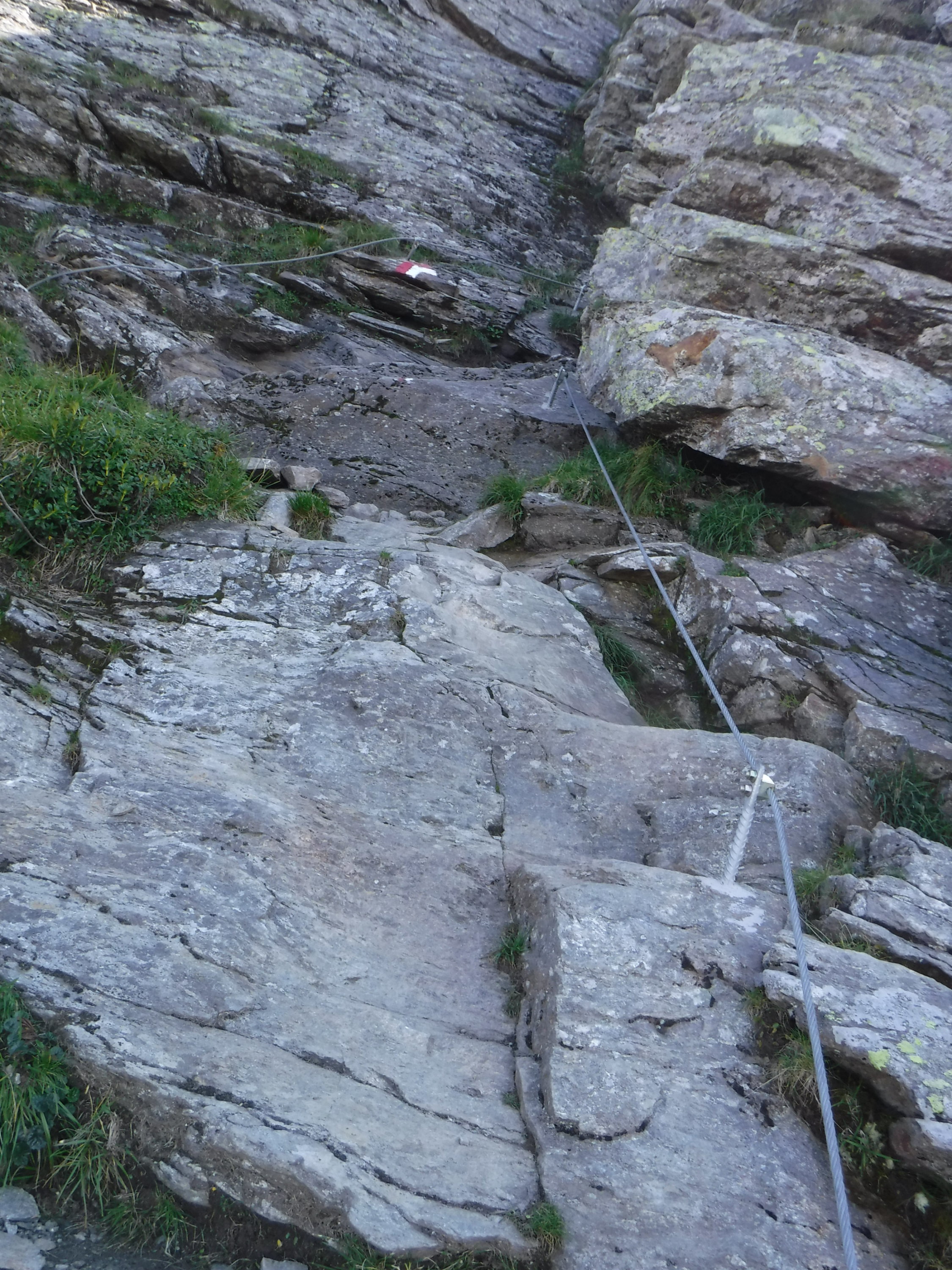 Tourenbeginn um 15:30 Uhr bei heiterem, aber teilweise dunstigem Wetter und leichter West-Bise. Etwas störend wirkt der Motorräder-Lärm vom Jaufenpass. Die Seilabsicherungen sind in gutem Zustand.