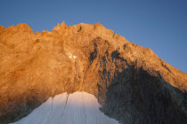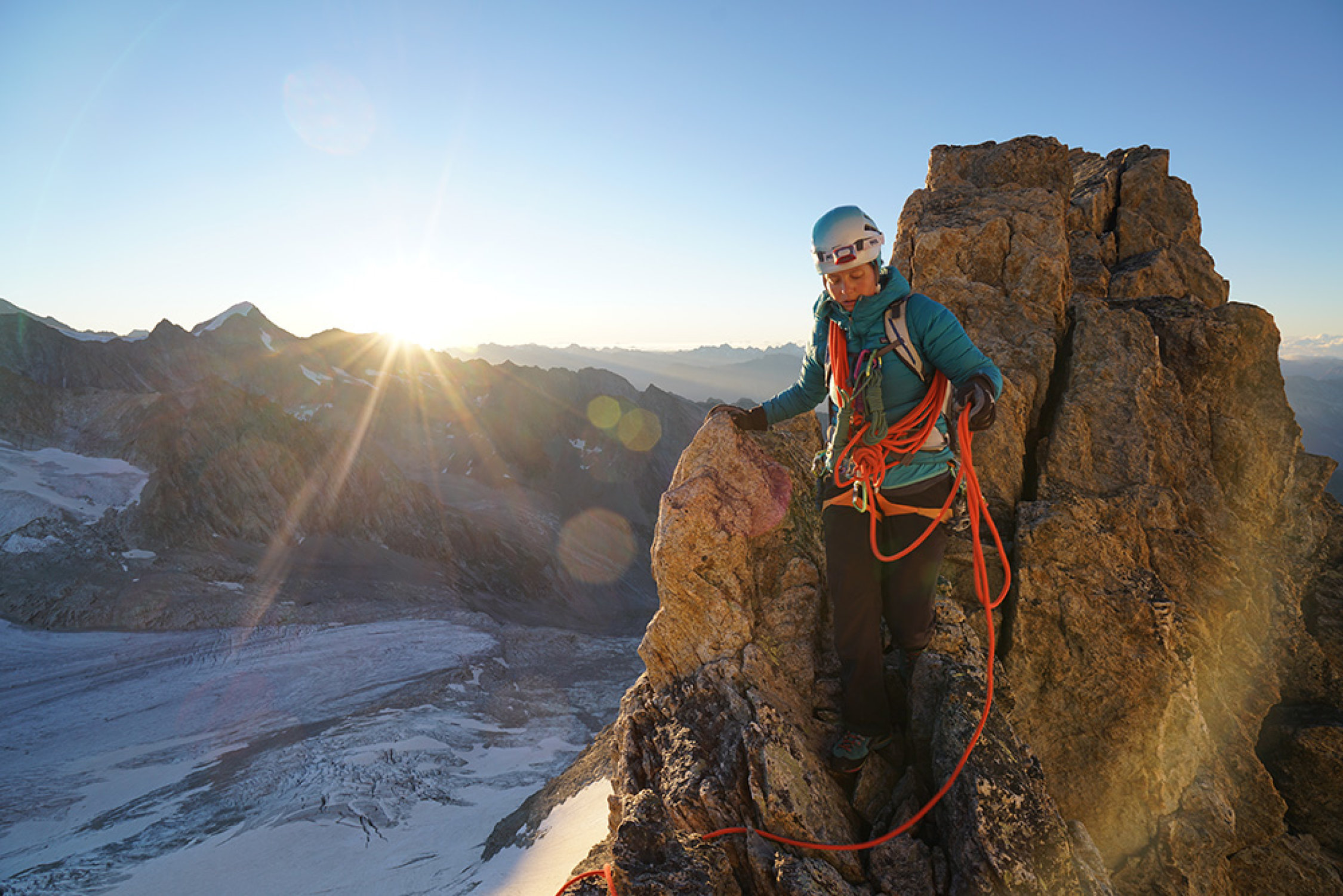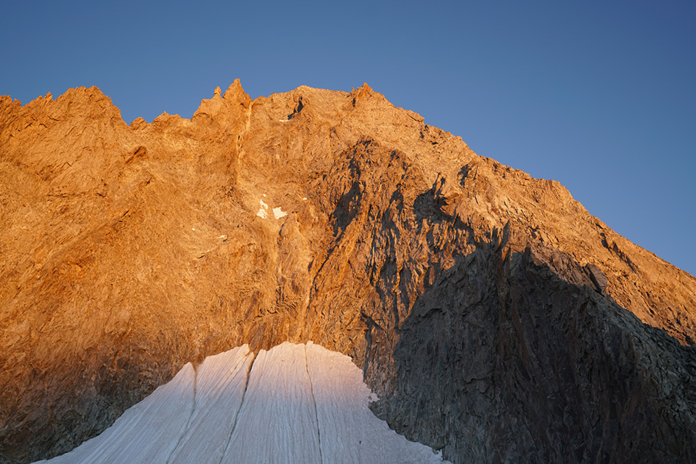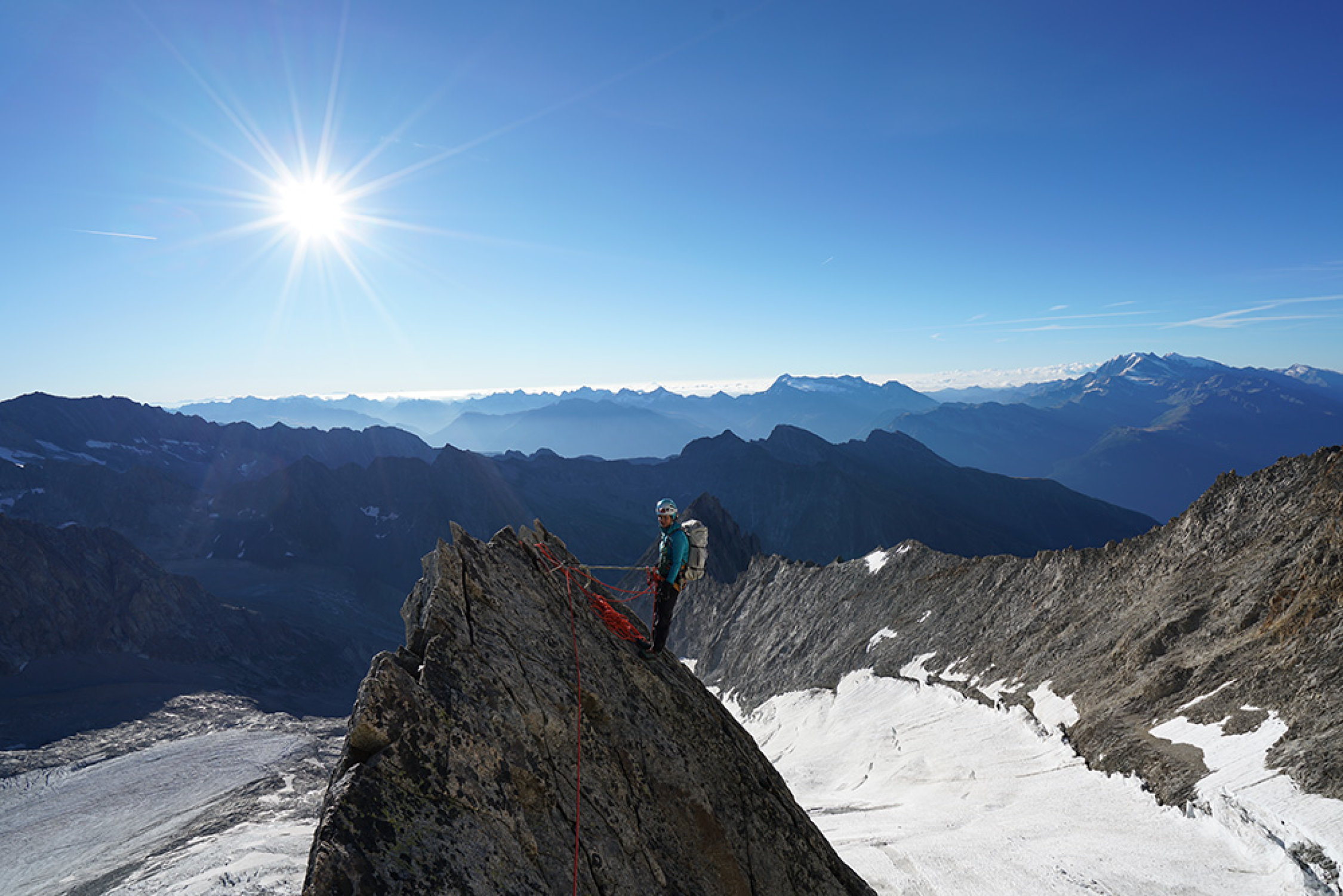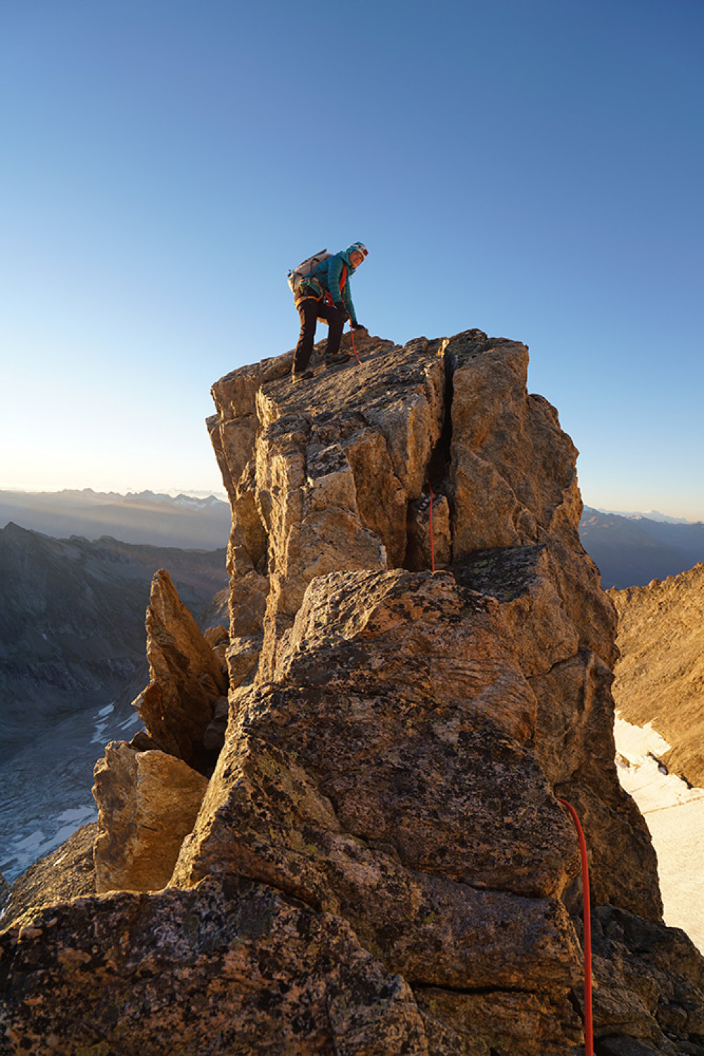 Ganze Route trocken und kein Schnee. Zustieg auf die Ostrippe problemlos, wir sind am obersten Punkt des Schneefeldes in die Rippe eingestiegen (siehe Bild), dies ging sehr gut, nur wenige Meter im Fels, dann ist man auf der Rippe. Im obersten Teil der Rippe ist es eher nicht zu empfehlen in die Flanke rechts auszuweichen, da diese sehr brüchig ist, am Grat geht es gut zu klettern. Abstieg über Westgrat lang, wir haben einmalig am roten Turm abgeseilt.