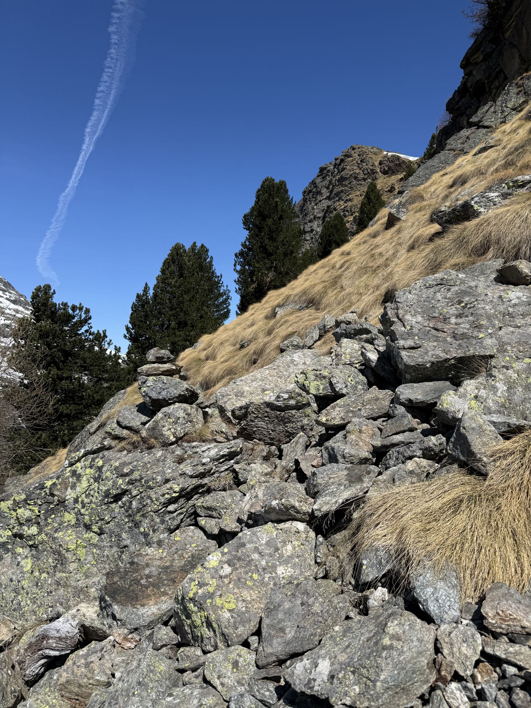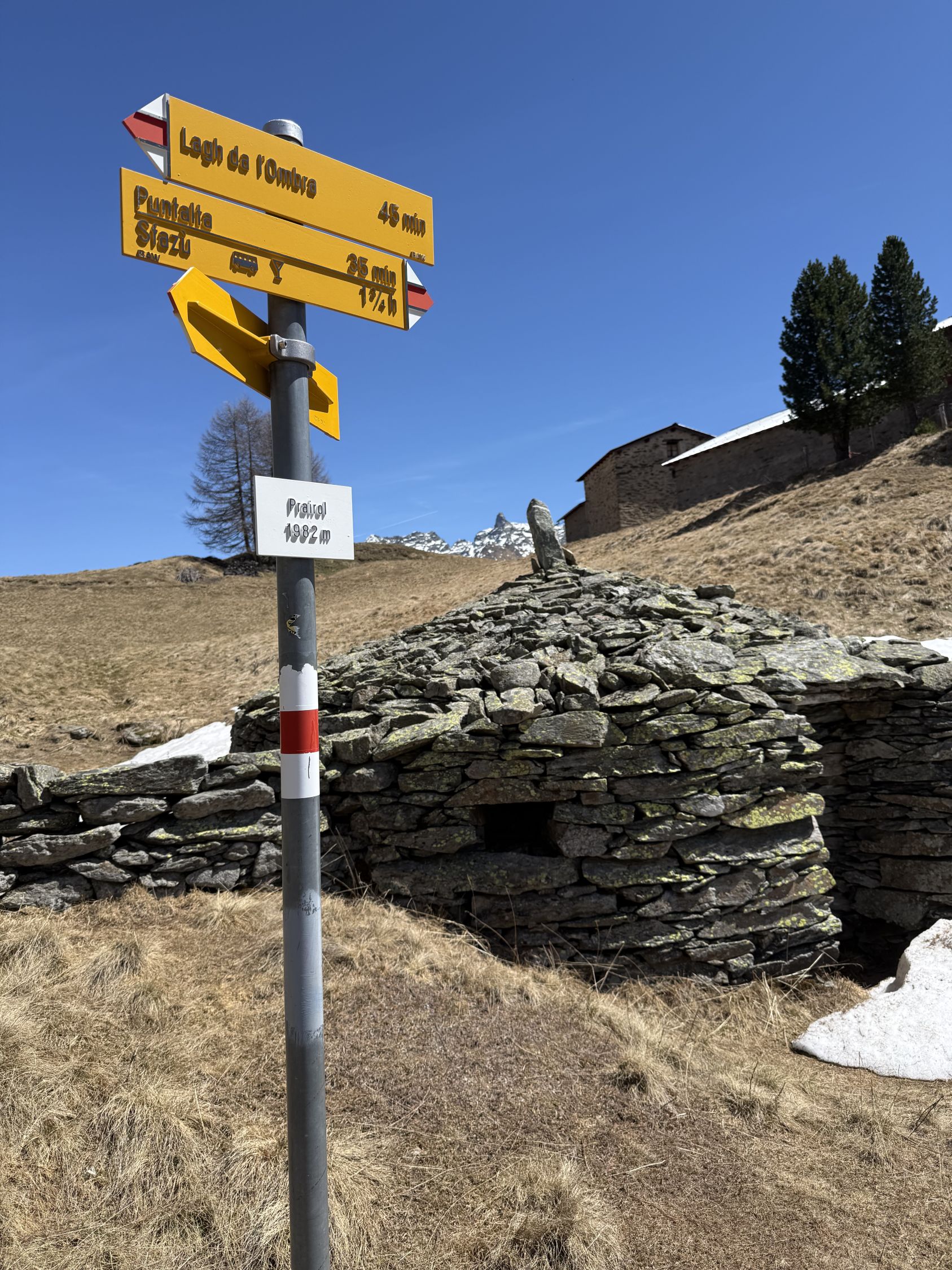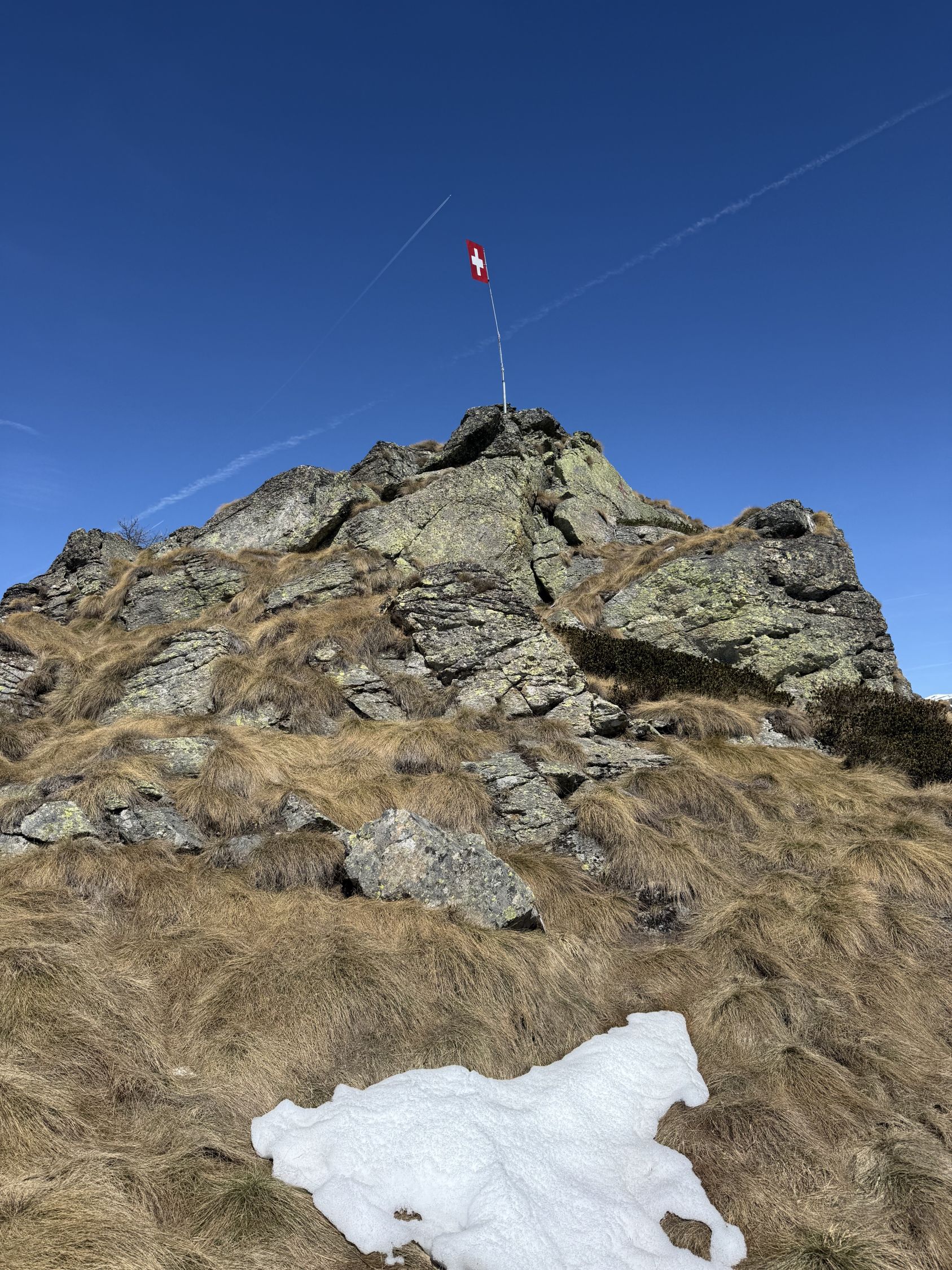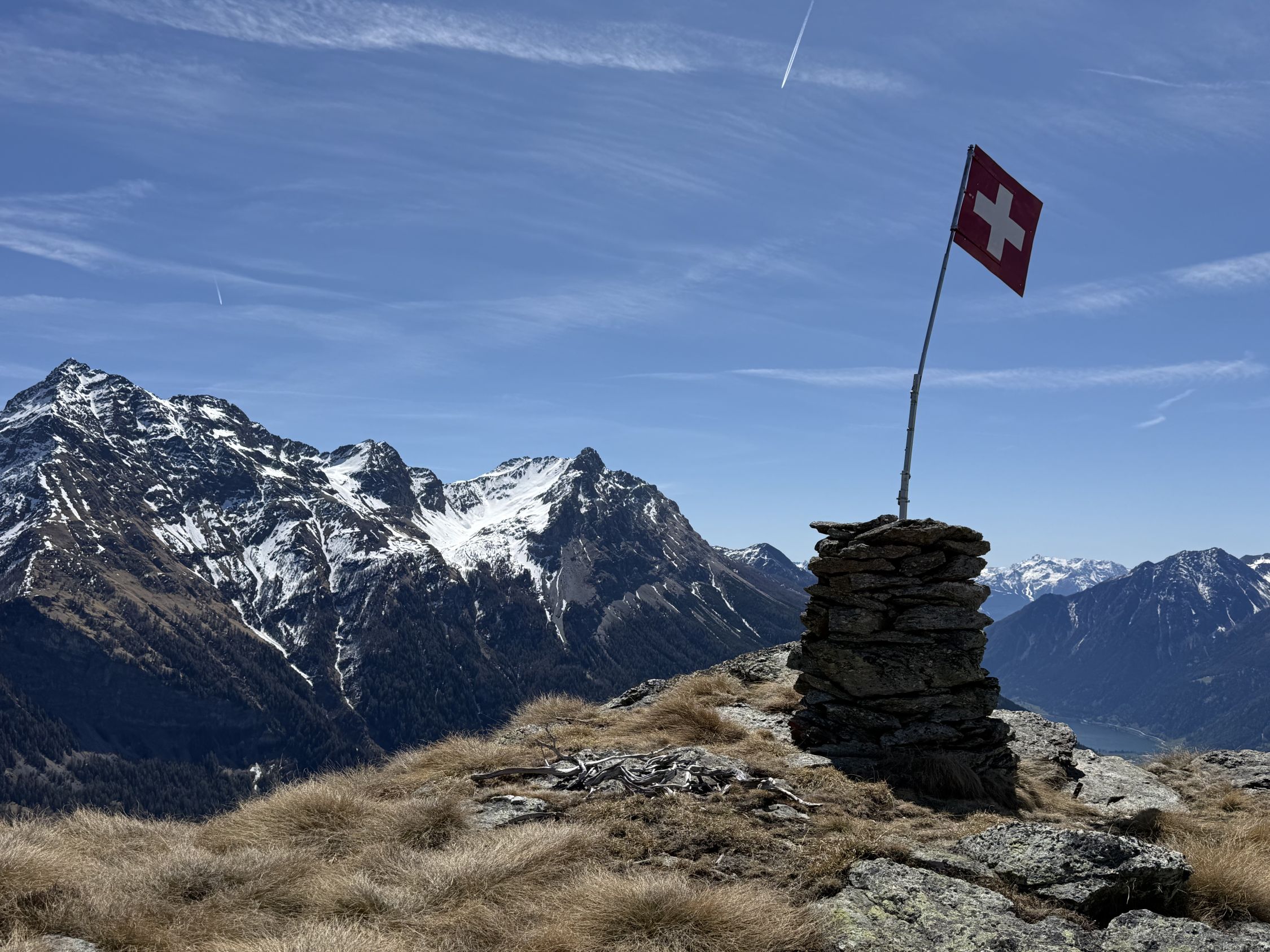 Einsame Tour auf den tollen Aussichtsgipfel hoch über dem Puschlav, ÖV Tour, T5-. Start Cavaglia RhB Station 9.15 Uhr, 5 Grad, starke Bise, blauer Himmel. Zuerst den breiten Alpweg hoch via Dava nach Brüsigon (Prairol) 1976 m. Nun auf kleinem markiertem Weglein Richtung Lagh da l‘Ombra und etwas später weglos auf den Rücken Corn Prairol bis zum Gipfelaufbau. Teilweise Wegspuren. Nun steil und mühsam hoch, rutschiges Gras, Blöcke und Felsen, teilweise über 45 Grad steil zum Gipfel. Abstieg wie Aufstieg.