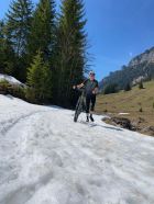 Strasse im Justistal hat im hinteren Bereich noch einige Schneefelder die kurzes Schieben erfordern.
