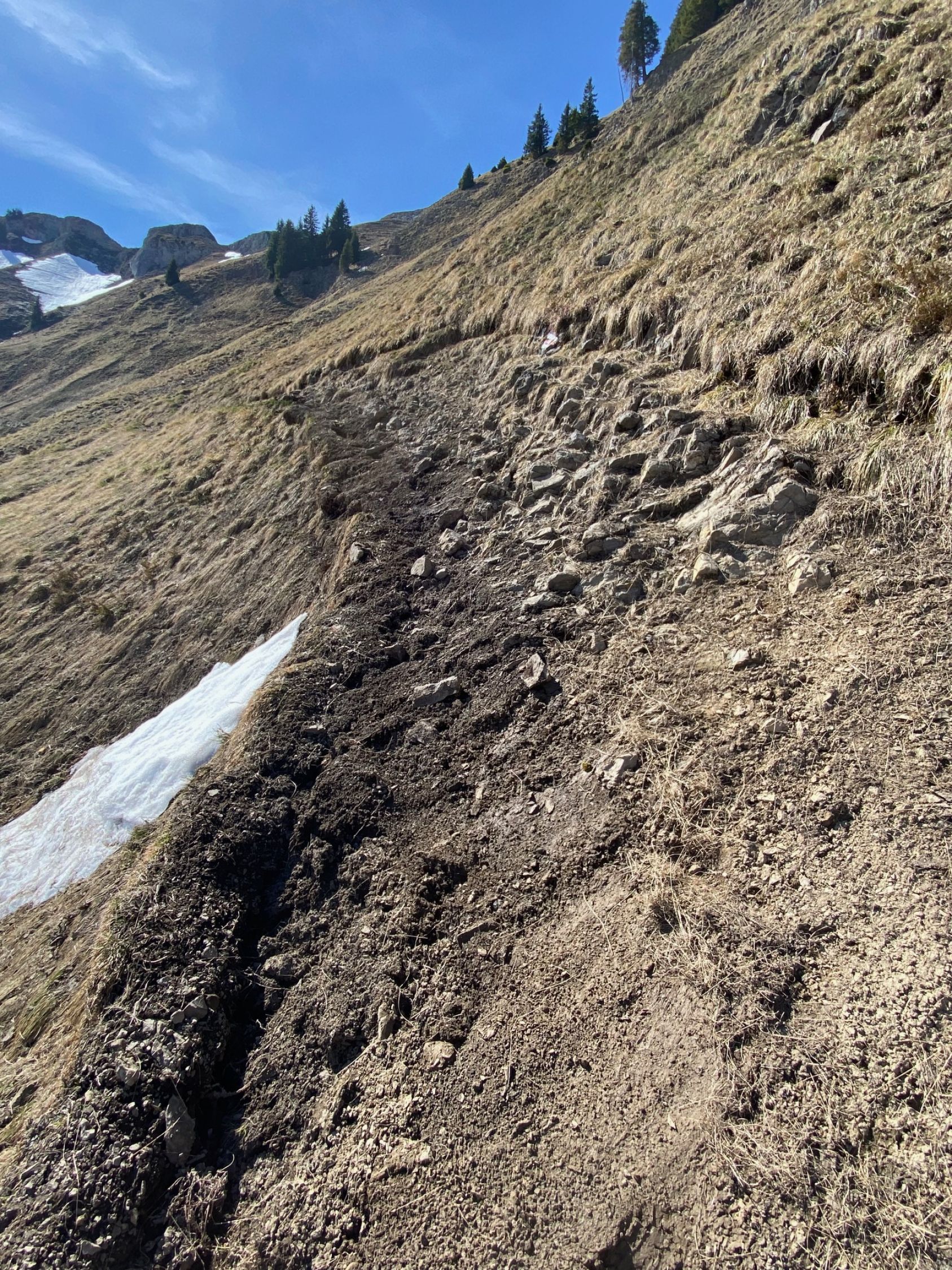 Auf dem Weg zum Burst (ab Abzweigung unterhalb Sichle) hat es mehrere Erd- und Steinrutsche sowie Schneefelder zum Überqueren. Das ist prinzipiell recht gut möglich, allerdings sollte man mit solchem Gelände vertraut sein. Abrutschen darf man nicht. Bei einem grösseren Schneefeld habe ich nur 90hm unterhalb des Gipfels umgedreht. Ist aber auch bis dahin aktuell wunderschön und total einsam