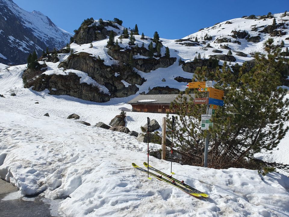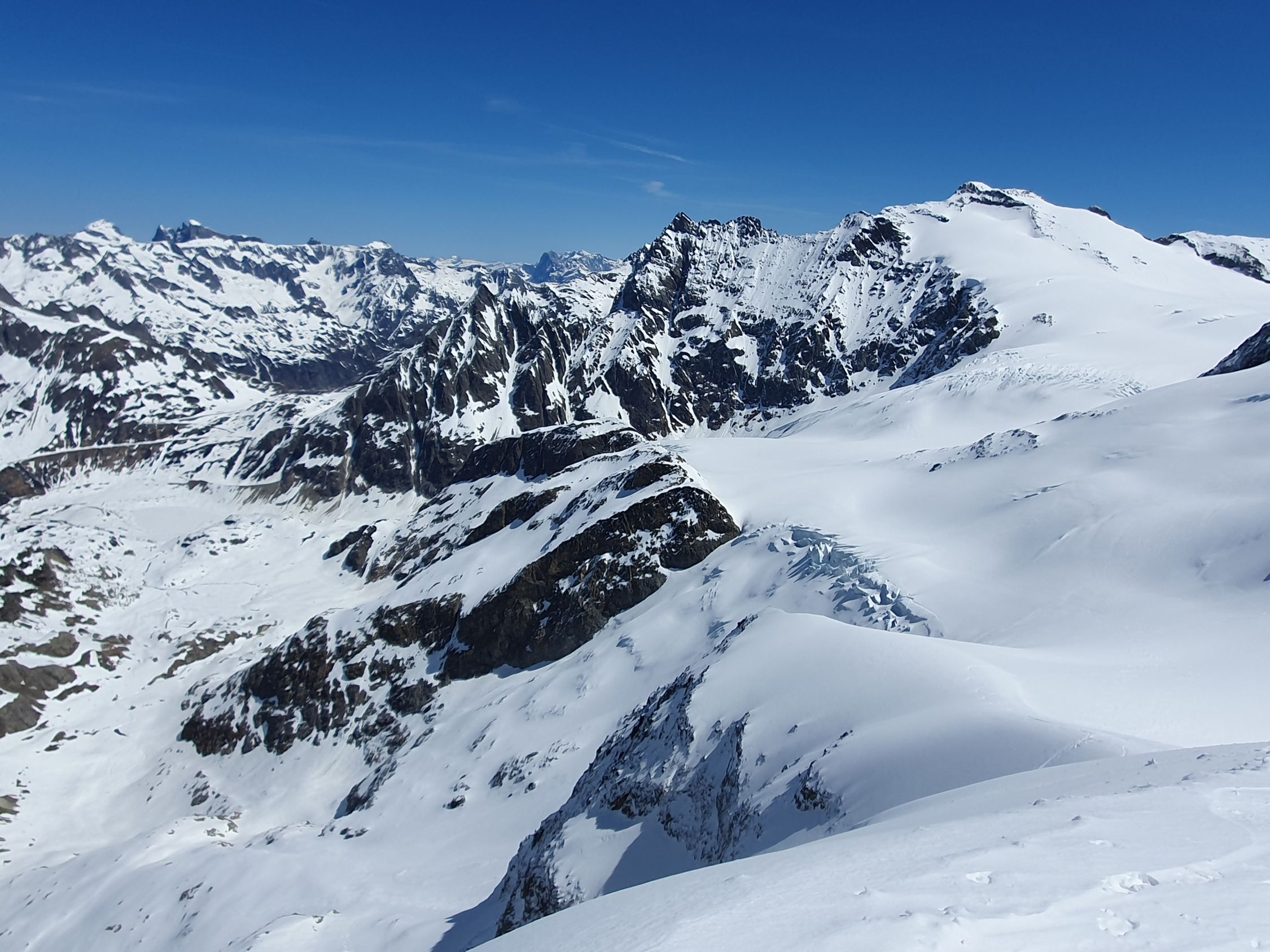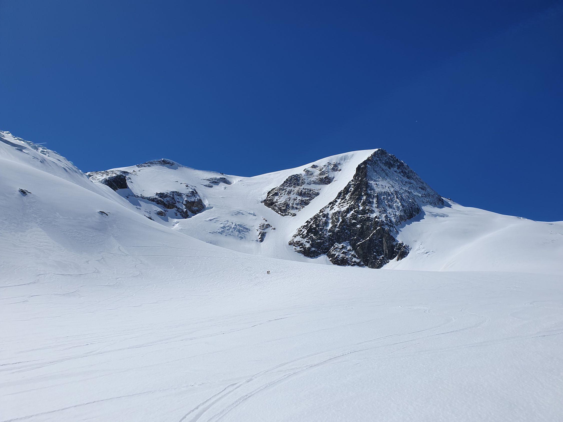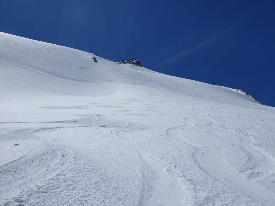 Start um 10:00 ab Steingletscher bei mässigem Wind auf geschlossener und harter Schneedecke neu nun östlich an Chööbärgli vorbei. Eine Gruppe vor der Steilstufe überholt und jemanden bei der Abfahrt in der Steilstufe ausrutschen gesehen.