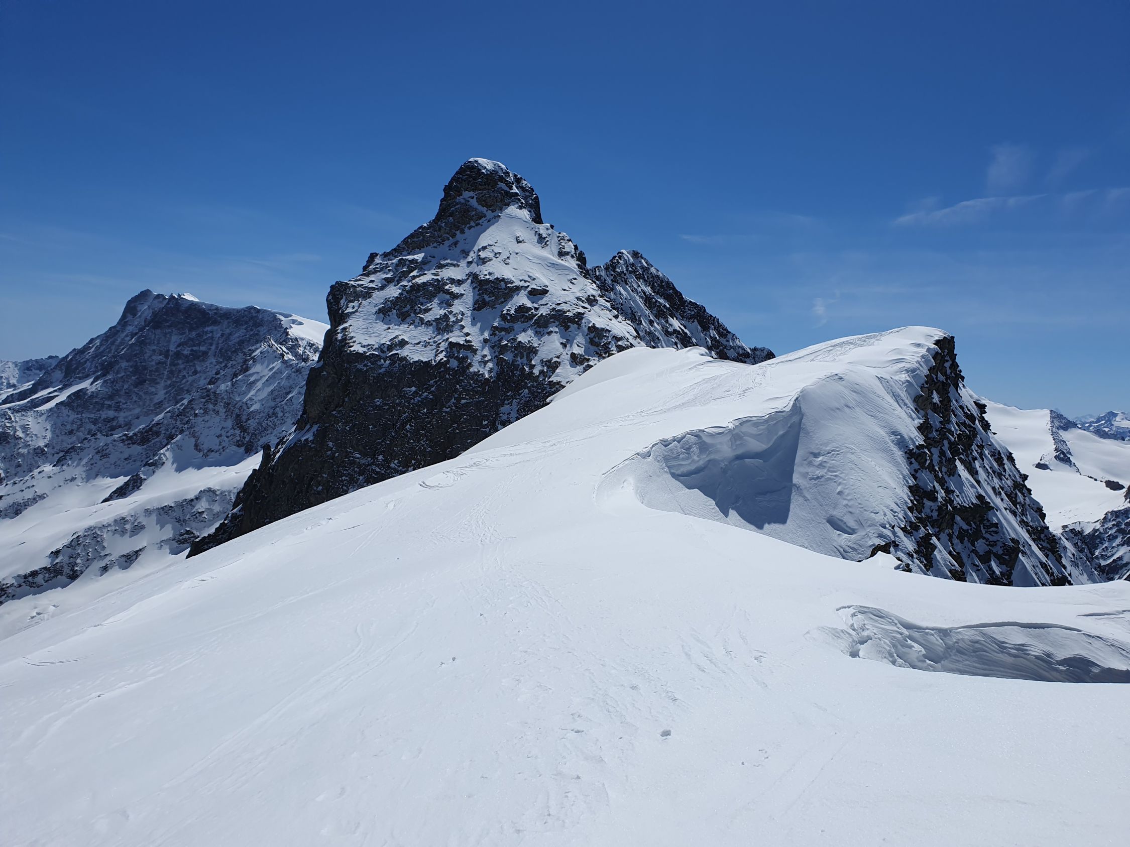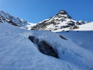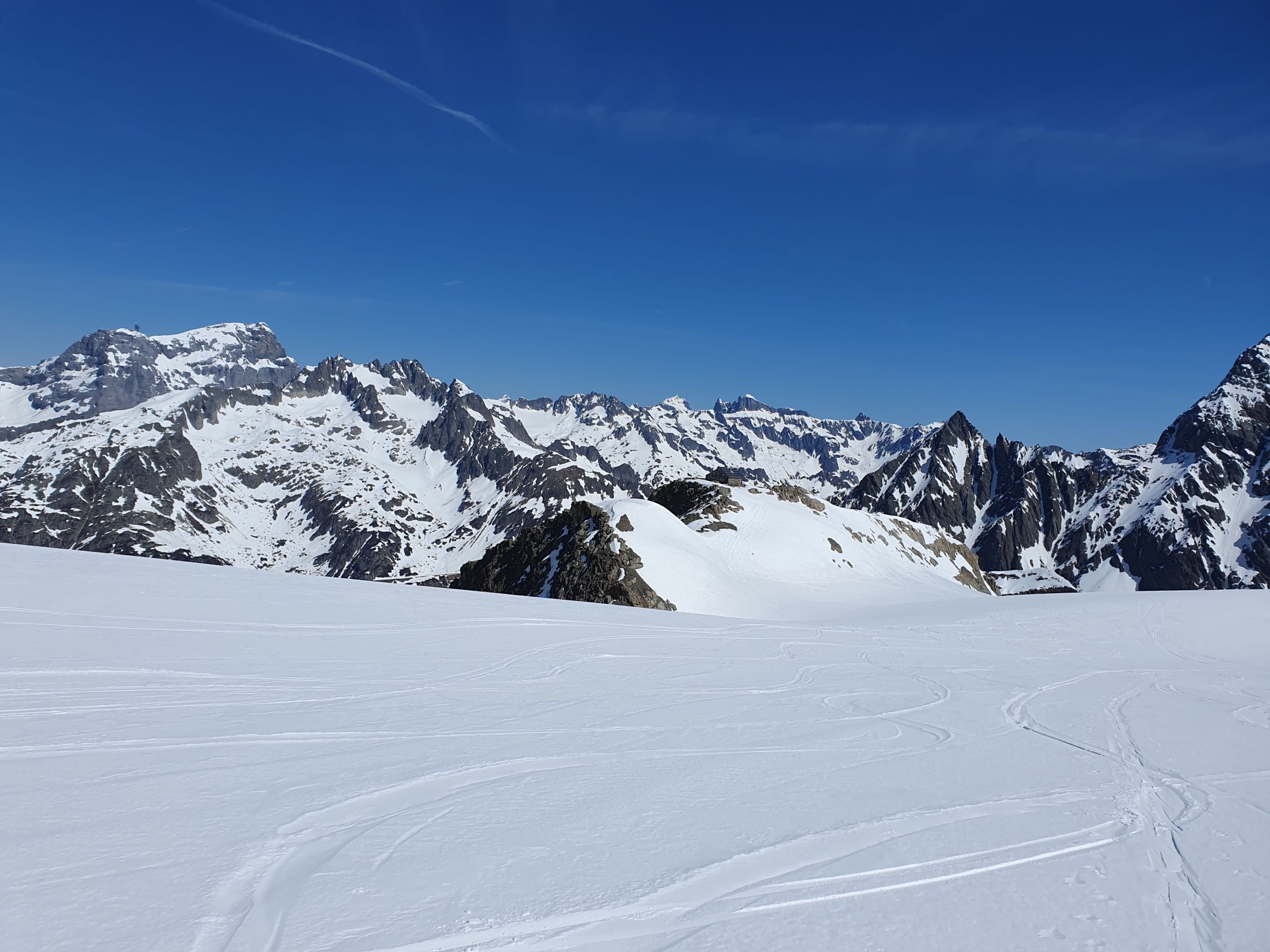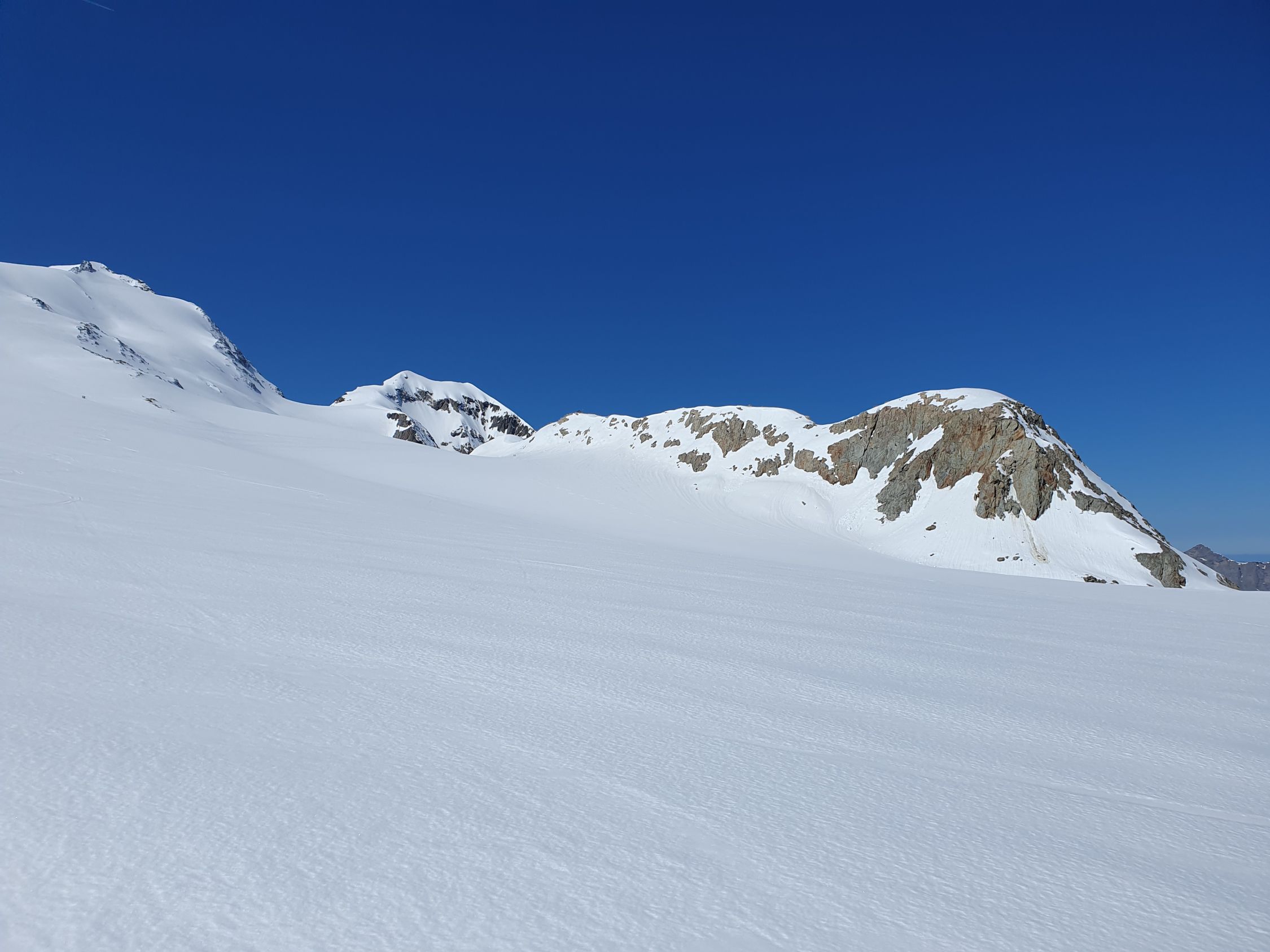 Start um 10:00 ab Steingletscher bei mässigem Wind auf geschlossener und harter Schneedecke neu nun östlich an Chööbärgli vorbei. Eine Gruppe vor der Steilstufe überholt und jemanden bei der Abfahrt in der Steilstufe ausrutschen gesehen.