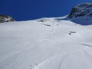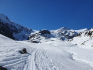 Ich ertappe mich immer wieder, wie ich versuche in den Abfahrtsspuren hochzusteigen, was meine schlangenartige steile Aufstiegsspur erklärt.