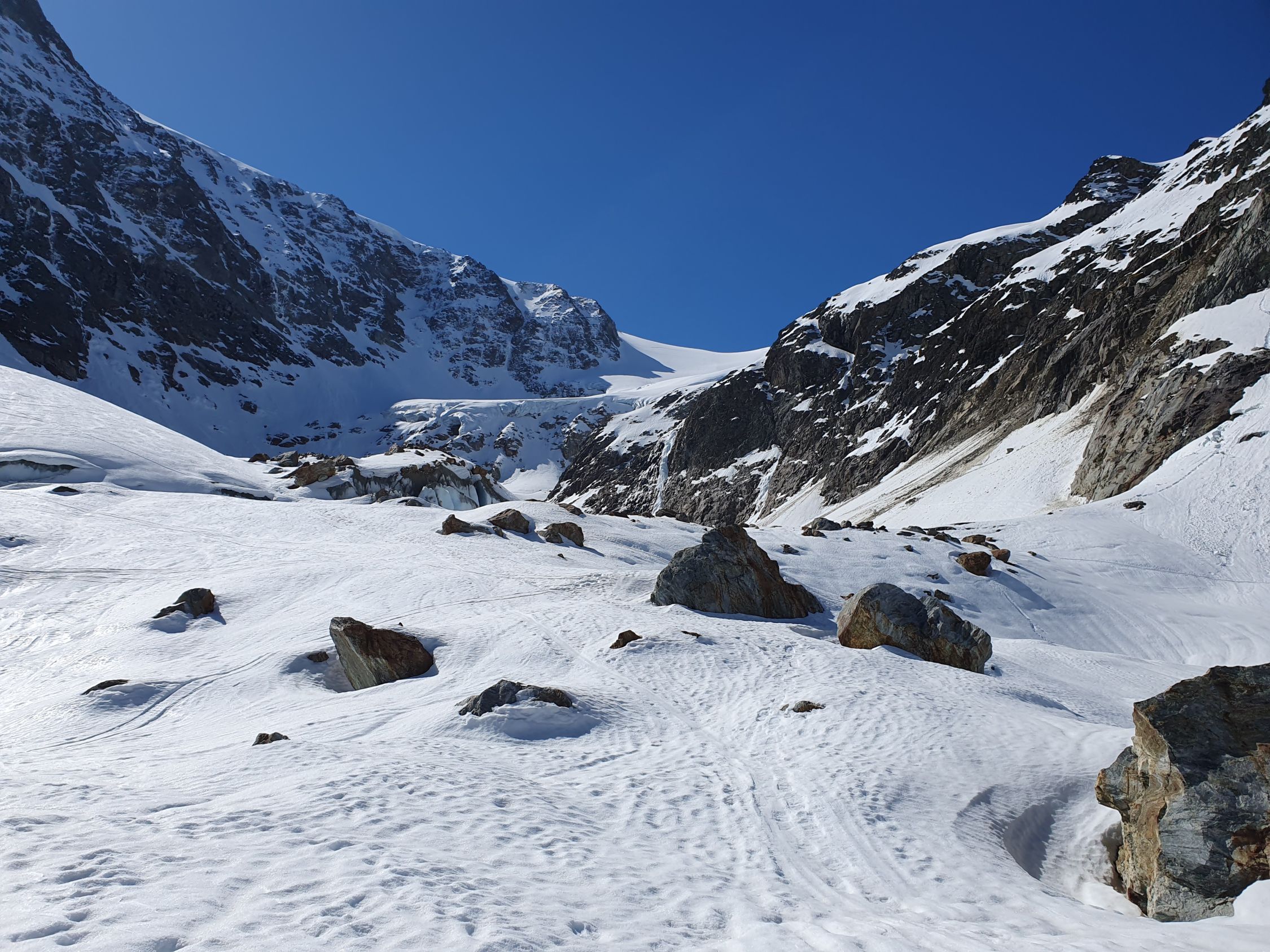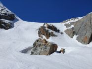 Die Steilstufe wird im Aufstieg laut den Spuren zu Fuss in Trittschnee nördlich, resp. rechts vom Felsen gemacht. Ich bewältige diese steile Passage südlich, resp. links in Aufstiegsrichtung, durchgehend mit Ski ohne Aufstiegsspur und musste da so richtig hochkämpfen, v.a. auch deswegen, weil ich keine Harscheisen draufhatte und die Stelle wegen der abrutschenden Abfahrer meist Hartschnee aufweist. An ein paar kleinen Stellen schaut sogar bereits das Eis hervor. Nichts desto trotz freue ich mich auf die eher flache Ebene, um mich davon etwas zu erholen und ja Hermon, dank meinen aufgeknüpften Hosen den aufgestauten Dampf rauszulassen.