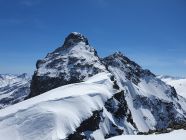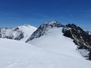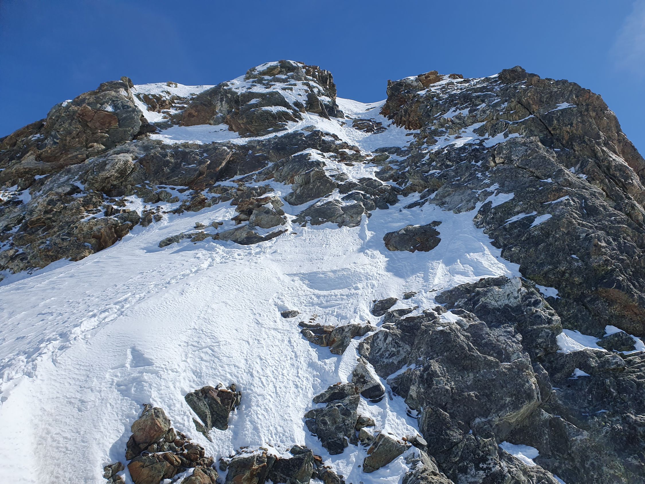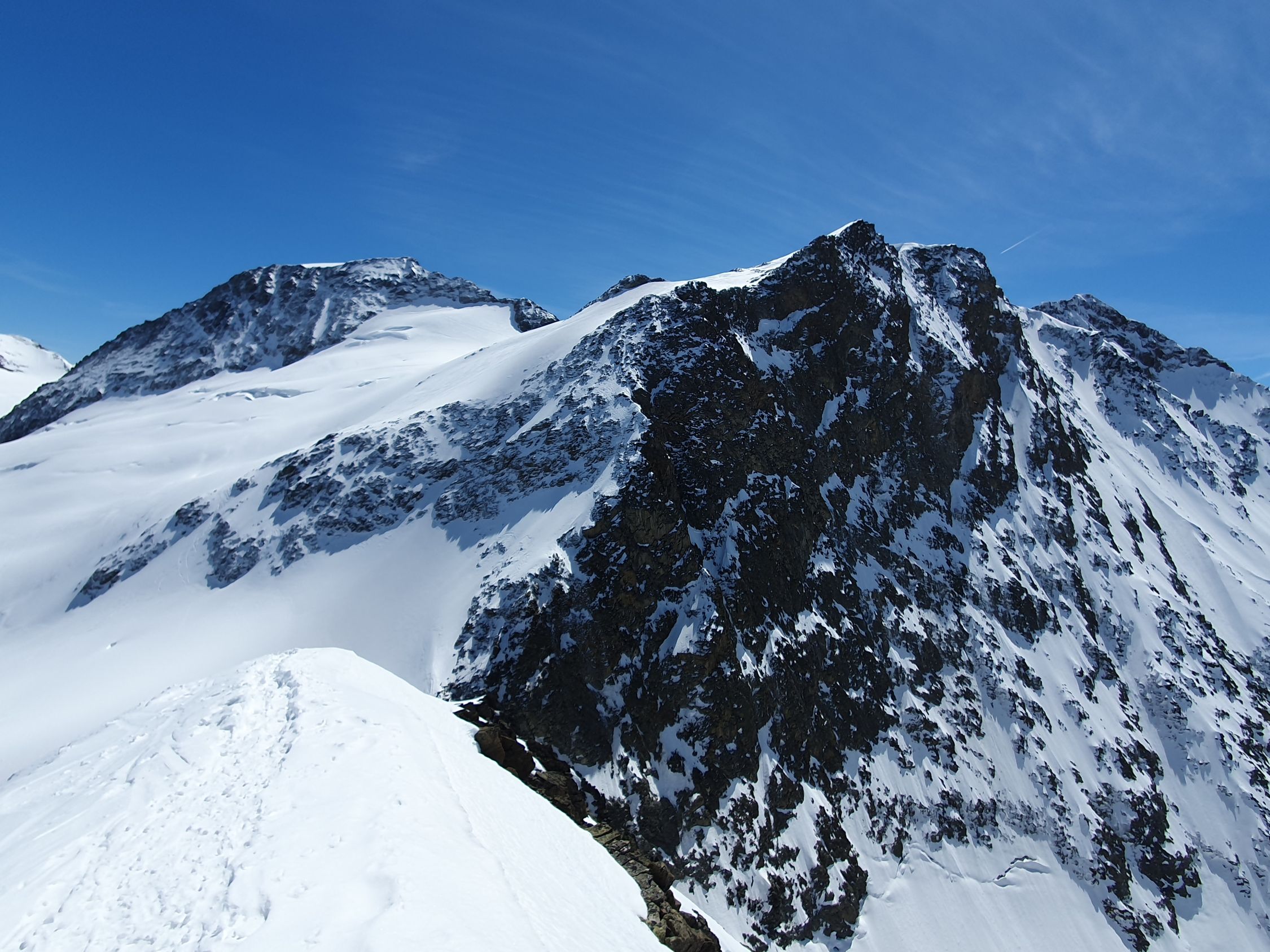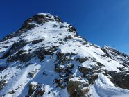 Nach einer kurzen Pause ziehe ich mit den Fellen weiter auf den S-Grat des Mittler Tierberg und mache kurz vor dem Gipfelaufschwung bei 3'300Hm Skidepot. Mit Steigeisen und Pickel ausgerüstet steige ich in losem Schnee, aber dafür auf guten Trittspuren über eine kleine Felspassage, dann weiter im Tiefschnee steil hoch zu einem Couloir. Bis hier sind die Stöcke nützlicher als der einsinkende Pickel. Nun noch steiler in Hartschnee, wo der Pickel besser greift, weiter sehr steil zum Gipfel. Bei den beidseitigen Felsen im Couloir kann ich mich gut mit der anderen Hand halten. Zuoberst- und in der Mitte des Couloirs hat es einen Sicherungsring. Platz hat es auf dem