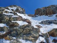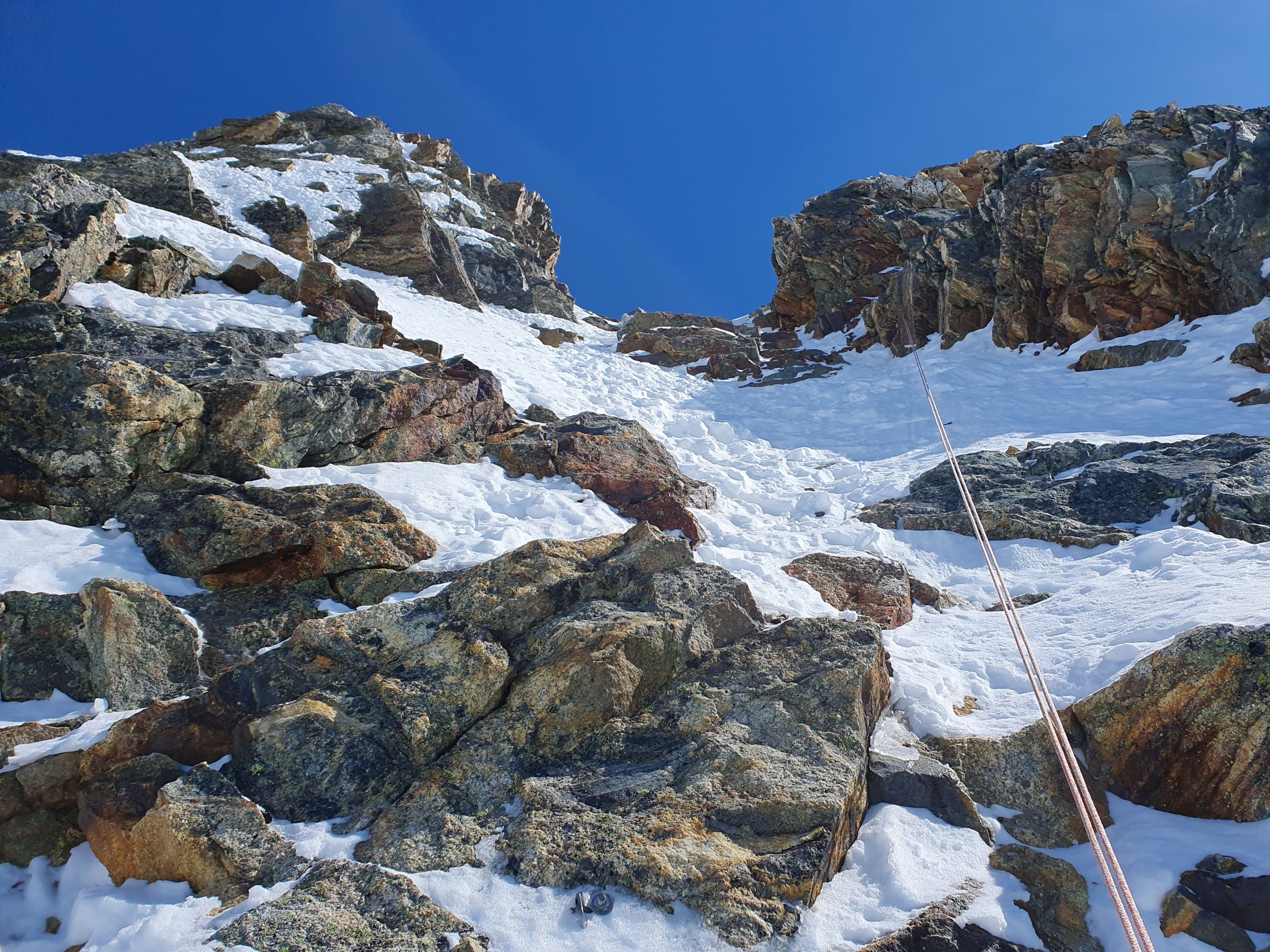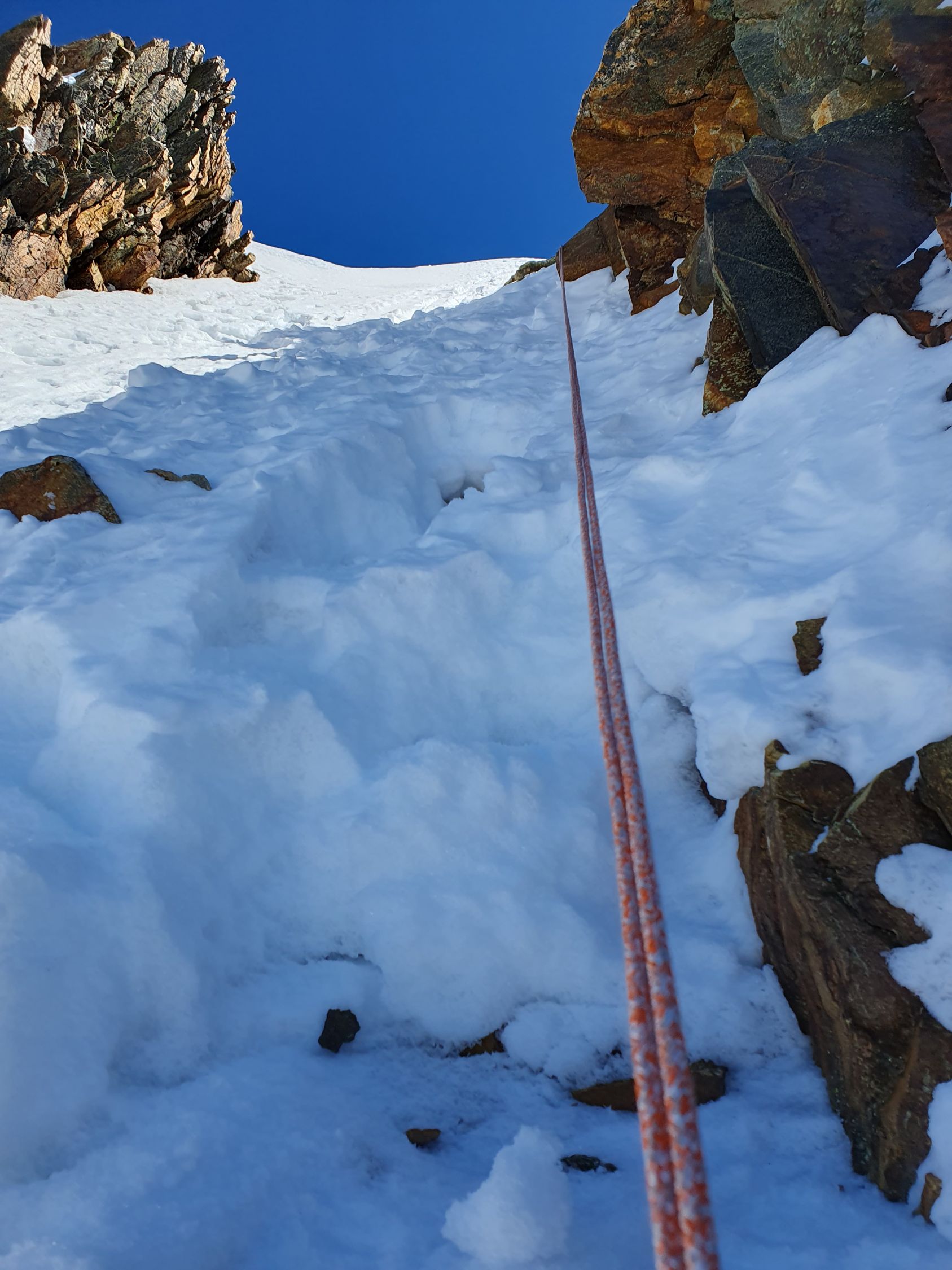 Da ich für dieses Couloir, auf Anraten, heute extra ein Seil mitgenommen habe, möchte ich es auch einsetzen. So seile ich mich 2 x 20 Meter hinab und gehe dadurch kein Risiko ein, allenfalls beim Abstieg auszurutschen. Es würde jedoch auch ohne gehen.