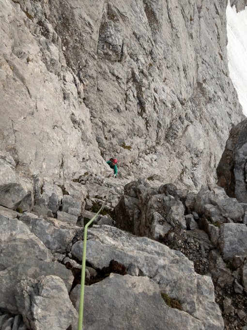 Beim Einstieg in die Rippe zogen wir wohl zu früh links auf den Grat. Bänder rechts unten sahen angenehmer aus, als der nasse Riss, der uns auf die Gratkante führte. Grundsätzlich kann man für die ganze Route sagen, dass man wohl falsch ist, wenn es zu schwer wird.