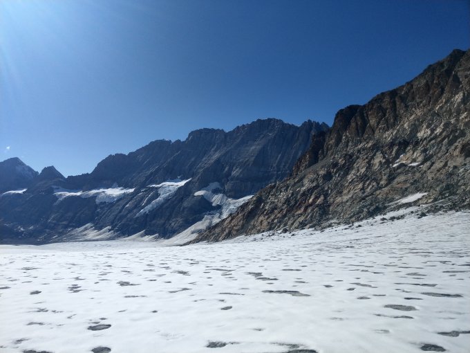Zustieg mit Schlaufe über den Gletscher. Abstieg direkt über Morgenhorn-N-Flanke. Hier blieb der Schnee vom Wochenende liegen. Mussten nur eine Länge mit Schrauben sichern.