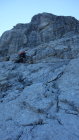 Im Gegensatz zu anderen Tourenberichten empfanden wir die Schwierigkeitsbewertung (II-III)als angemessen. Der gebräuchliche Einstieg (direkt vom Vorbau weg, wo im Topo "kleine Scharte" steht) ist gut machbar.