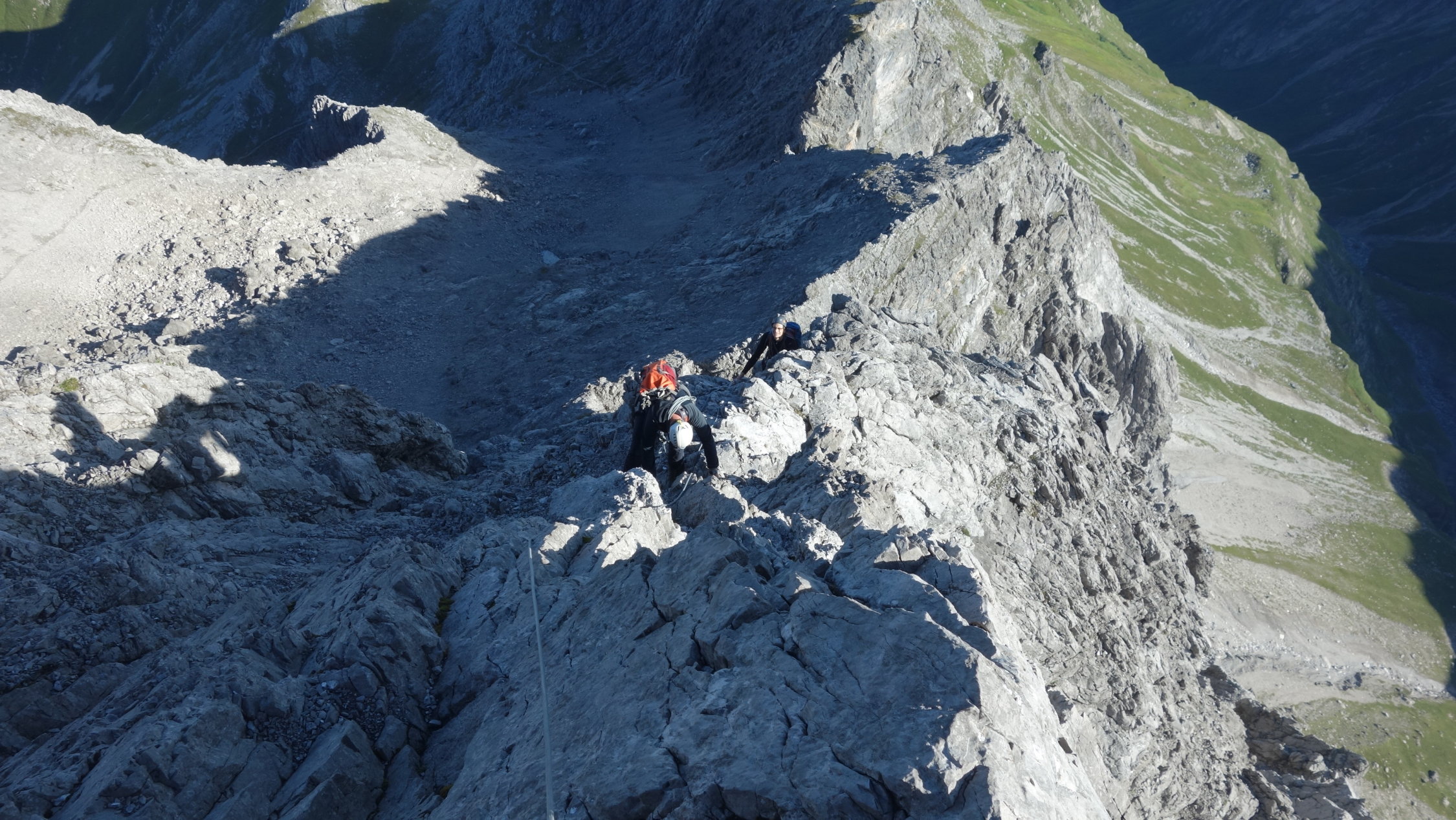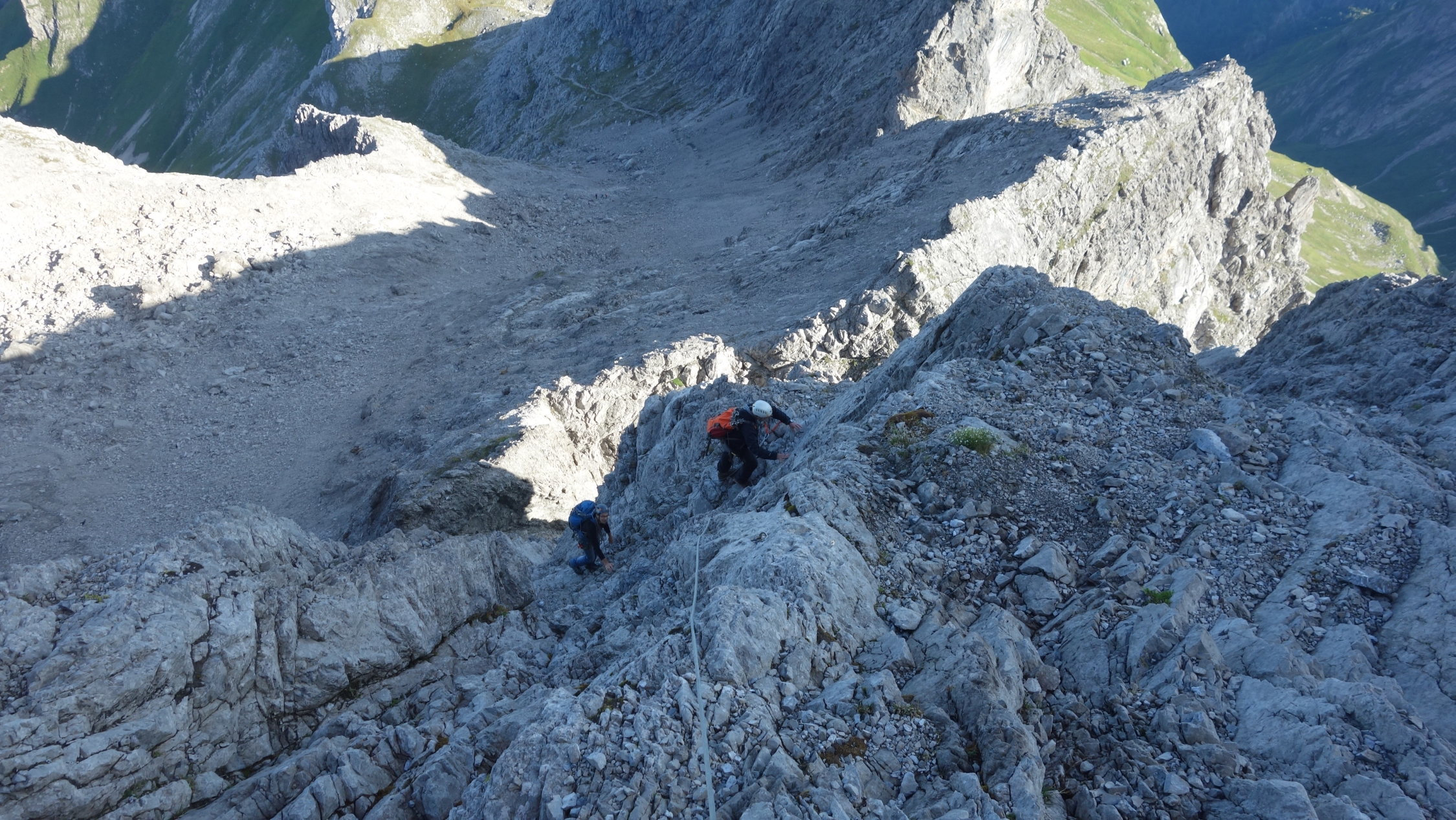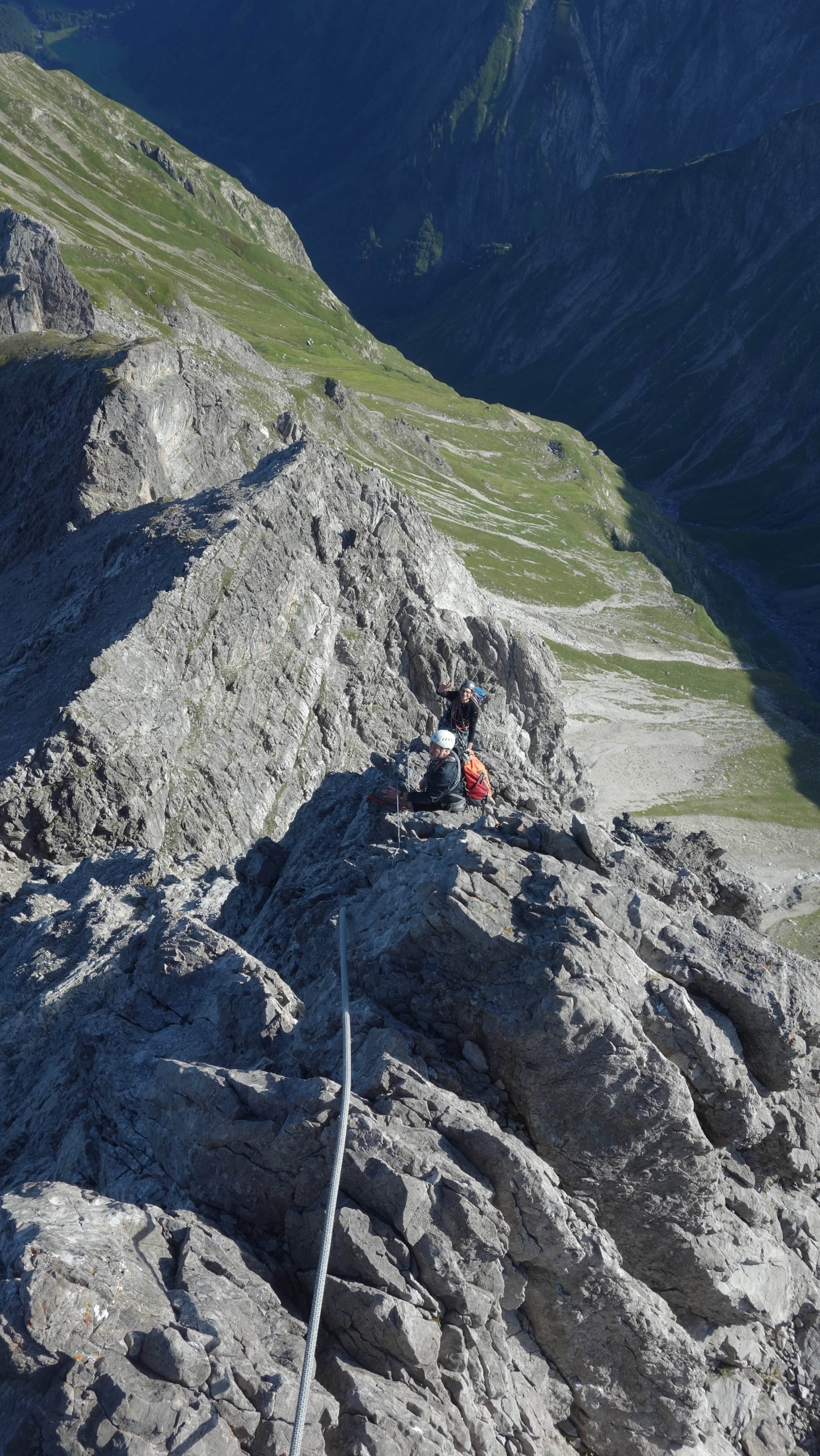 Wir sind am laufenden Seil gegangen, im Nachhinein würde ich es auch frei machen. So haben wir auch den Abstieg gemacht. Es hat aber mindestens 4 Abseilstände und verblasste rote Markierungen, zwei Stellen sind etwas ausgesetzt.