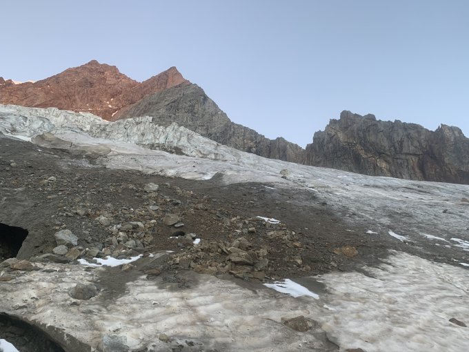 Fels komplett trocken. Gletscherpassage aper, Schneeauflage lediglich noch im Bereich der Felswand, die den Sustenhorn Ostgrat begrenzt. Schrund mit einfachen Schritt passierbar. Windstill, warm.