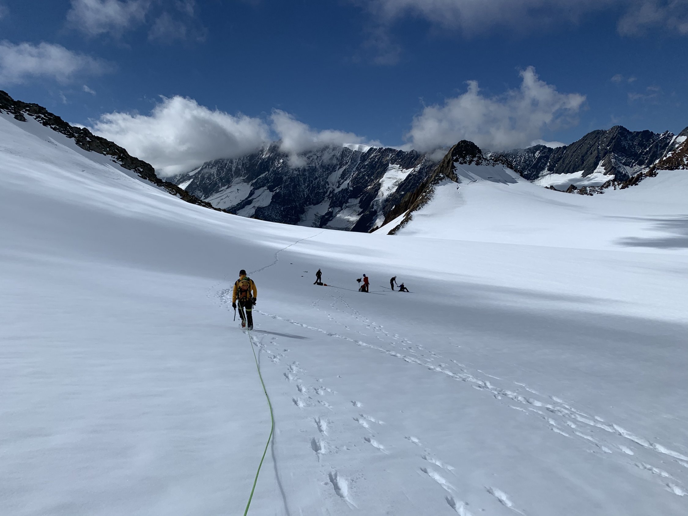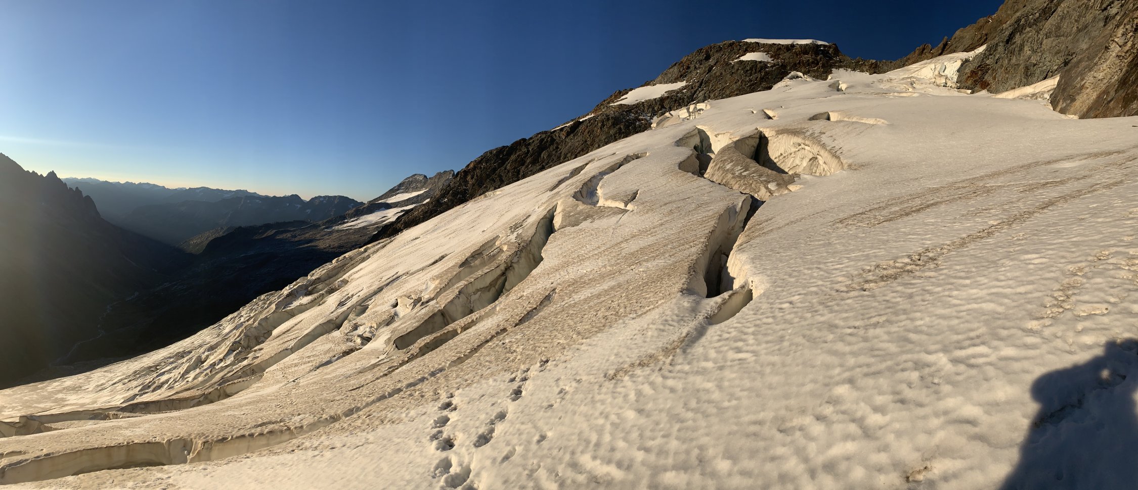 Abstieg bis Sustenlimi auf angefrorener Neuschneeauflage. Brunnenfirn mit einigem kleineren Spalten im Abstieg zur Chelenalphütte.