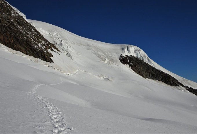 der Neuschnee vom vergangenen Wochenende (28.-30.8.) hat dazu beigetragen dass wir sehr gute Verhältnisse angetroffen haben. Angenehme Temperaturen, Zustieg zum Alphubeljoch hart gefroren. Ab dem Joch auf guter Spur via Ostflanke zum Gipfel. Die Eisnase gemäss Auskunft von anderen Alpinisten, die wir auf dem Gipfel angetroffen haben, sehr gut zu begehen.
