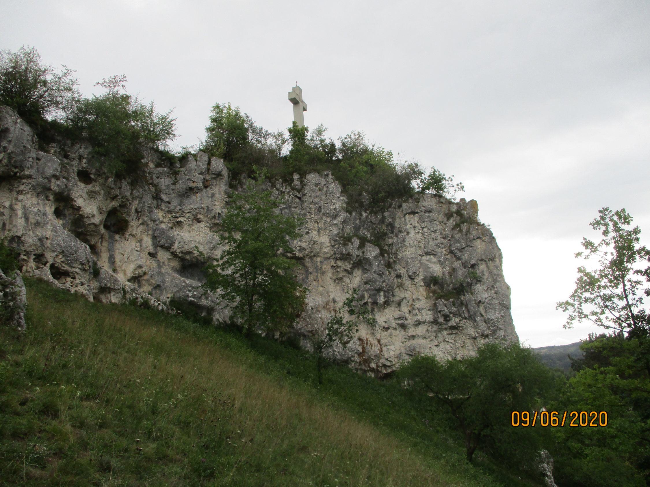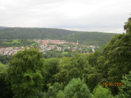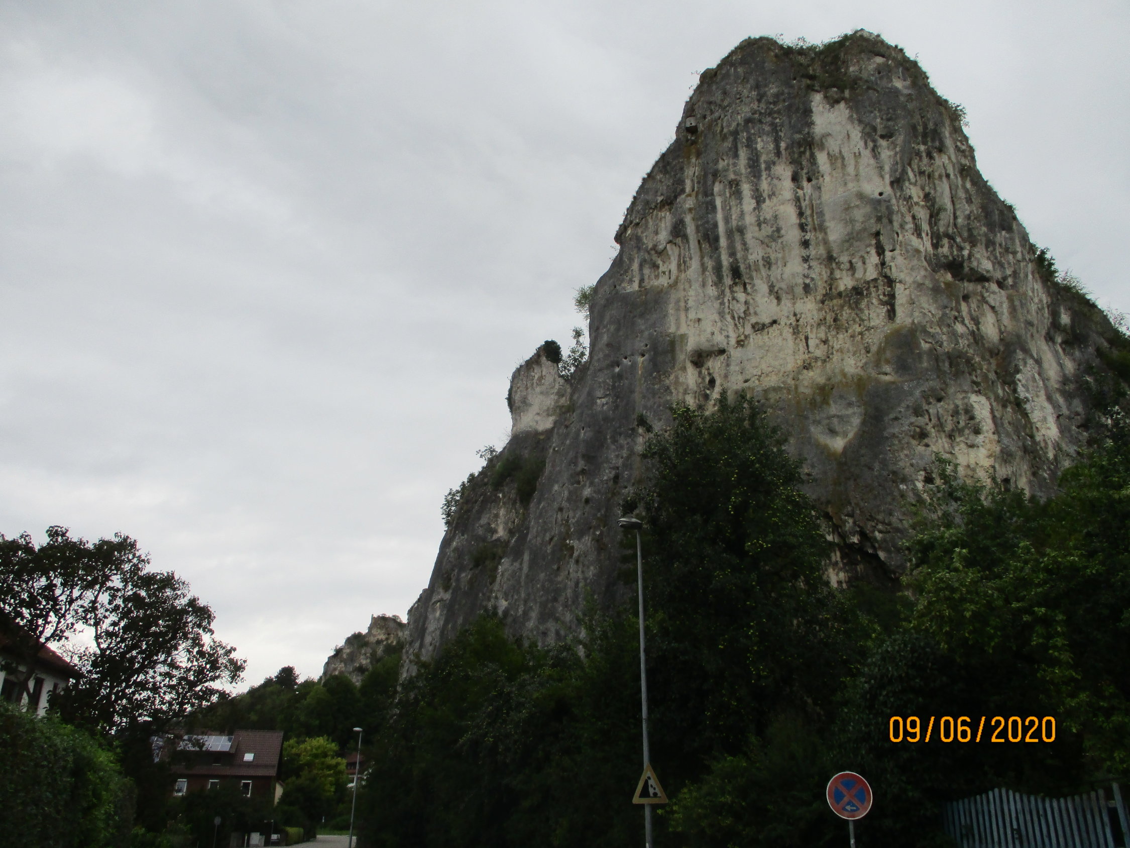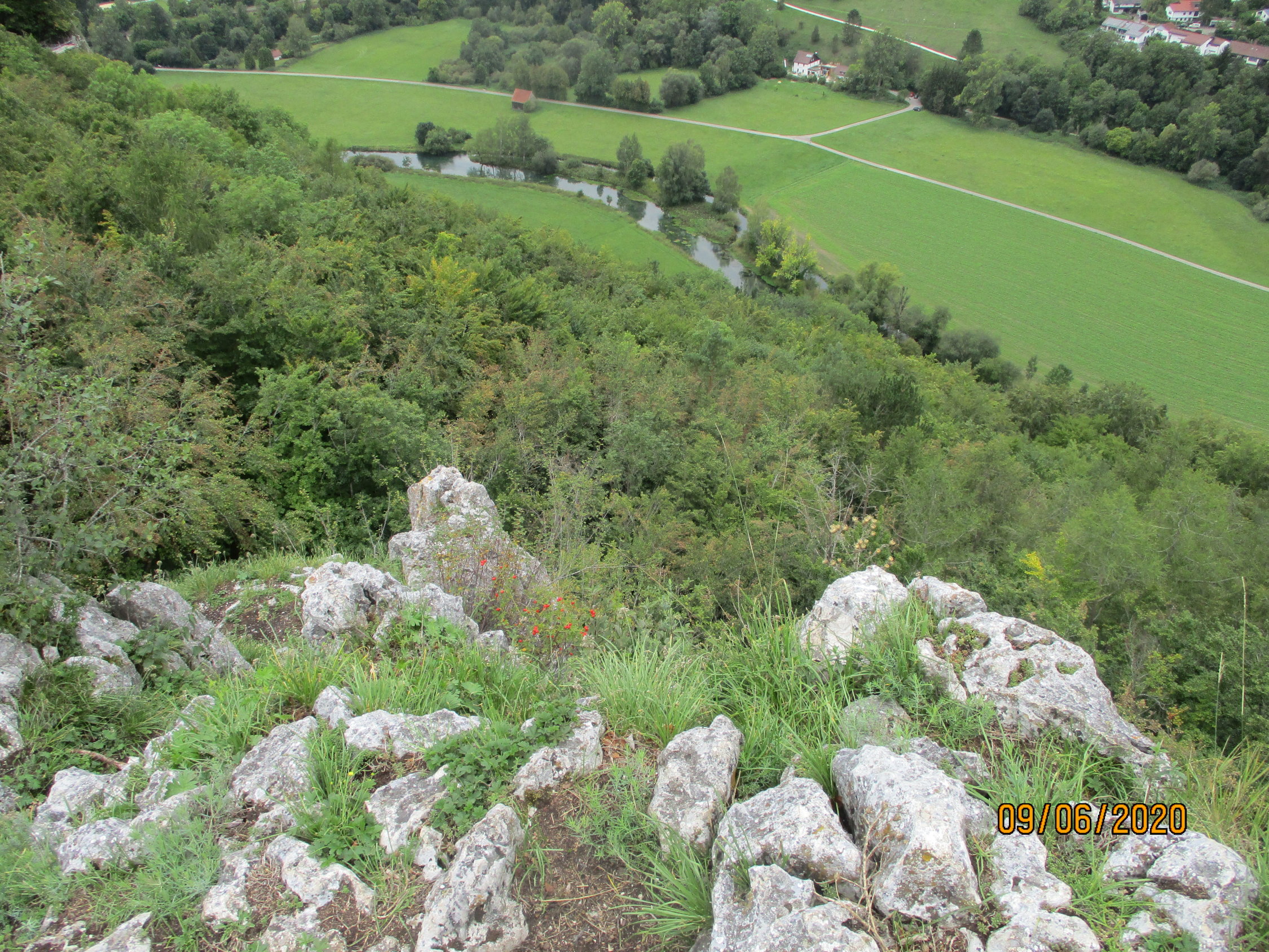 Weiter Richtung Sonderbuch, der Ort wird an seinem Rande passiert. Am Ortsschild überqueren wir die Straße und folgen einem Naturpfad durch den Wald. Bei einem Kriegerdenkmal bietet die dortige Hangkante eine erste schöne Aussicht über das malerisch in einen Talkessel und hufeisenförmig um eine Bergkuppe herum sich schmiegende Blaubeuren. Weiter geht es nun zum ebenfalls aussichtsreichen Knoblauchfelsen (668 m). Den Felskopf erreichen wir durch einen kurzen Abstecher.