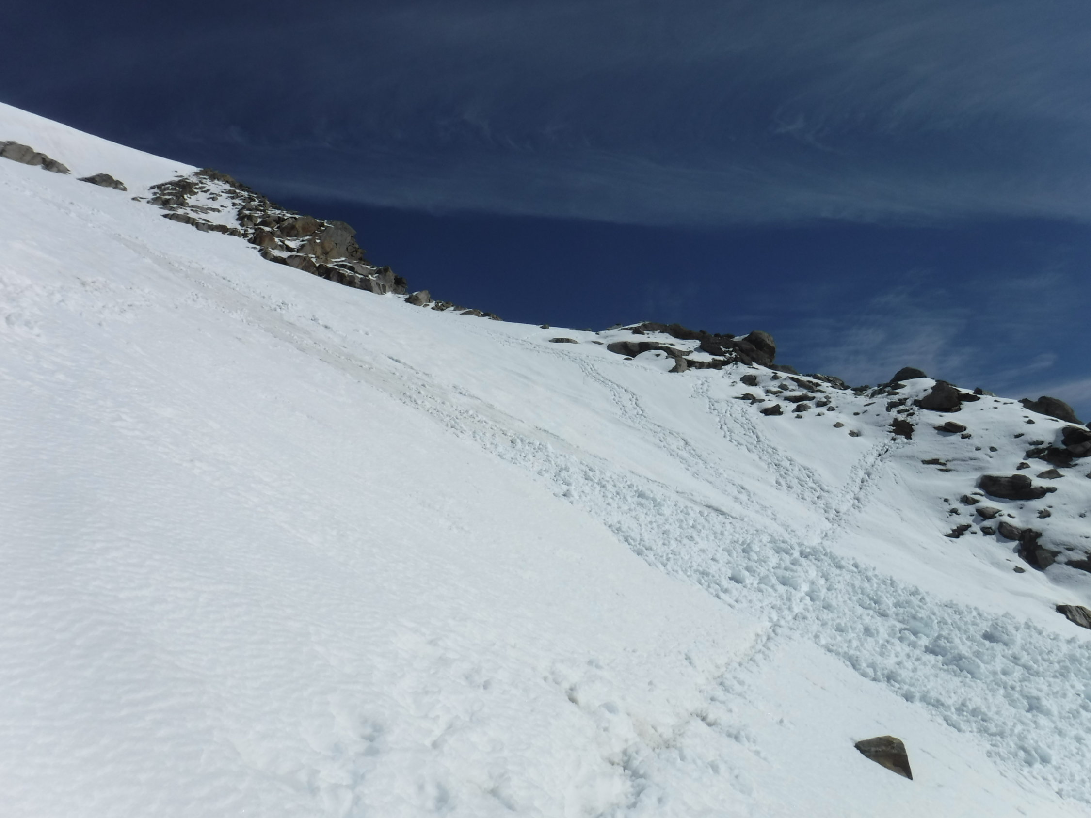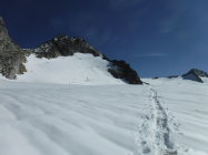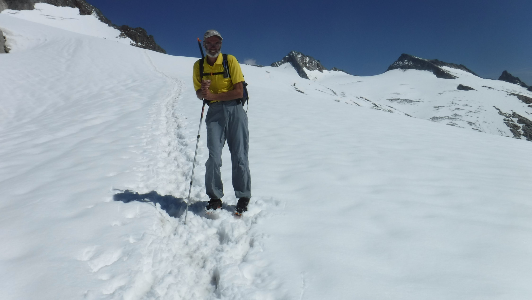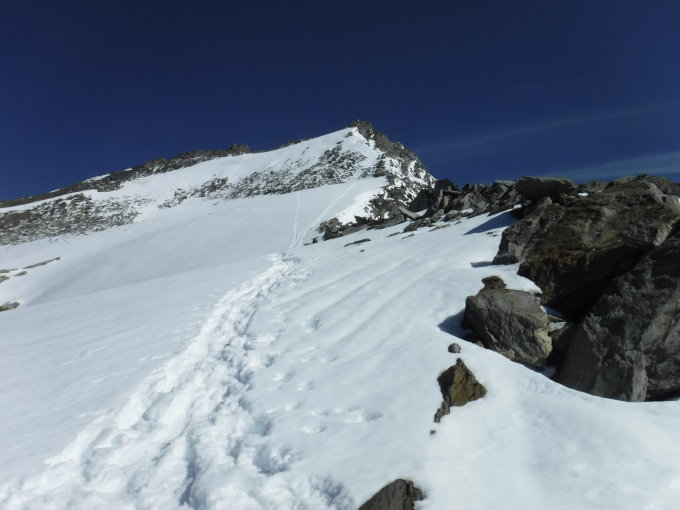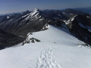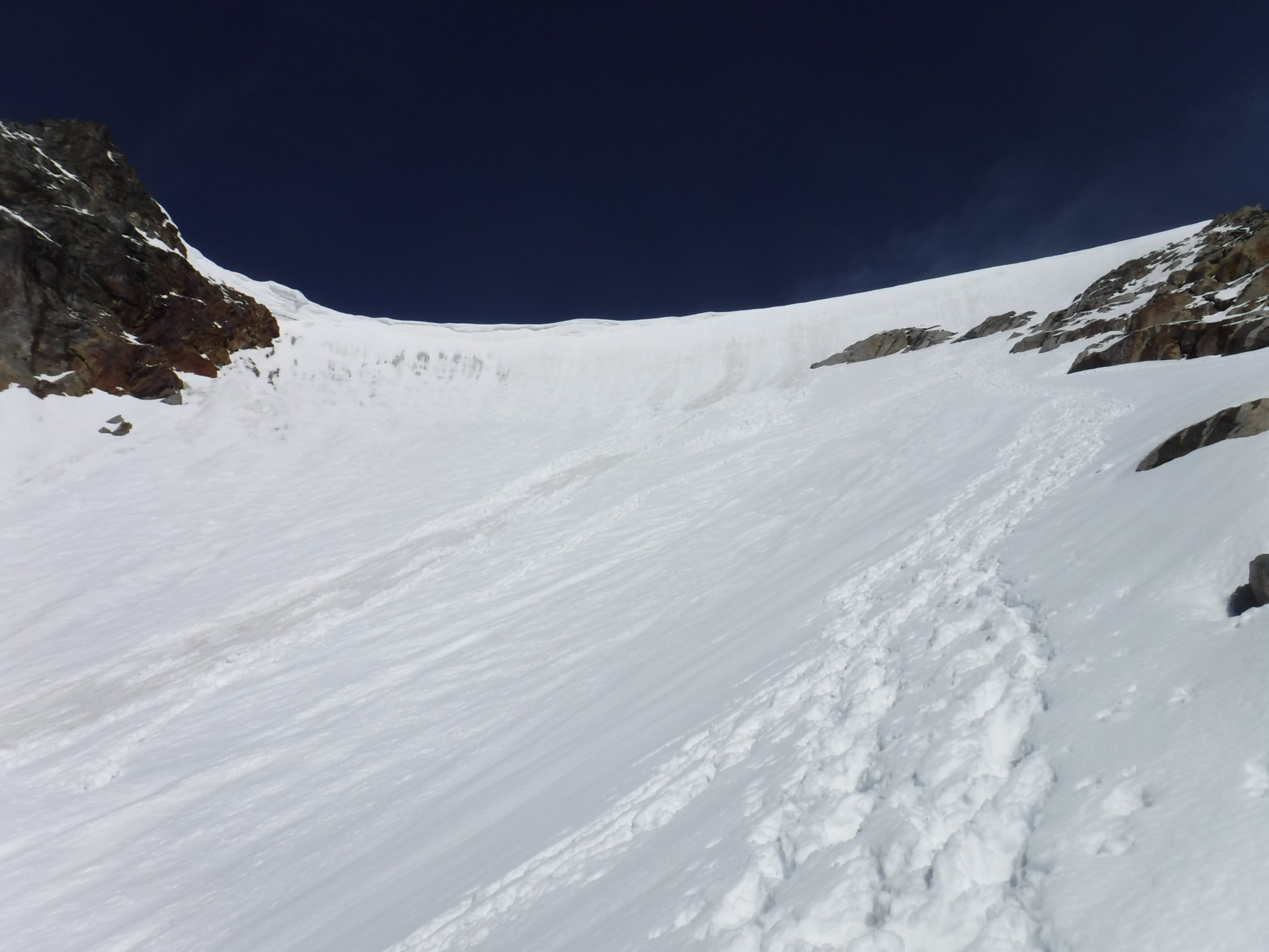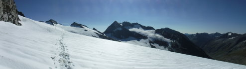 Tourenbeginn um 03:40 Uhr bei 7°C unter sternenklarem Himmel und fast bei Vollmond. Ab ca. 2800 m lag noch ca. 15 cm Neuschnee auf dem Gletscher. Gute Trittschneeverhältnisse, jedoch stellenweise rutschig auf dem Blankeis im Spurenbereich.