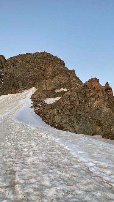 Unterhalb der Porta dÈs-cha liegt ein kleines Schneefeld, ansonsten alles trocken. Der Gletscher ist im unteren Bereich noch Schnee bedeckt und im oberen Bereich aper. Spalten sind zwei (kleine) offen, können aber gut umgangen werden. Übergang auf den Gletscher ohne Bergschrund. Die Schlüsselstelle unterhalb des Gipfels ist problemlos kletterbar.
