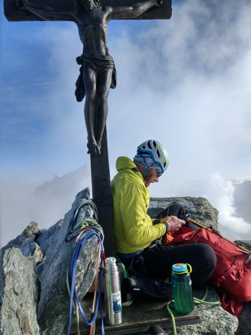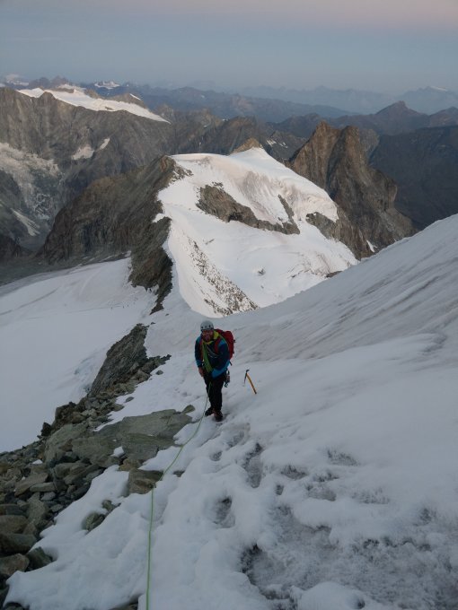 Überschreitung, Nordgrat im Aufstieg, Normalweg im Abstieg. Annähernd perfekte Verhältnisse. Auf der Arête du Blanc kann man der scharfen Firnschneide südlich ausweichen (siehe Foto), im Nordgrat liegen nur vereinzelte, griffige Schneereste und der Abstieg über die Normalroute ist bis zum ersten Firnabschnitt auf 3900m komplett schneefrei. In der Nacht hatte sich allerdings Raureif auf die Felsen gelegt, der in den südlichen und östlichen Exposition rasch verschwand, nördlich und westlich, wie etwa auf der Binerplatte, jedoch auch am Mittag die Felsen noch seifig überzog. Kletterten ab Ende Arête du Blanc alles ohne Steigeisen. Im Abstieg haben wir die Steigeisen bei den ersten Firnfeldern kurz montiert. Ab P. 3761 kann man sie aber bereits wieder ausziehen. Das Firnfeld südöstlich dieses Punktes ist im Moment nur noch ein brauner Fleck, der leicht umgangen werden kann und von Eseltschuggen-Rippe zum Wasserloch quert man auch nur noch Geröll.