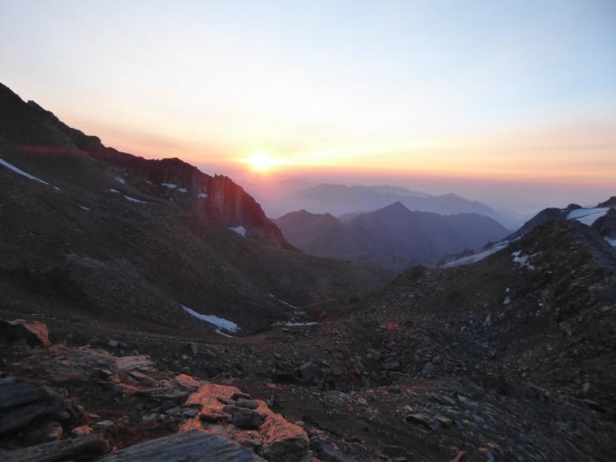 Das warme, windstille Herbstwetter hat heute optimale Bedingungen für diese Tour geschaffen. Just beim Sonnenaufgang waren wir am Zwischenbergpass, wo es links ab zum Südgrat geht. Das erste Gratstück hat Wegspuren über den ersten Gratteil (einen roten und weissen Turm umgehend), aber auch rechts neben dem Grat durch das Schotterfeld, wo man erst später einfach den Grat erreicht (einfach, als Normalroute zu empfehlen). Wer aber an dieser Verzweigung beim roten Turm bereits zum Grat aufsteigt und über den Grat geht, muss allerdings an einer steilen Stelle abklettern (ca. III). Hier wurde meistens gesichert, da von oben nicht einsehbar ist, wie gut man runterkommt. Es hat aber gute Griffe und Tritte. Der Weiterweg geht immer über den Grat, wunderbare Genusskletterei II (kann mit Varianten bis III gesteigert werden), selten ausgesetzt. Bei ca. 3900 kommt ein erstes Firnfeld, dann noch mal Felsen bis zum letzten Firngrat zum Gipfel.